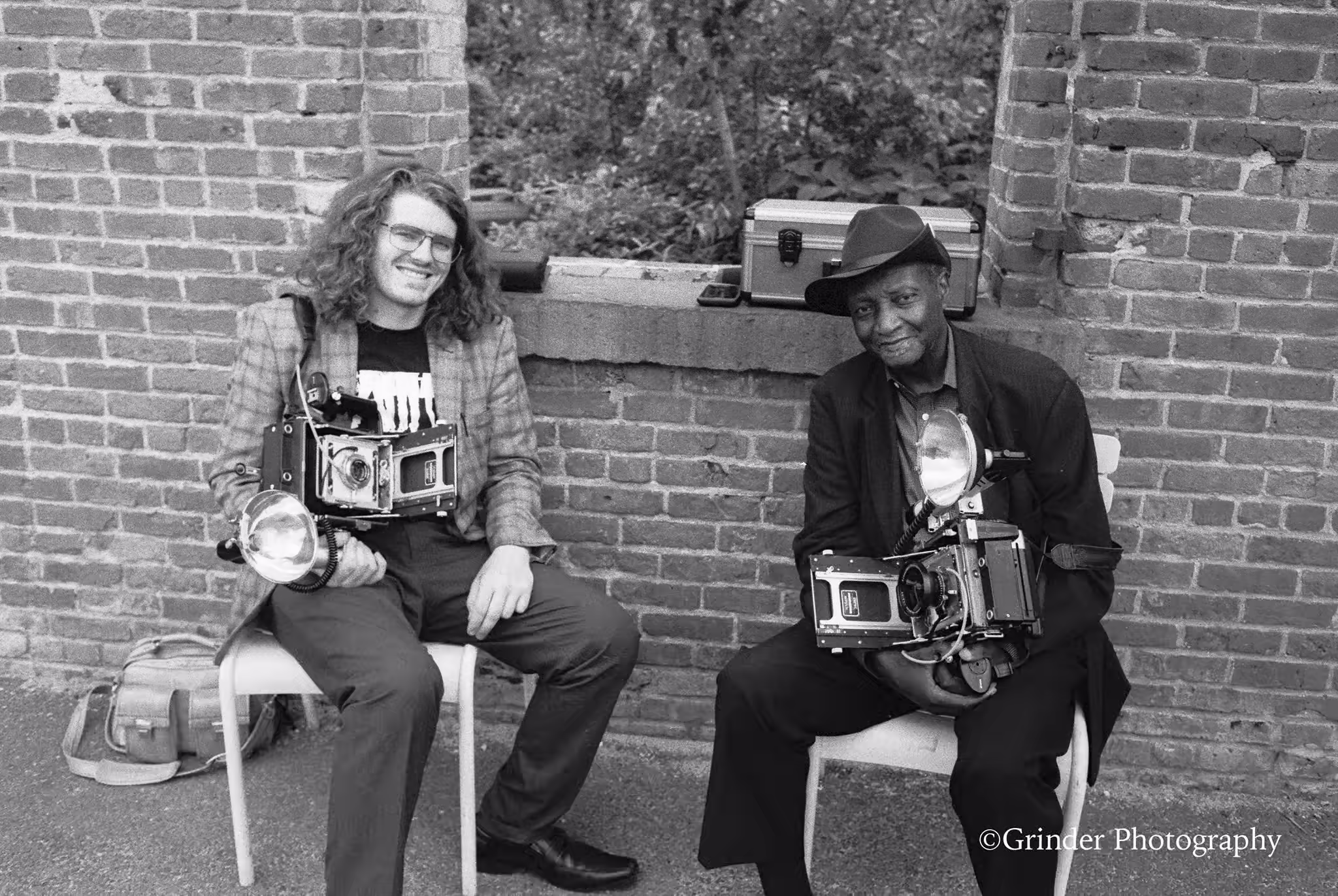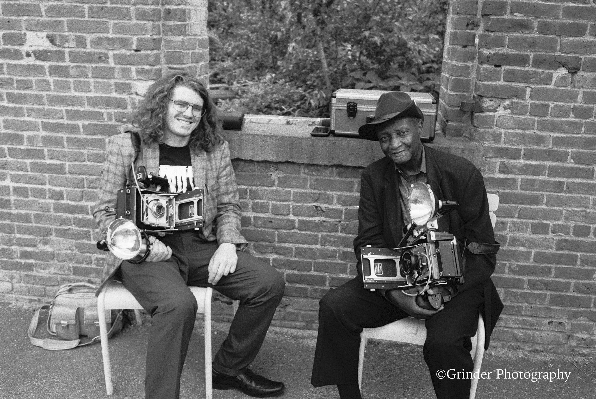 The photograph captures a moment between two individuals seated on white chairs against a brick wall. The person on the left is holding an old-fashioned camera with a large lens, dressed in a plaid jacket over a graphic t-shirt and dark pants. The individual on the right is wearing a dark suit and hat, also holding a vintage camera. Both appear to be engaged in conversation or contemplation. The setting suggests an outdoor location, possibly a park or courtyard, with a mix of natural and urban elements visible in the background. The black-and-white nature of the image adds a timeless quality to the scene, emphasizing the contrast between the subjects and their surroundings.