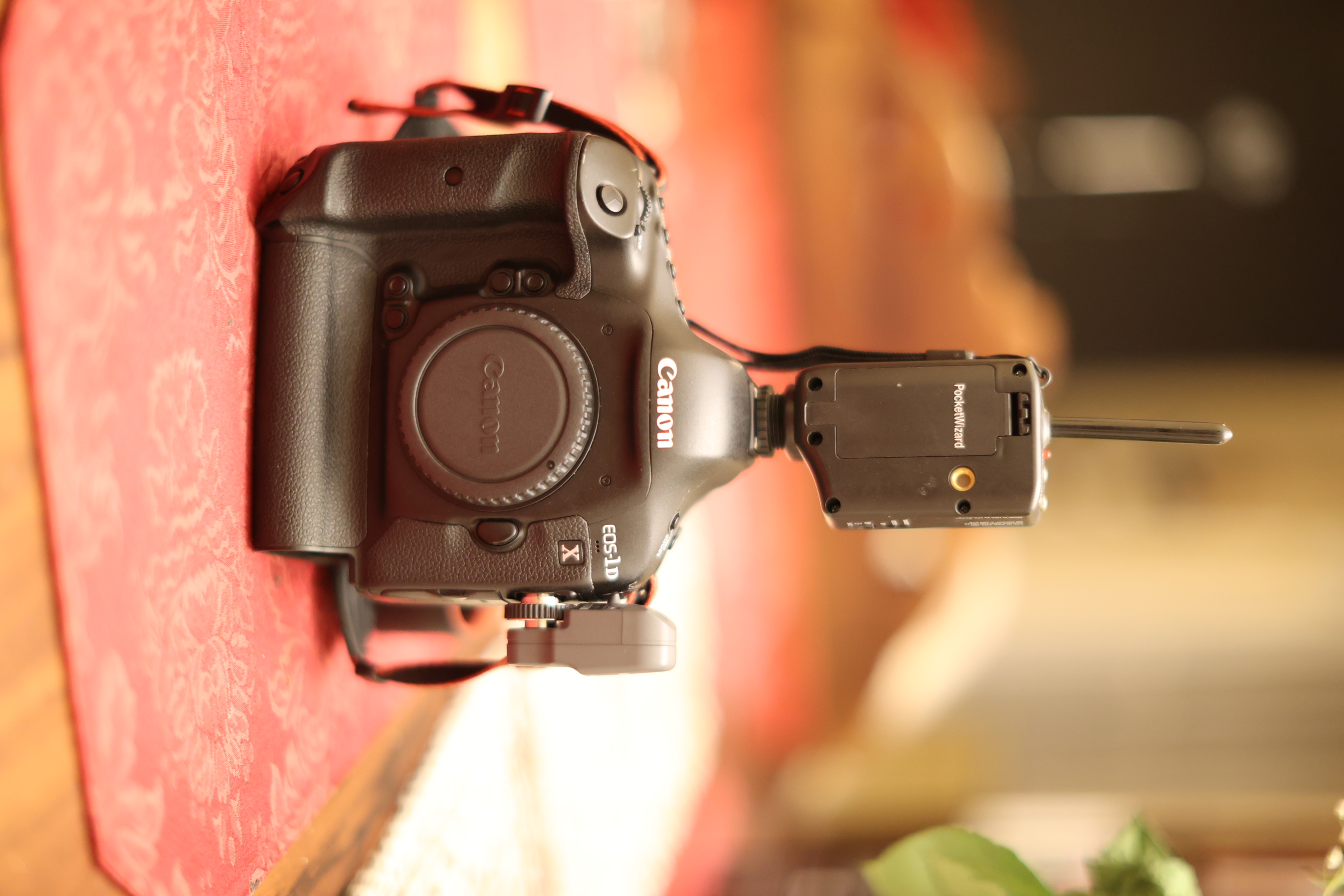 The photograph depicts a Canon EOS 1D camera placed on a red surface with a floral pattern. The camera is positioned upside down, revealing its back and side view. The background is blurred, suggesting a shallow depth of field, which draws attention to the camera. The lighting appears warm, casting a soft glow on the scene. Notable details include the camera's textured grip, the brand name "Canon" prominently displayed, and the small lens cap on the front. The overall mood is calm and focused, emphasizing the technical aspects of the camera.