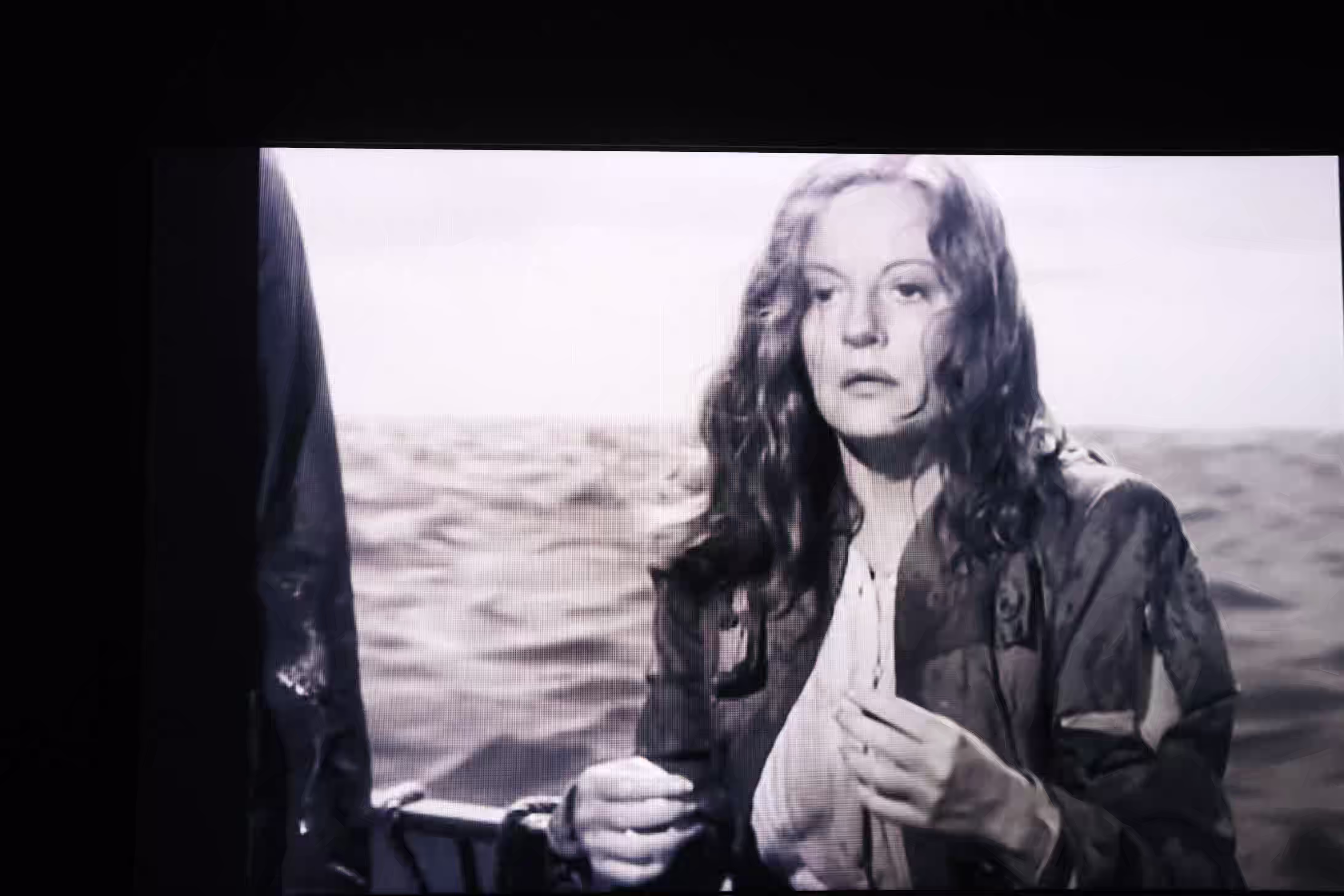 The photograph depicts a woman with long, wavy hair sitting on a boat, gazing out at the water. The scene is set against a backdrop of calm, rippling water, suggesting a serene and contemplative atmosphere. The woman is dressed in a dark jacket with patches and a light-colored shirt underneath, giving her a somewhat rugged appearance. The overall mood of the image is introspective and peaceful, with muted tones that evoke a sense of quiet reflection. Notable details include the woman's thoughtful expression and the gentle movement of the water around her, which adds to the tranquil ambiance of the scene.