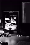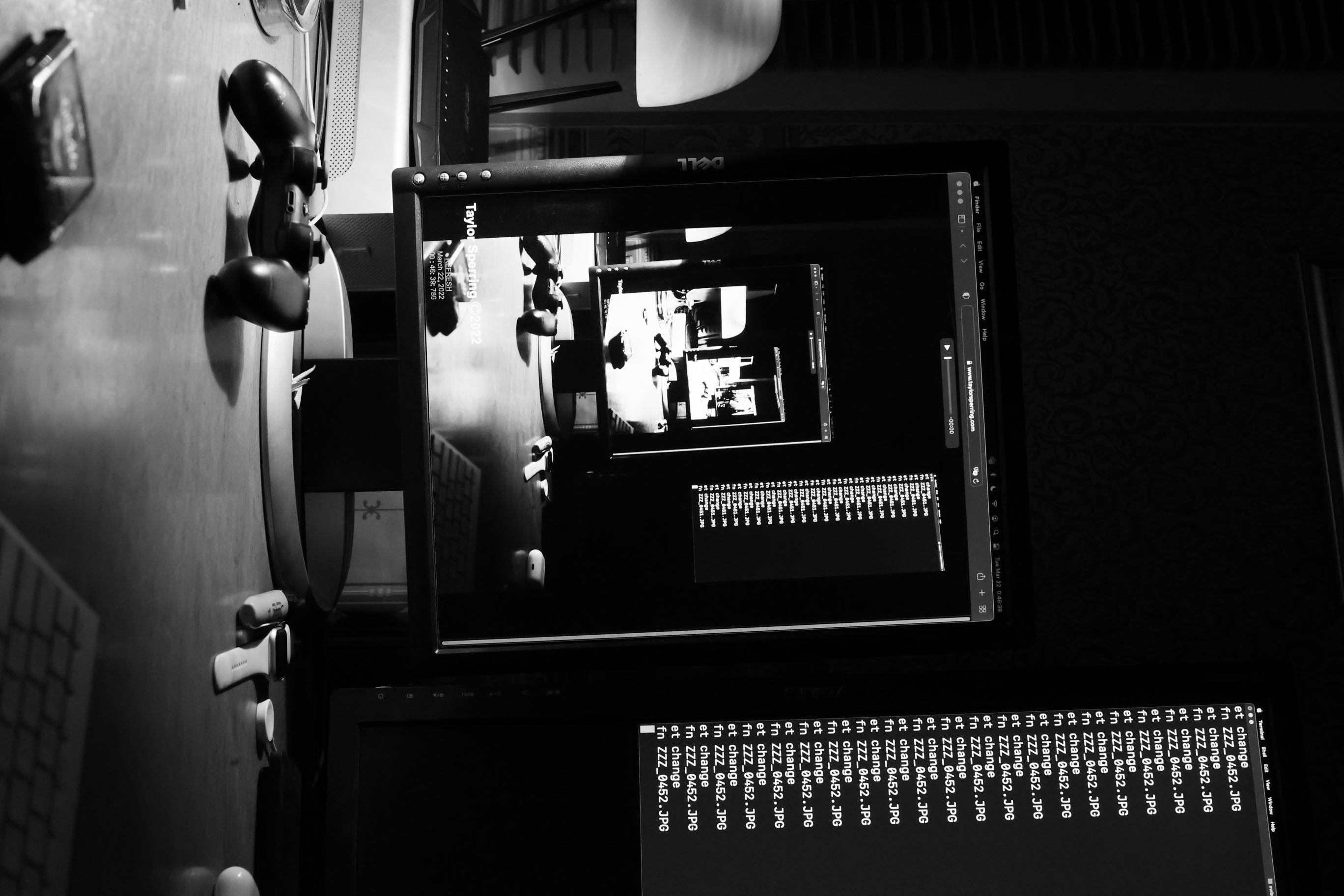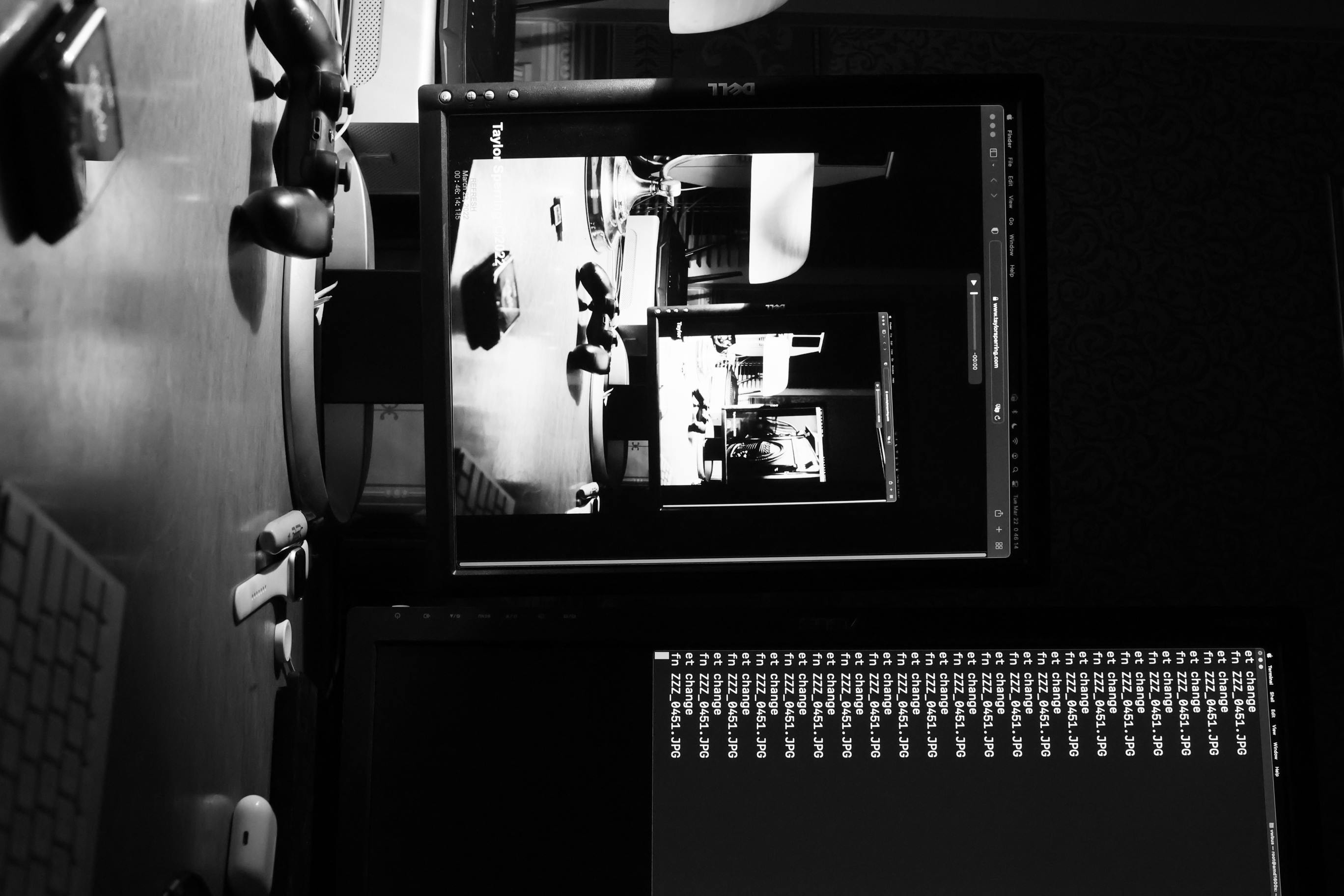 The photograph depicts a black-and-white scene of a computer workstation from an overhead perspective. The central focus is a Dell monitor displaying a video editing software interface with a small window showing a person working on a laptop. The workspace includes a keyboard, mouse, and a pair of headphones resting on the desk. The overall mood is focused and professional, with the monochromatic tones adding a sense of seriousness to the environment. Notable objects include the Dell monitor, the video editing software, the keyboard, mouse, headphones, and the small window showing the person working on the laptop.