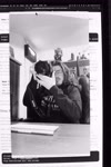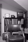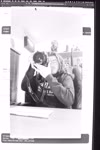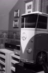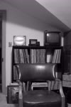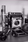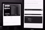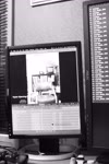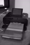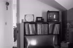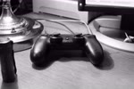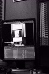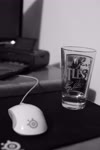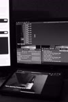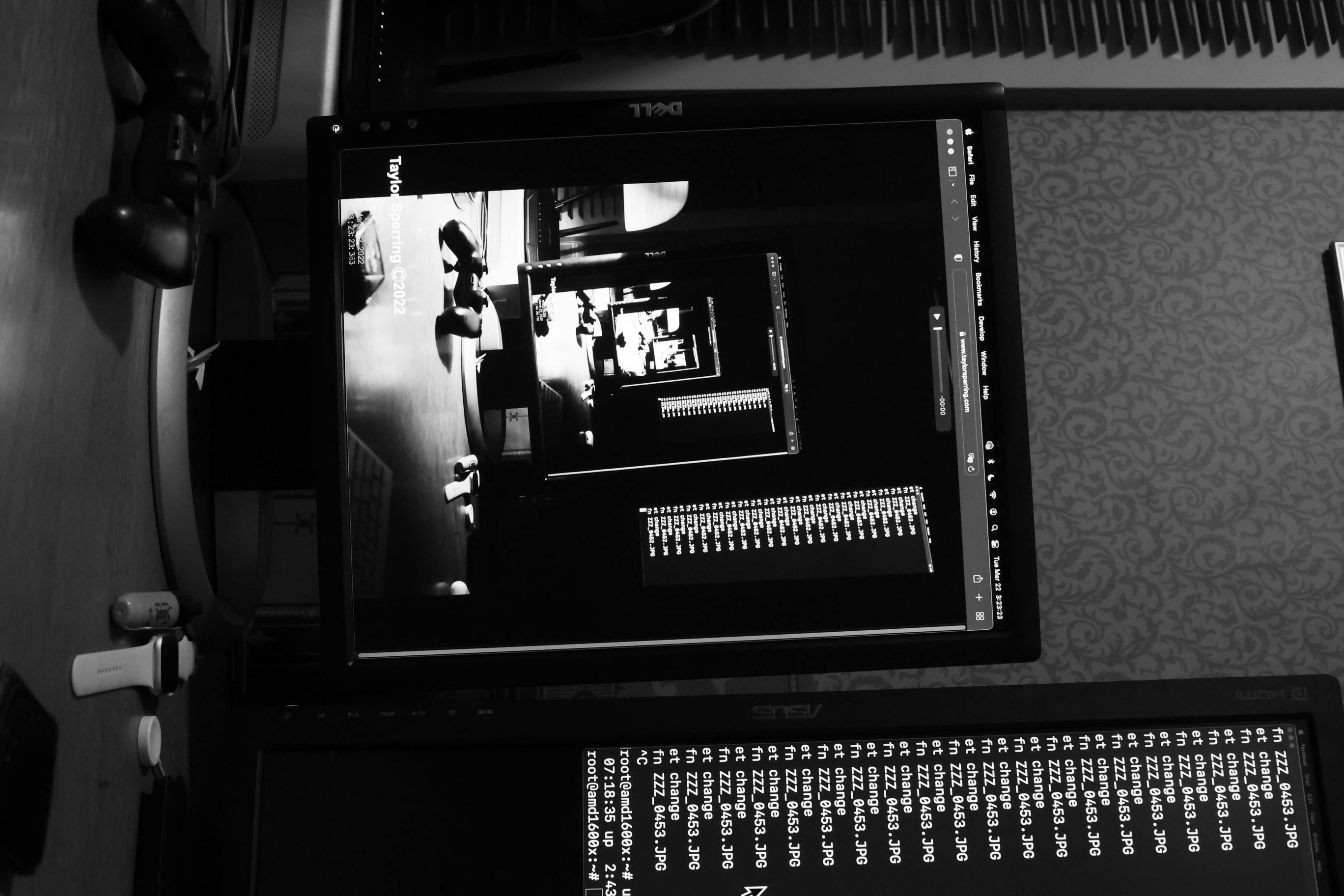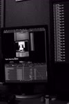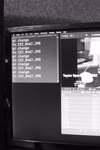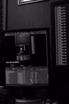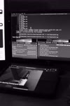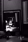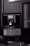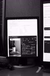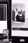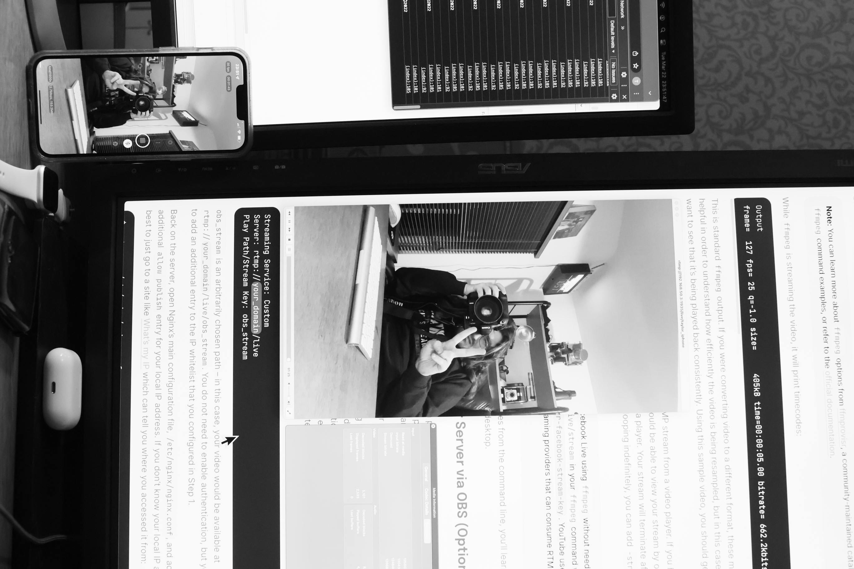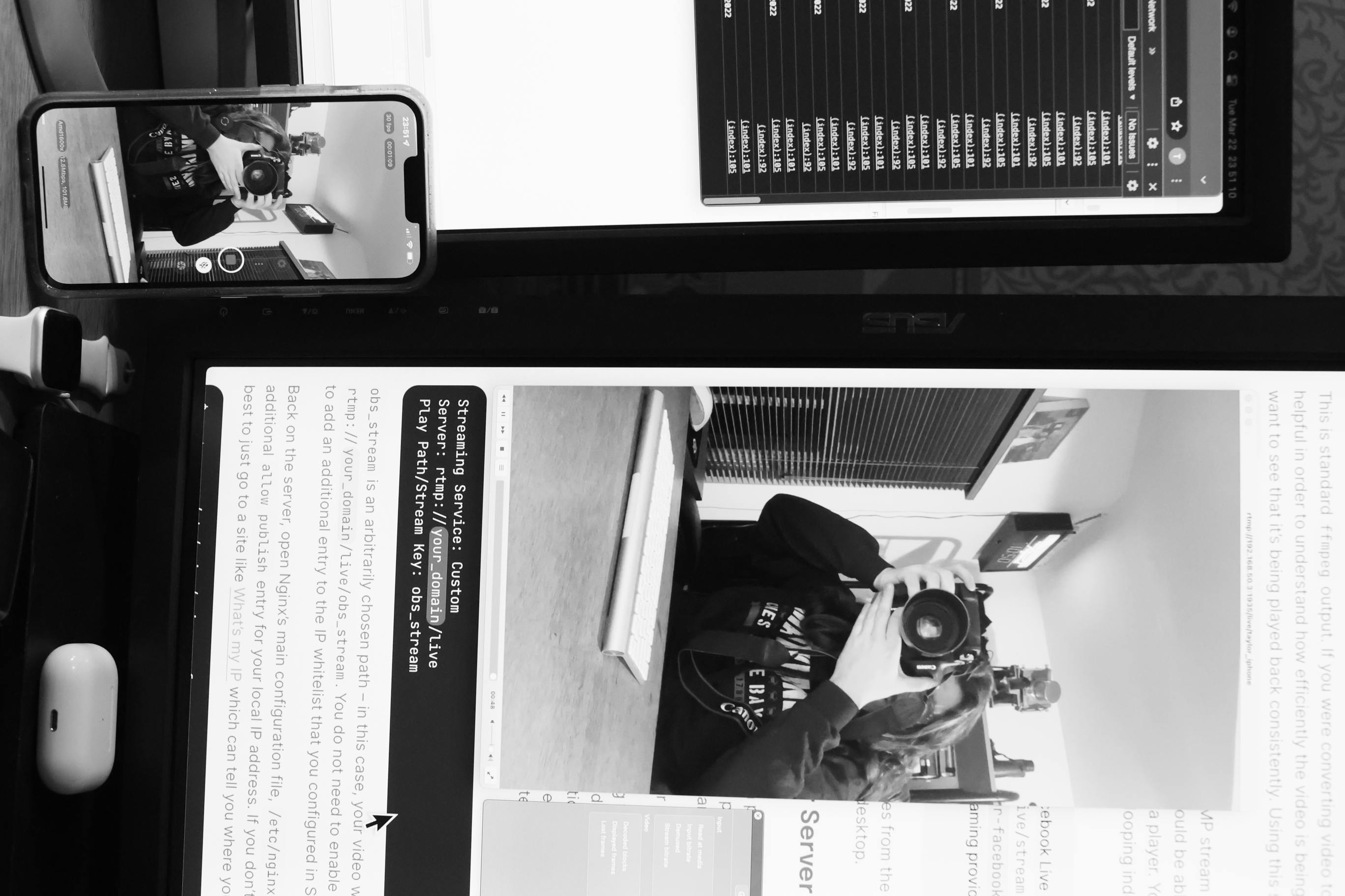 The photograph depicts a black-and-white scene of a person sitting at a desk with a laptop open in front of them. The laptop screen shows a video editing software interface, likely OBS Studio, with various settings and options visible. To the left of the laptop, there is a smartphone displaying a live stream of the same person, suggesting they are recording themselves. The person appears to be engaged in some form of video production or streaming activity. The desk also has a computer mouse and a keyboard, indicating a workspace setup. The overall mood of the image is focused and technical, emphasizing the process of video creation or broadcasting.