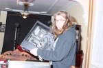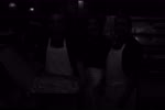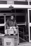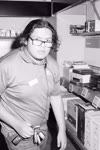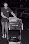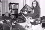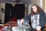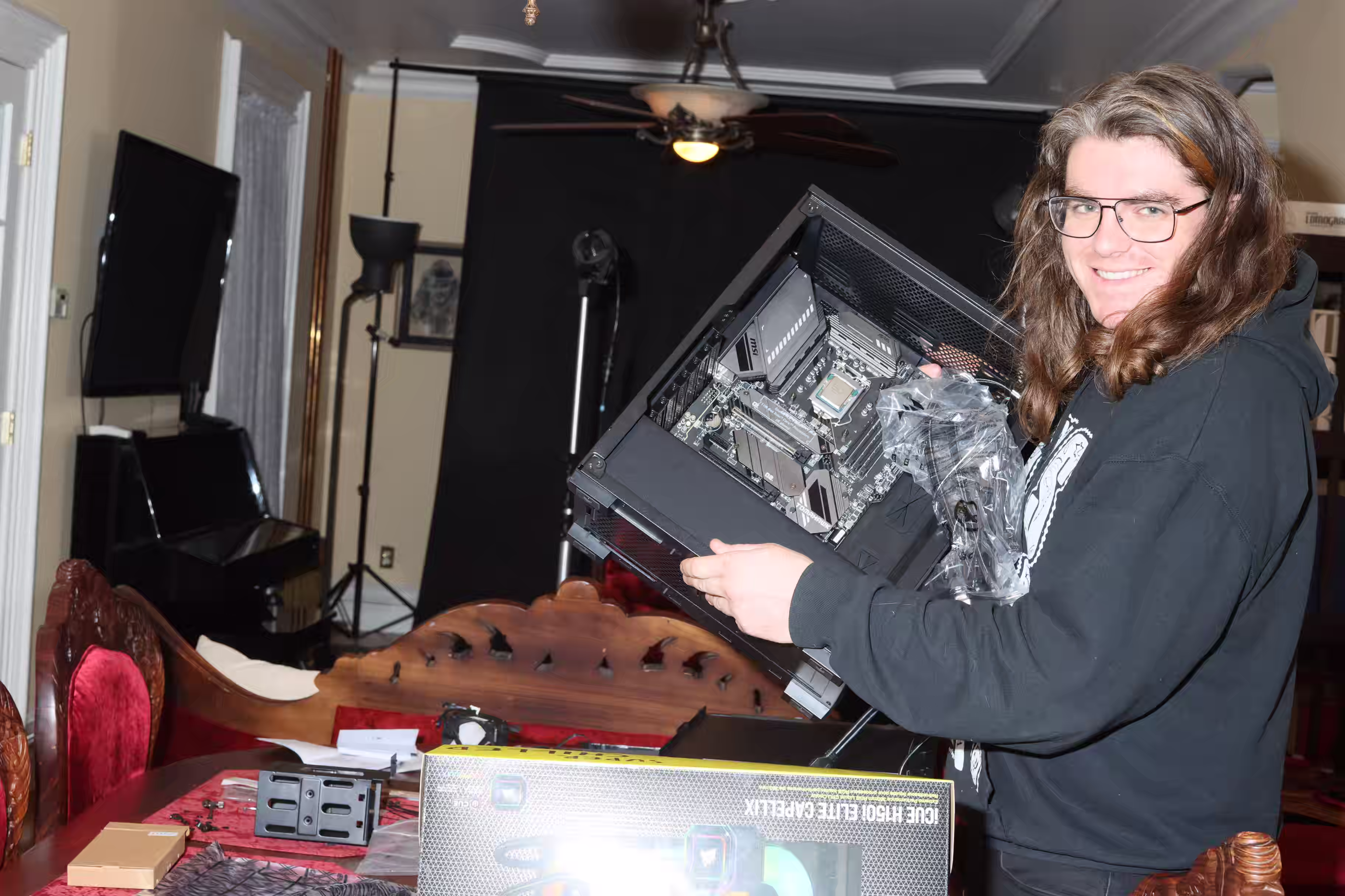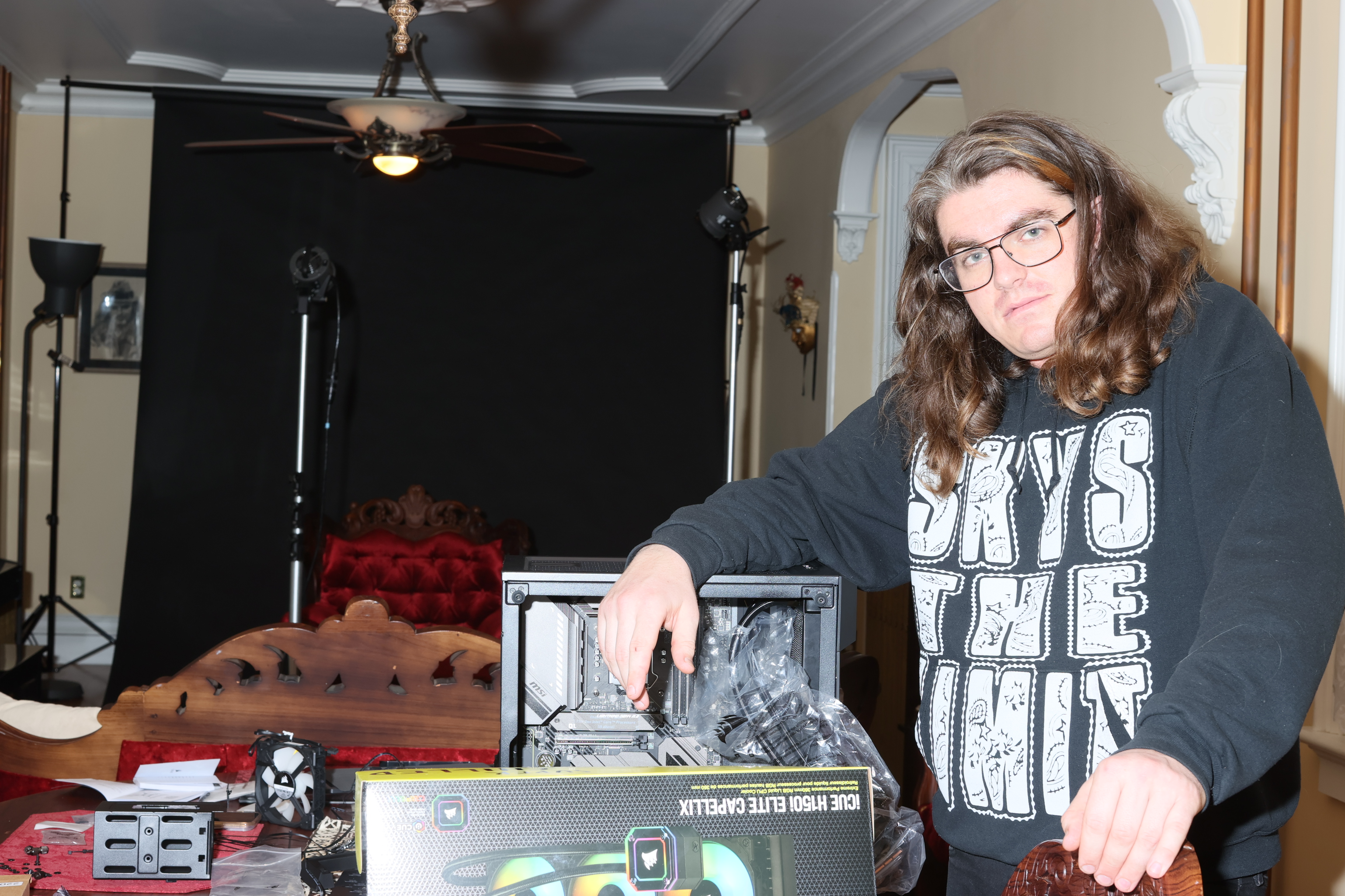 The photograph depicts a person standing in what appears to be a home office or studio setup. The individual is wearing glasses and a dark sweatshirt with white text that reads "SKYS THE LIMIT." They are leaning on a black computer case, which is open and placed on a table. The table also holds a box labeled "iCUE H150I LITE CAPTIVX," suggesting it contains a gaming component. The background features a black backdrop, a wooden chair with red cushions, and various lighting equipment, including a floor lamp and a ceiling fan with lights. The overall mood of the image is casual and focused, likely indicating a moment of work or preparation for a video recording or gaming session.