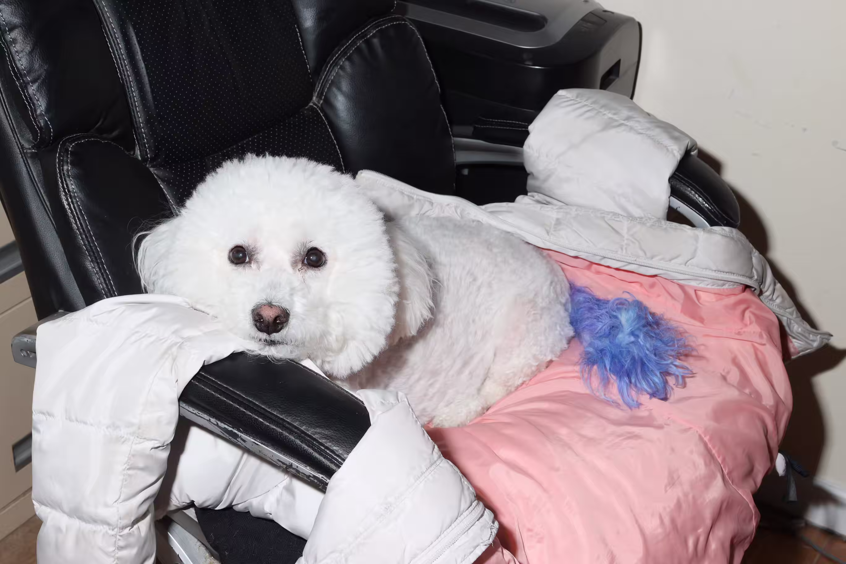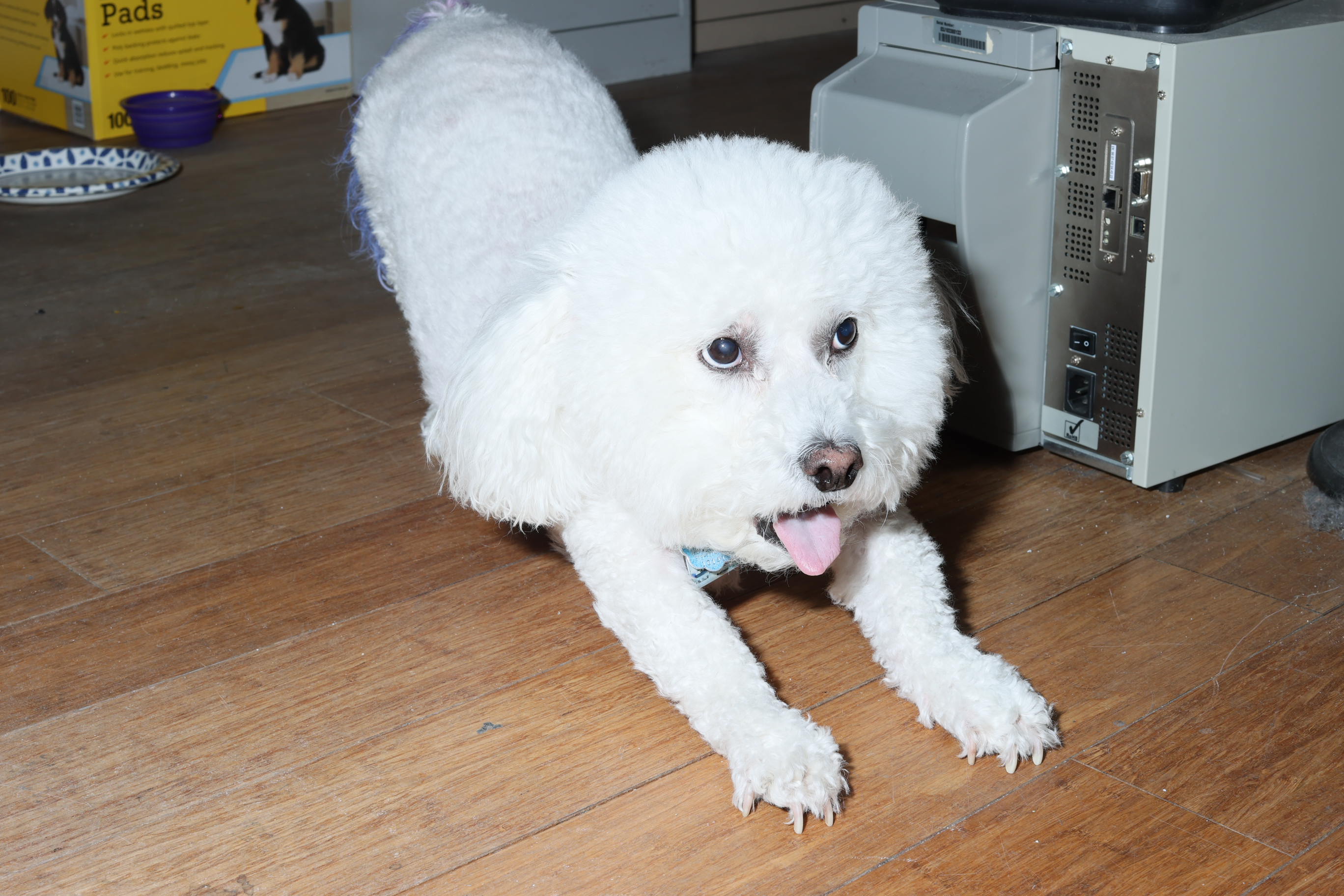 The photograph captures a small, fluffy white dog with a curly tail, lying on a wooden floor. The dog appears to be in a playful or relaxed state, with its tongue out and eyes wide open. In the background, there is a computer monitor and a box of pads, suggesting that the scene might be taking place in a home office or living room. The overall mood of the image is casual and light-hearted, with the dog's expressive face adding a touch of charm to the scene. The colors are warm and natural, with the brown wooden floor contrasting nicely against the white fur of the dog.