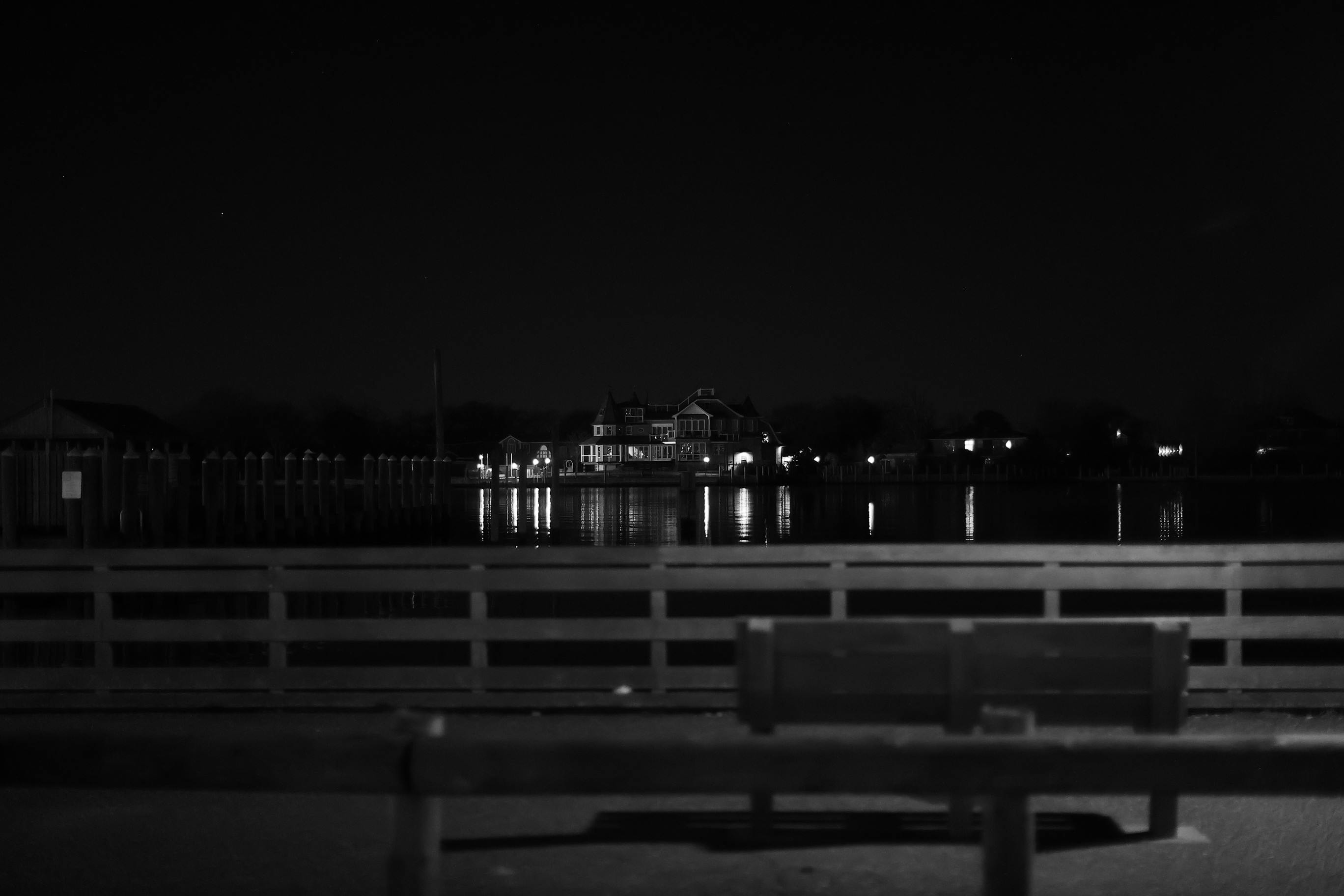 A serene nighttime scene at a dock with illuminated houses across the water, casting reflections on the calm surface below an expansive dark sky. The tranquil atmosphere evokes a sense of peaceful solitude as the wooden bench invites viewers to imagine themselves sitting there, lost in thought under the starlit night.