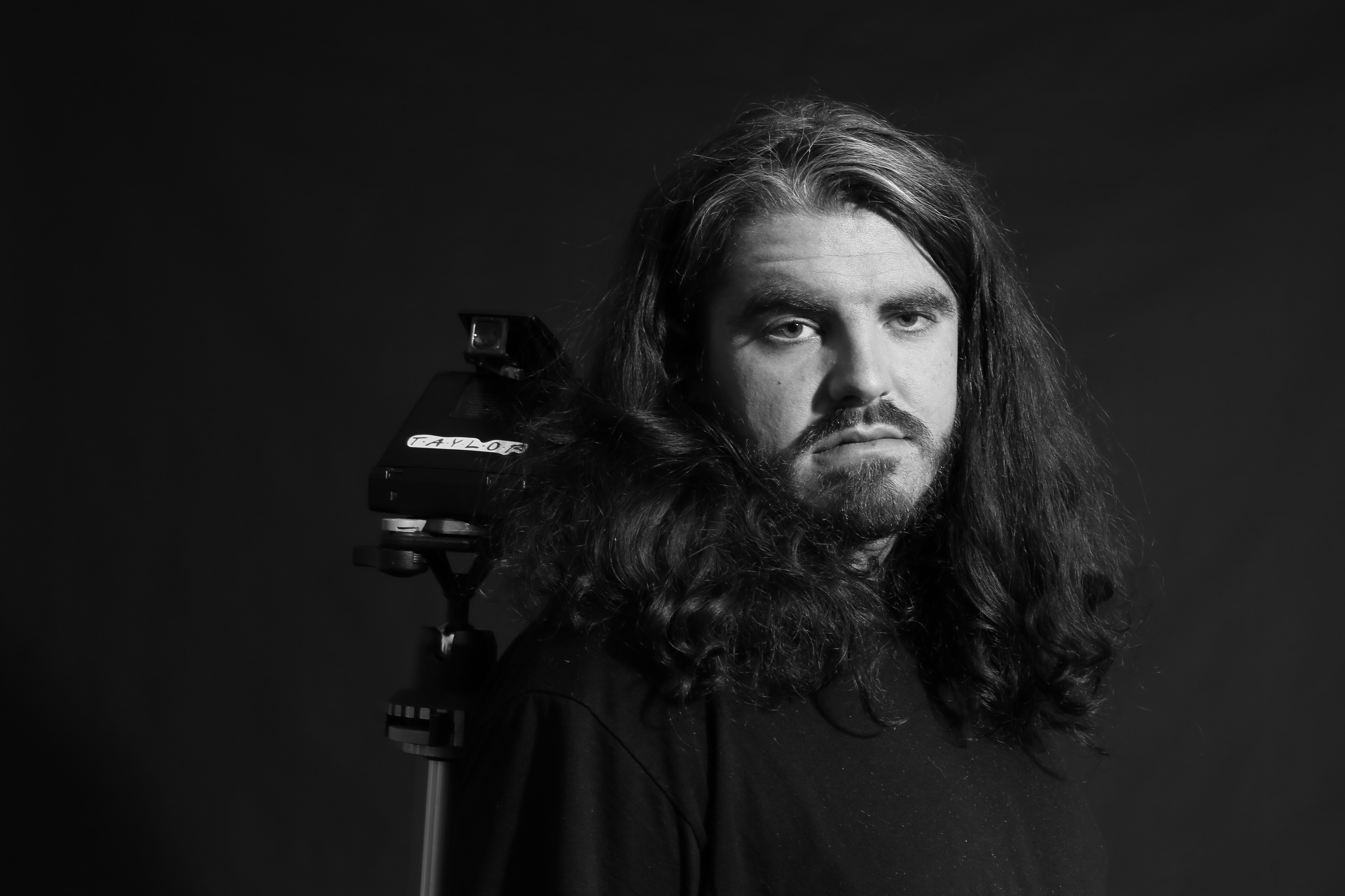 A person with long hair stands behind a camera mounted on a tripod against a dark background, exuding an air of mystery and contemplation.