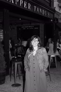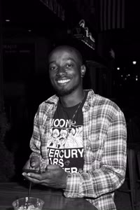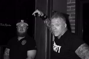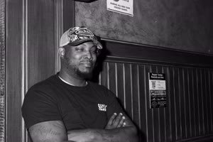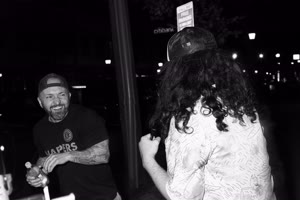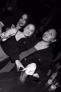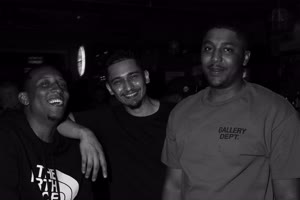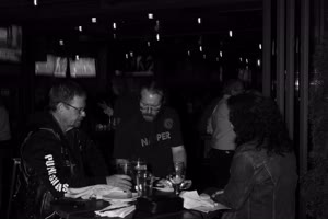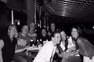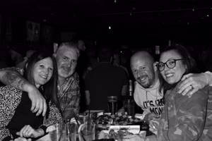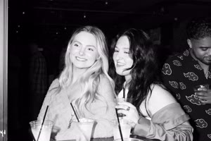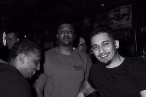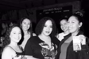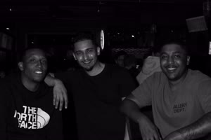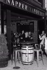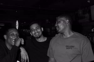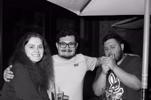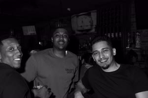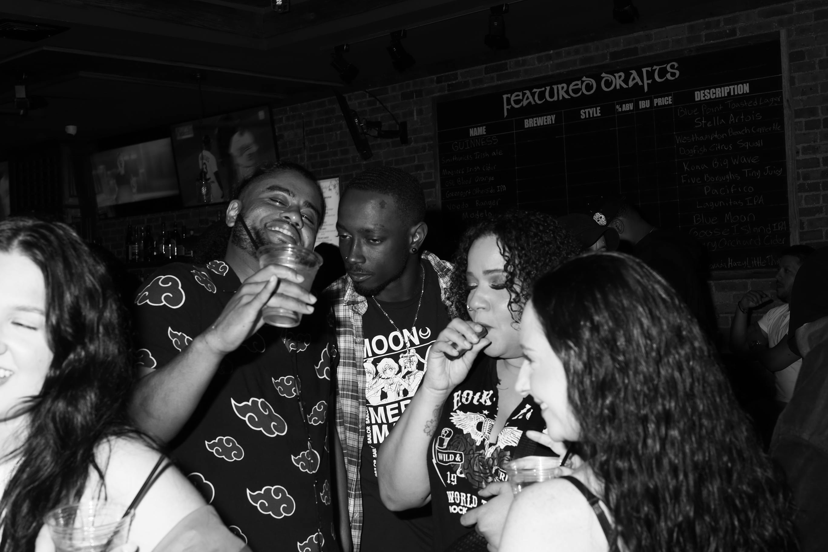 A lively bar scene captures a group of friends enjoying drinks together; some hold cups while others sip from bottles. The atmosphere feels casual yet intimate with brick walls adorned with a chalkboard listing featured drafts behind them.