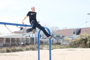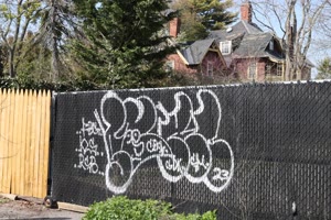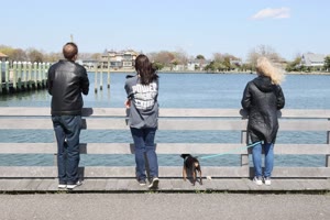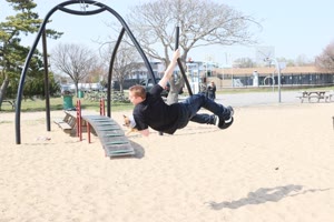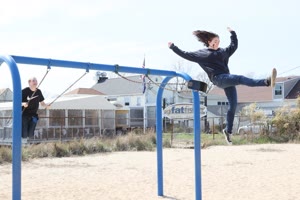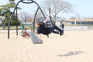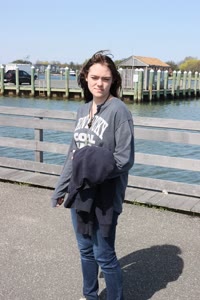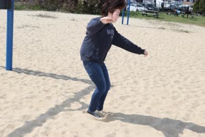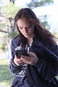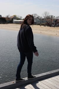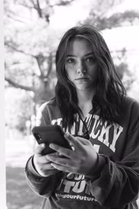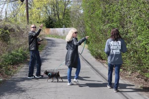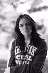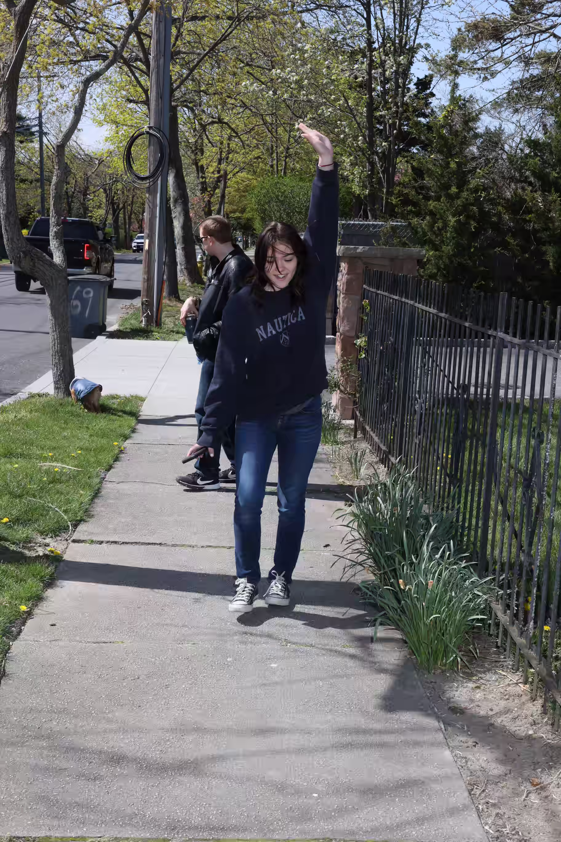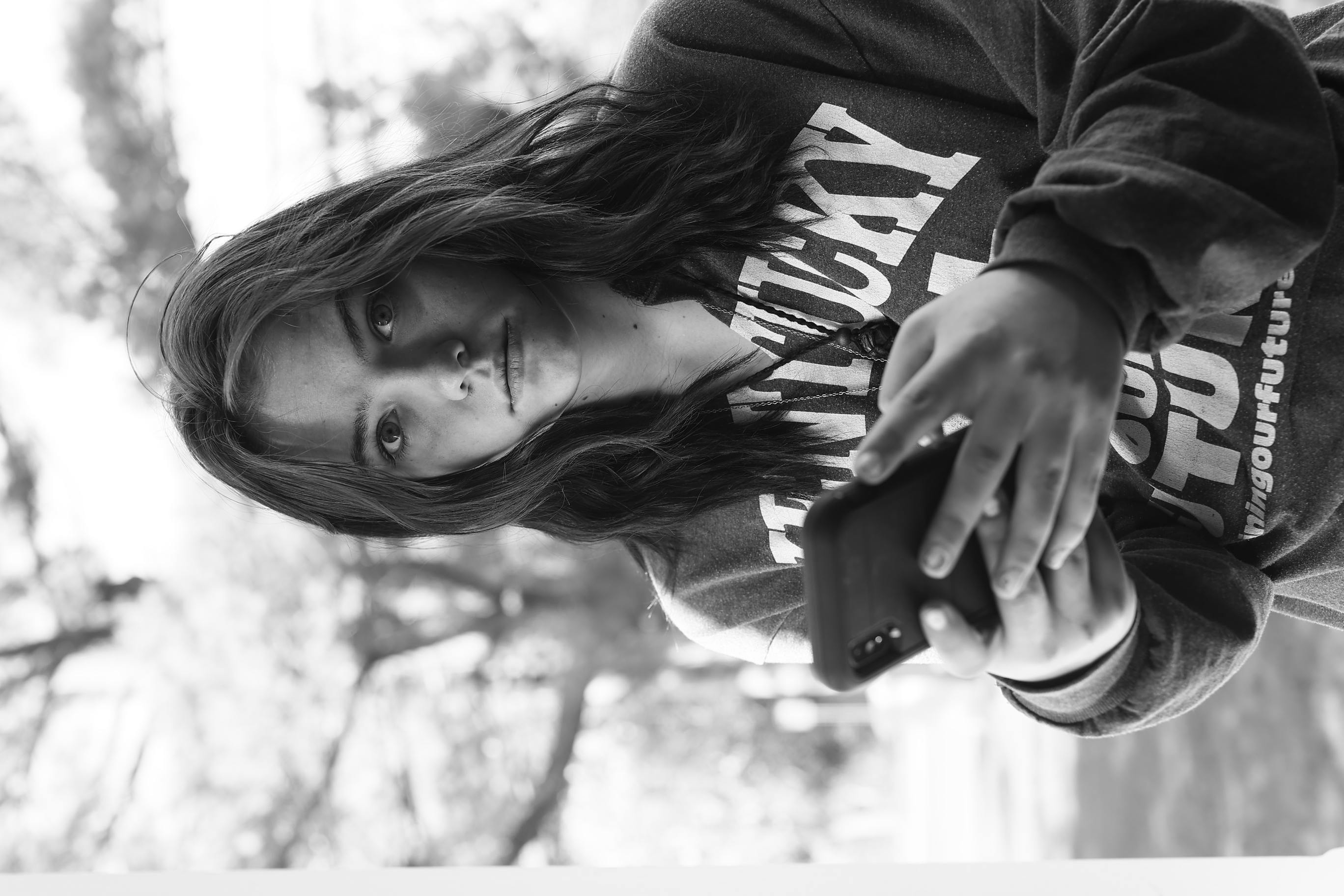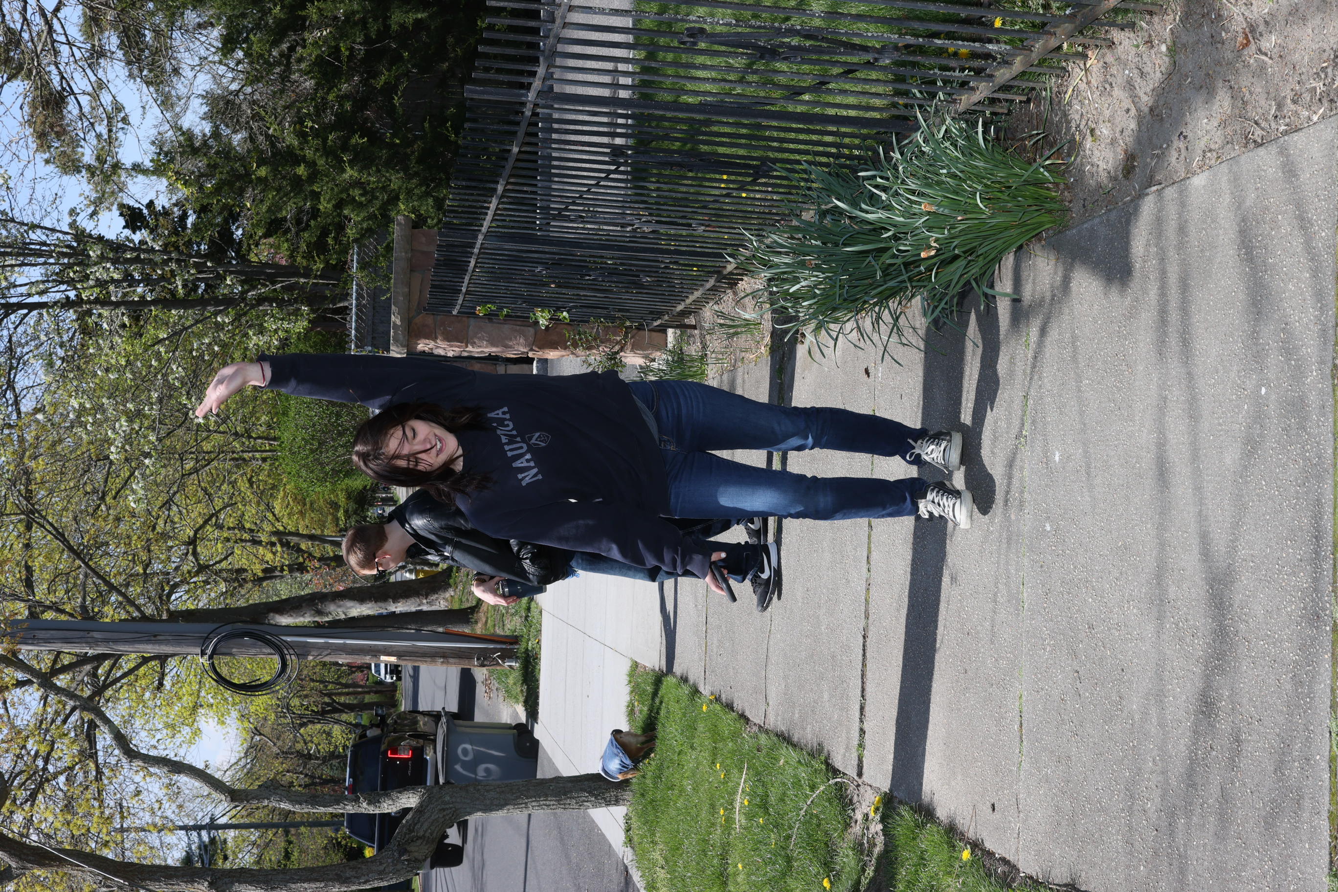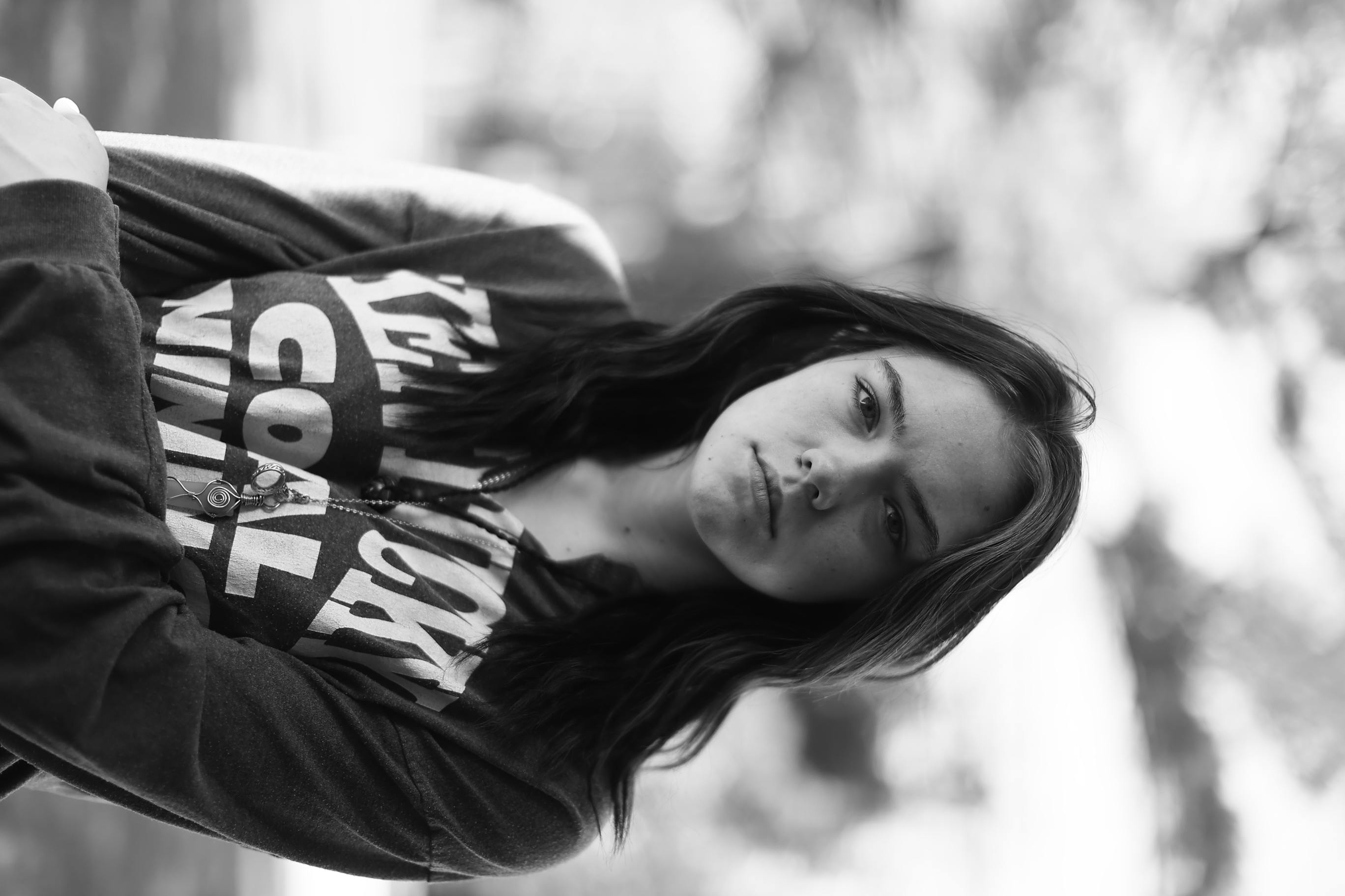 Tami stands outdoors with her arms crossed over her chest, wearing a dark hoodie that reads "COMMUNITY" backwards. The background features blurred trees, suggesting an outdoor setting like a park or forested area.