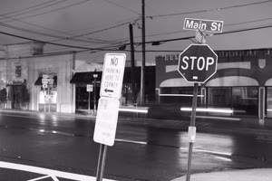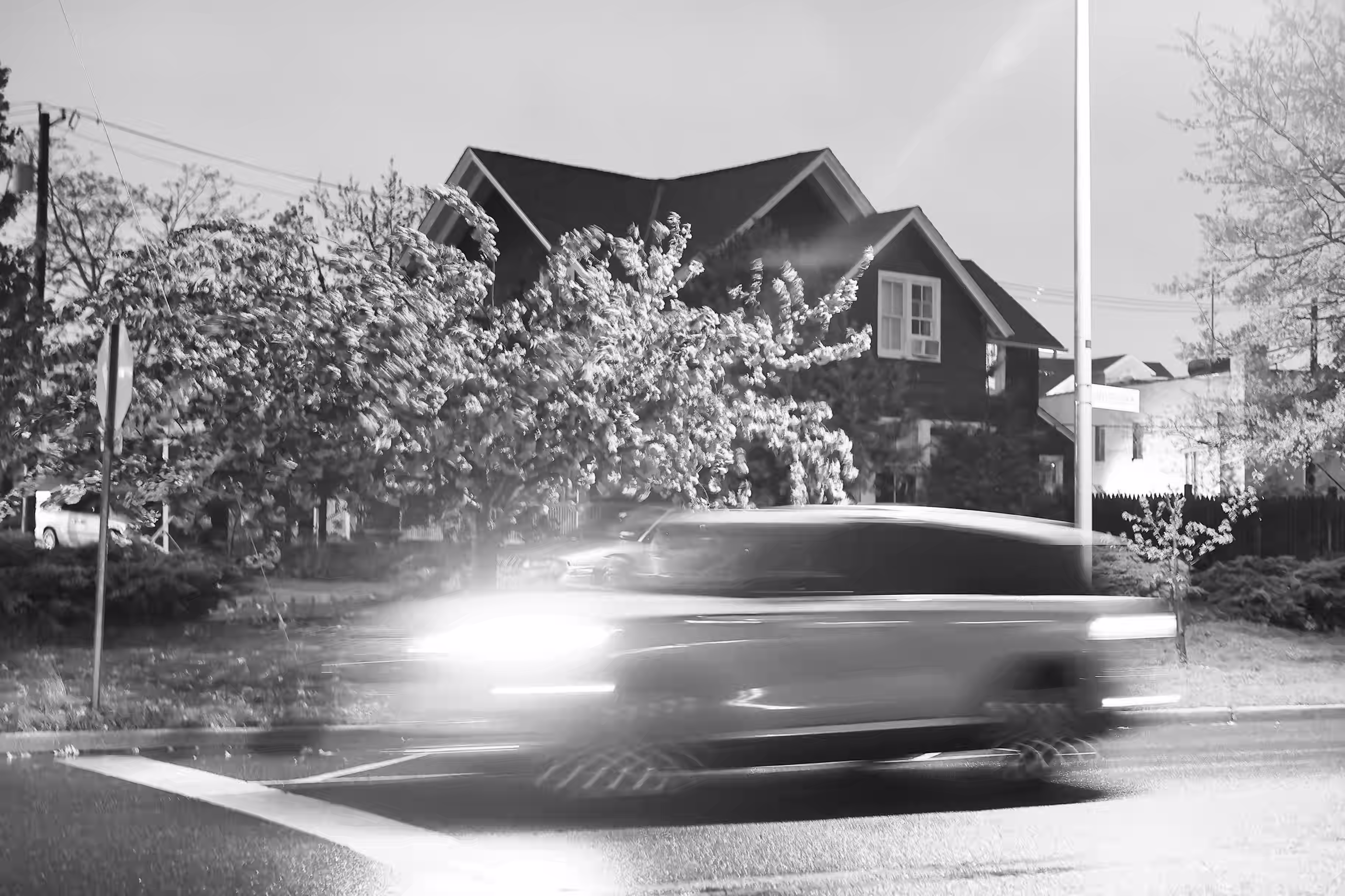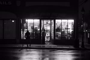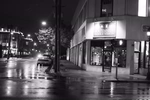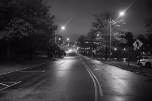 A dark street at night with trees lining both sides, illuminated only by distant lights from buildings ahead. The scene exudes an eerie atmosphere as cars drive down the road under the glow of sparse streetlights.