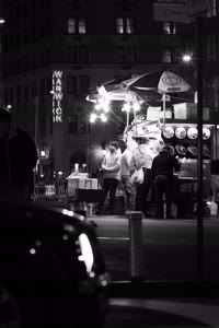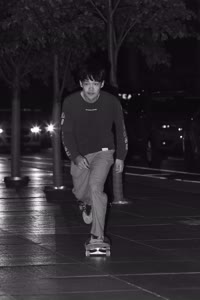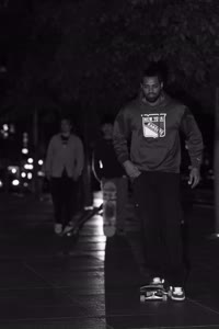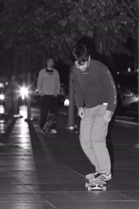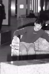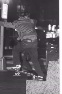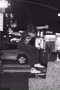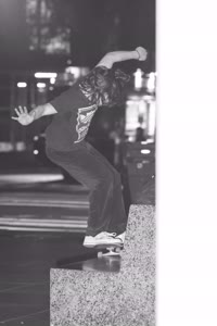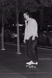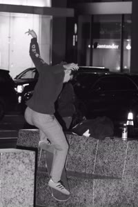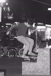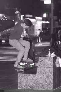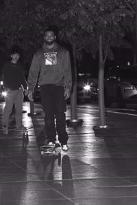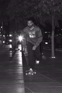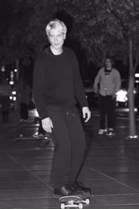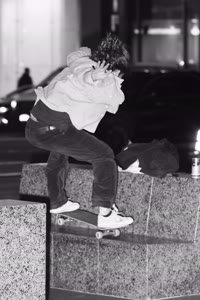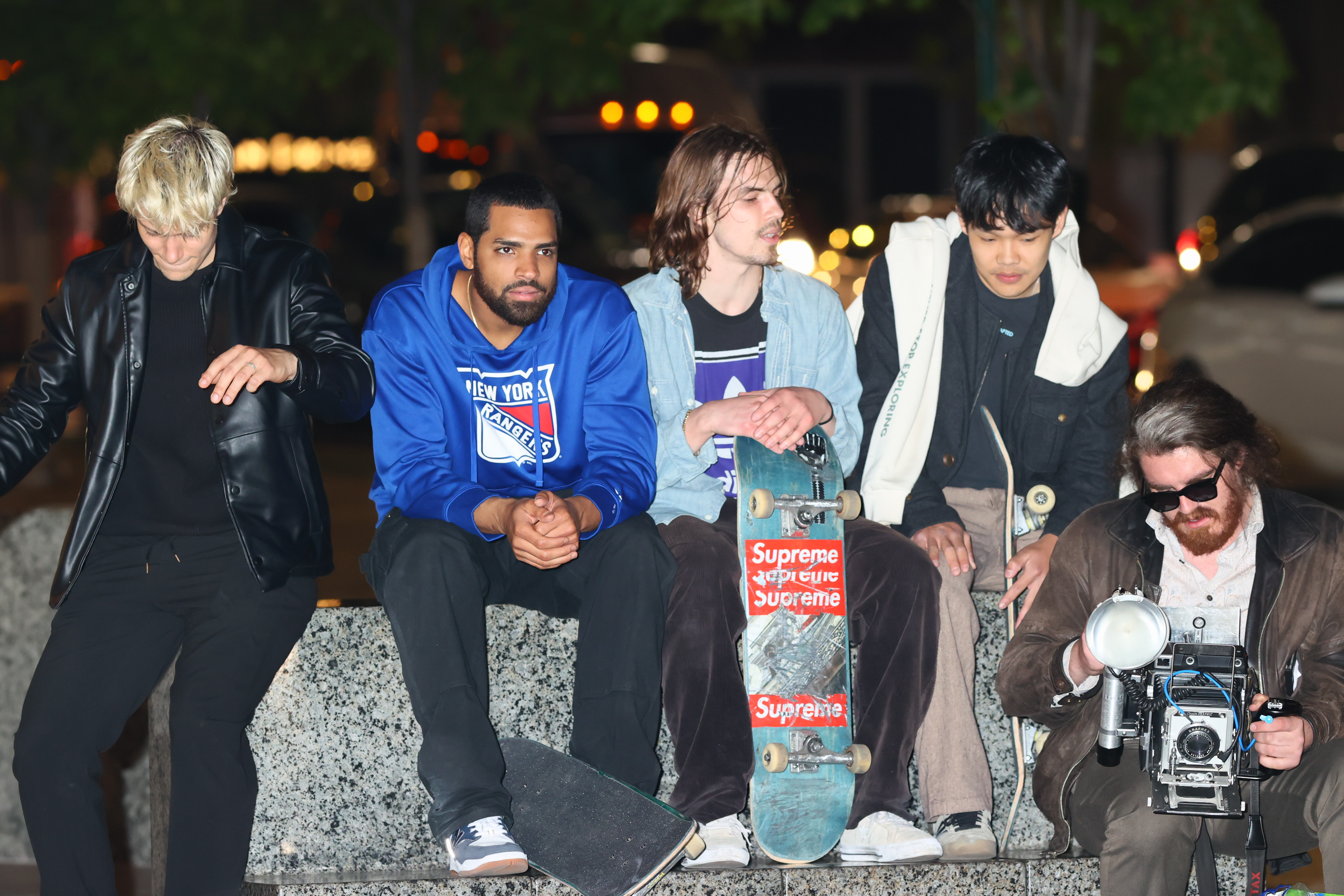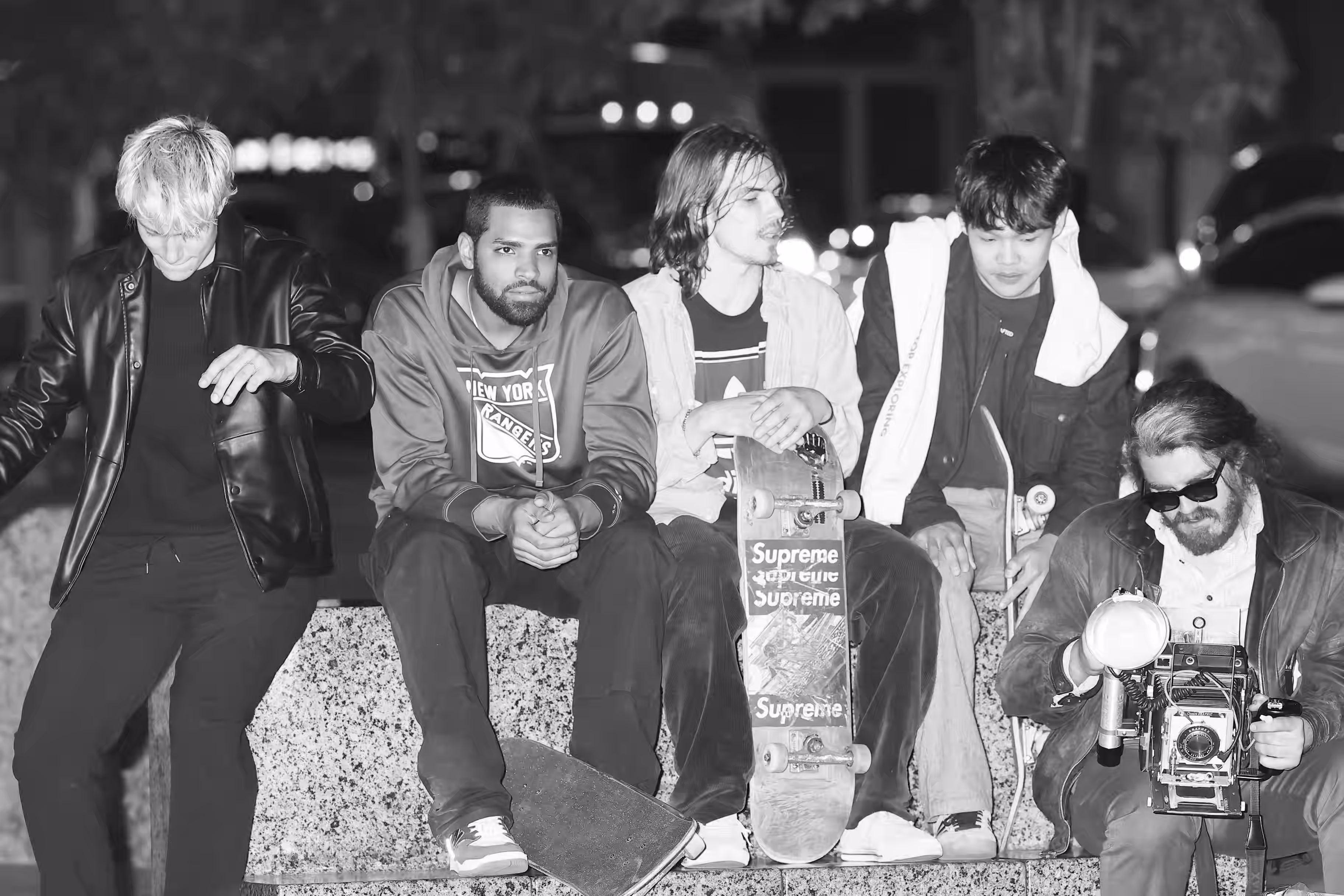 Taylor sits with his friends at night near a streetlight, holding up their Supreme skateboards while another friend films them using an old-fashioned camera. The group appears relaxed but focused as they prepare to hit the streets after a long day indoors.