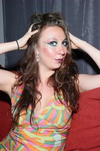 SCENEA woman with vibrant makeup lies on her back against a red couch, wearing an eye-catching dress adorned with colorful geometric patterns. The scene exudes a playful yet mysterious atmosphere.