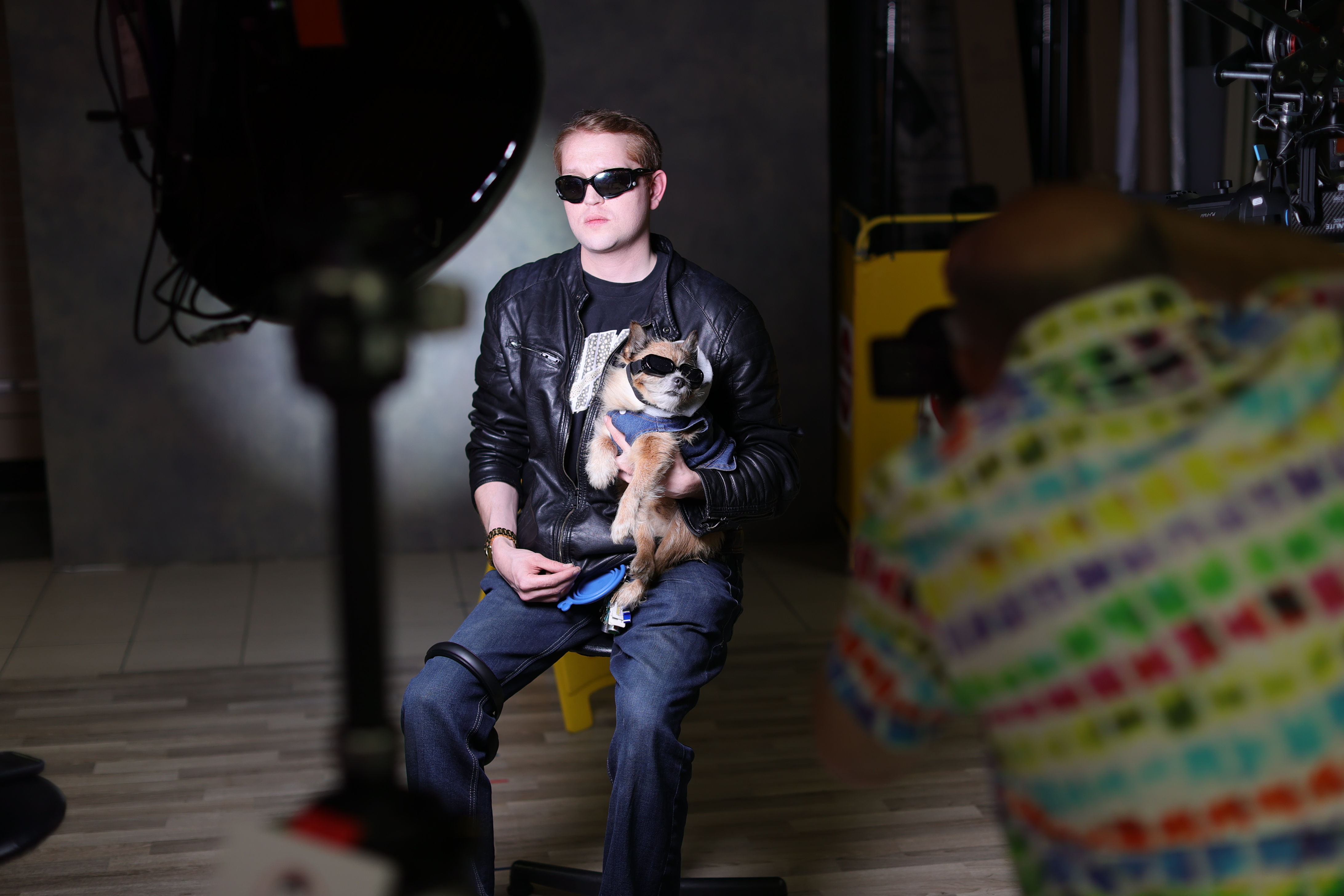Bradley sits confidently with sunglasses perched atop his head while holding a small dog also wearing sunglasses. The scene captures an intriguing moment between human and canine amidst professional photography equipment.