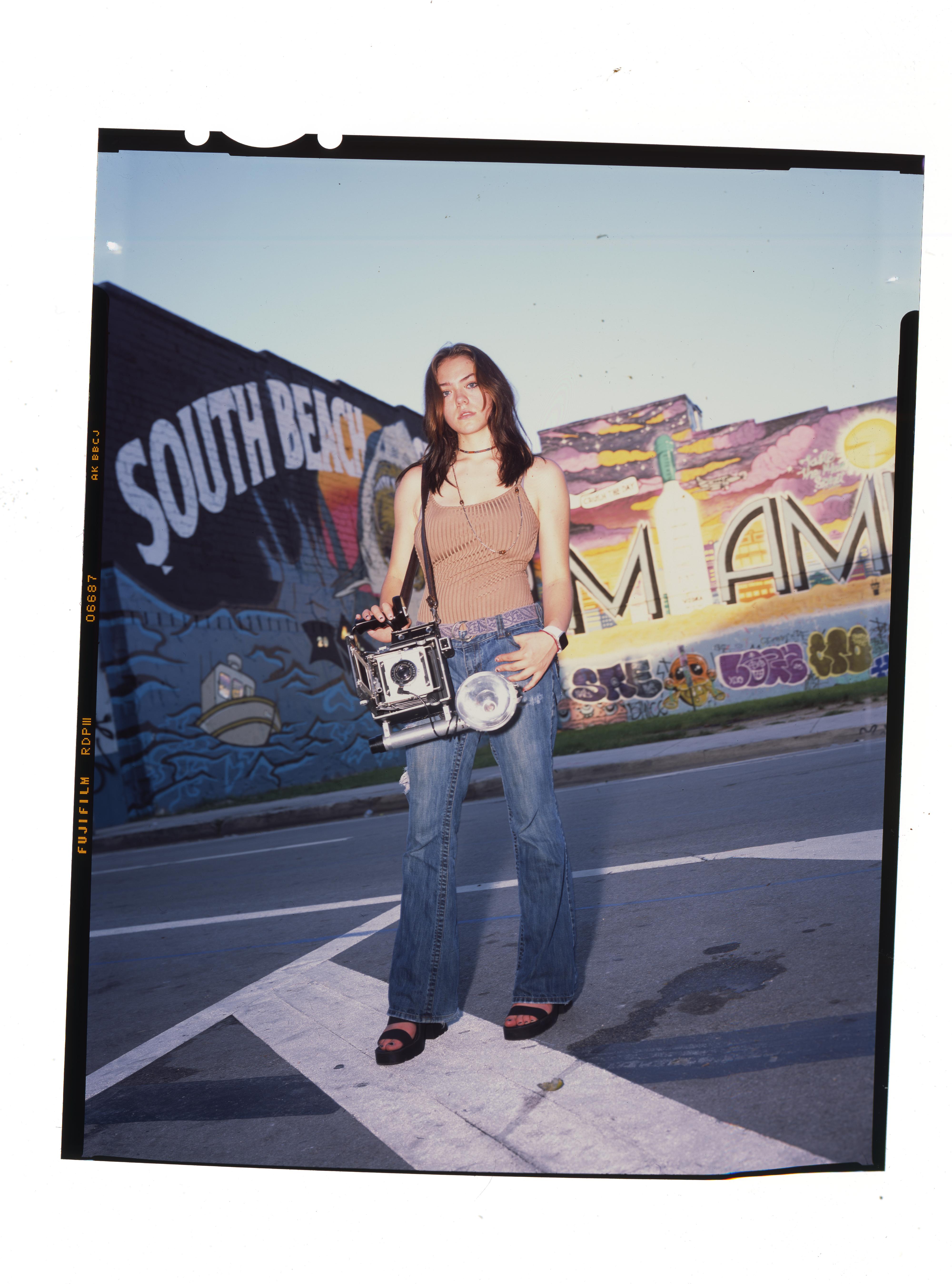 SCENEA young woman stands confidently with her vintage camera against an urban backdrop featuring vibrant graffiti art that reads "South Beach Miami." Her outfit includes a sleeveless top and flared jeans, complemented by black sandals and a choker necklace.