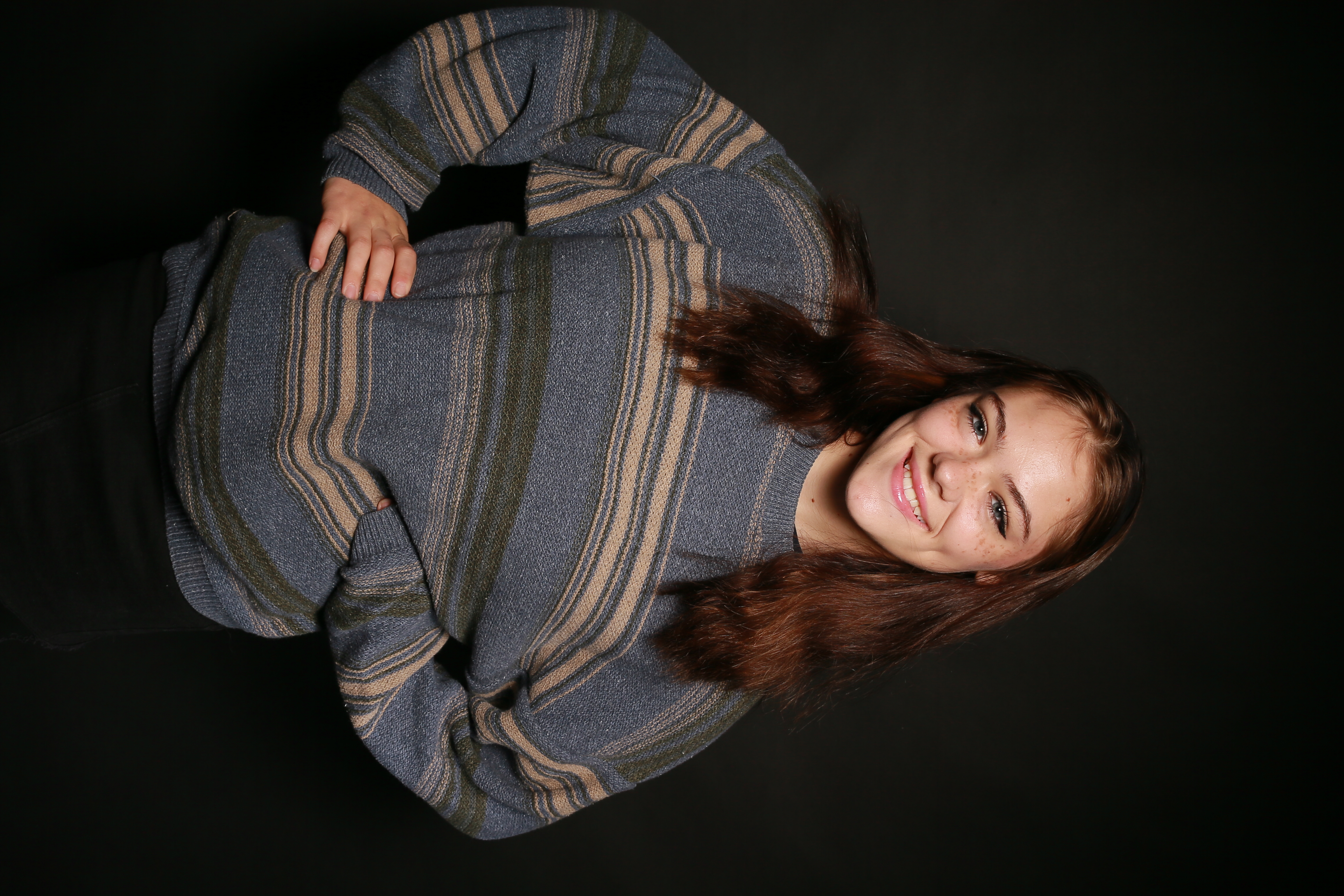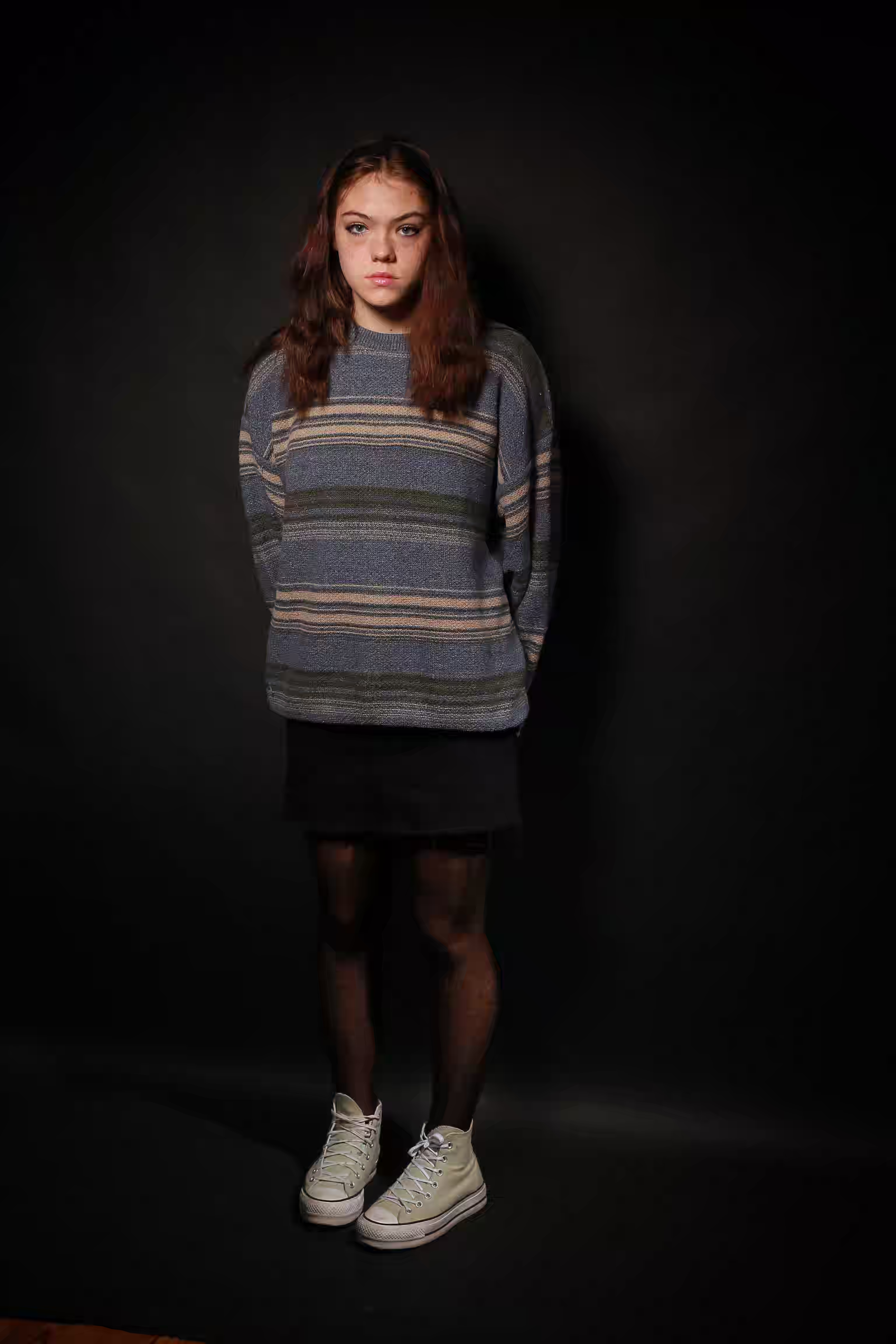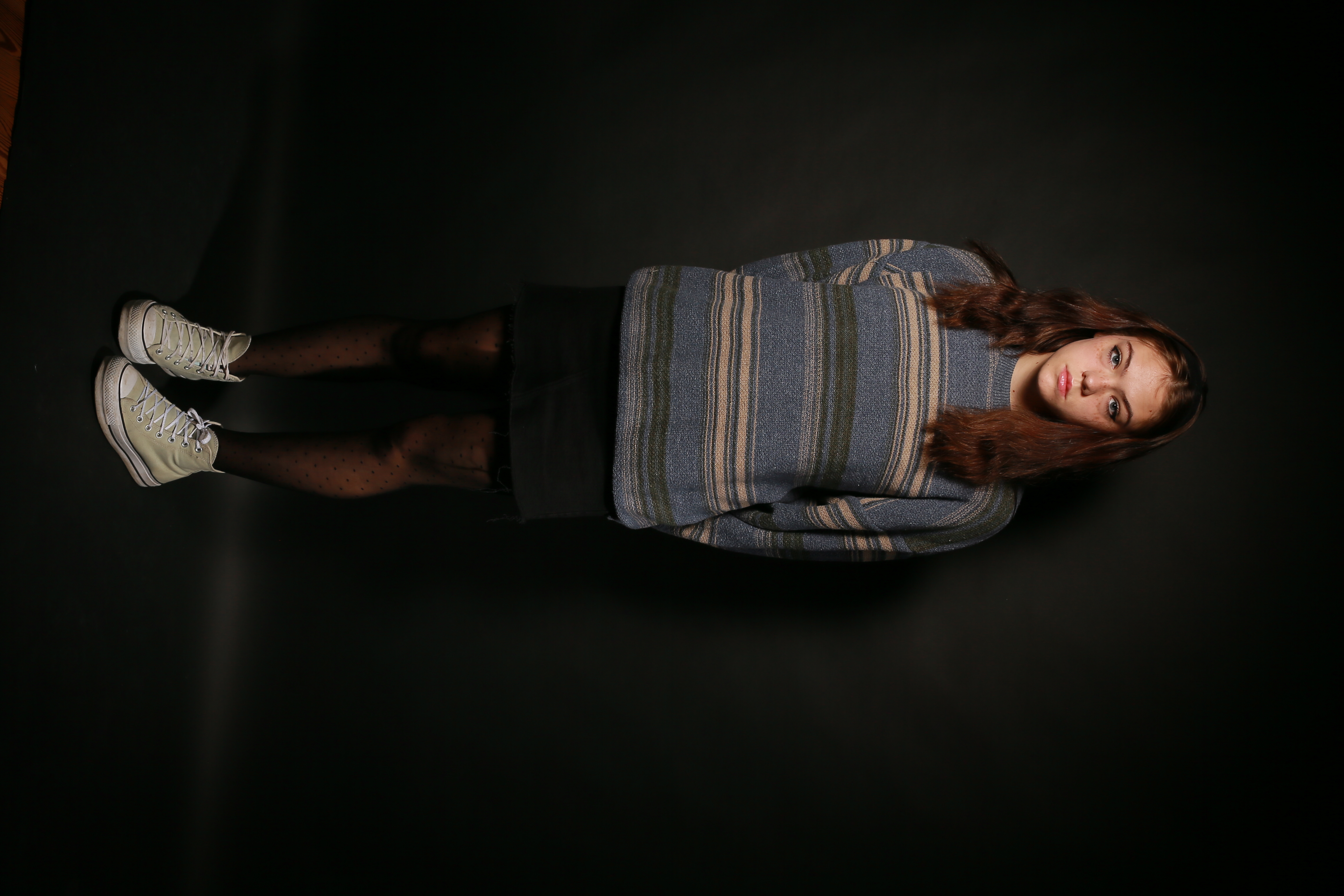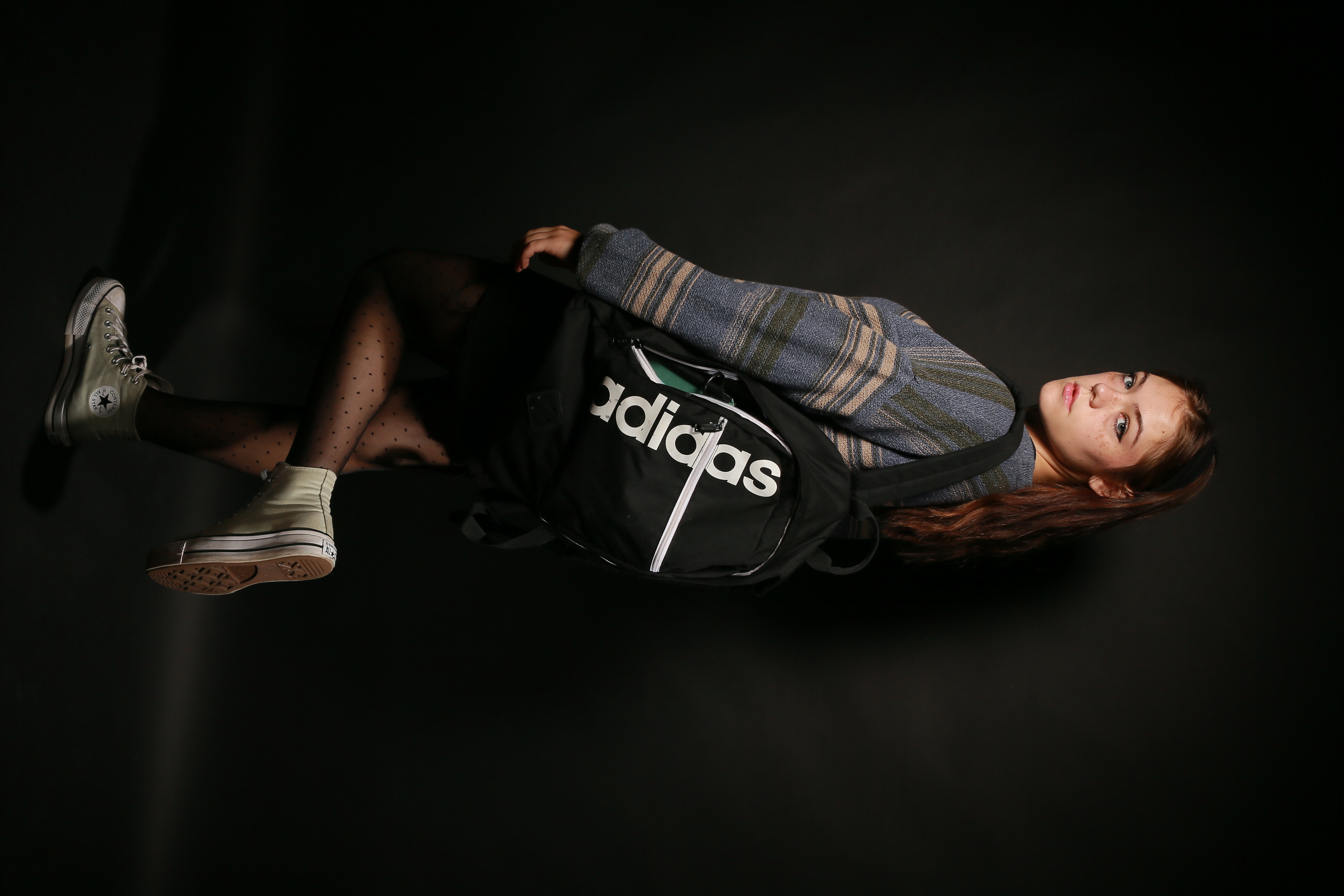 Tami stands sideways with her legs crossed over an Adidas bag against a dark background, creating an intriguing vertical perspective that adds depth to the image.