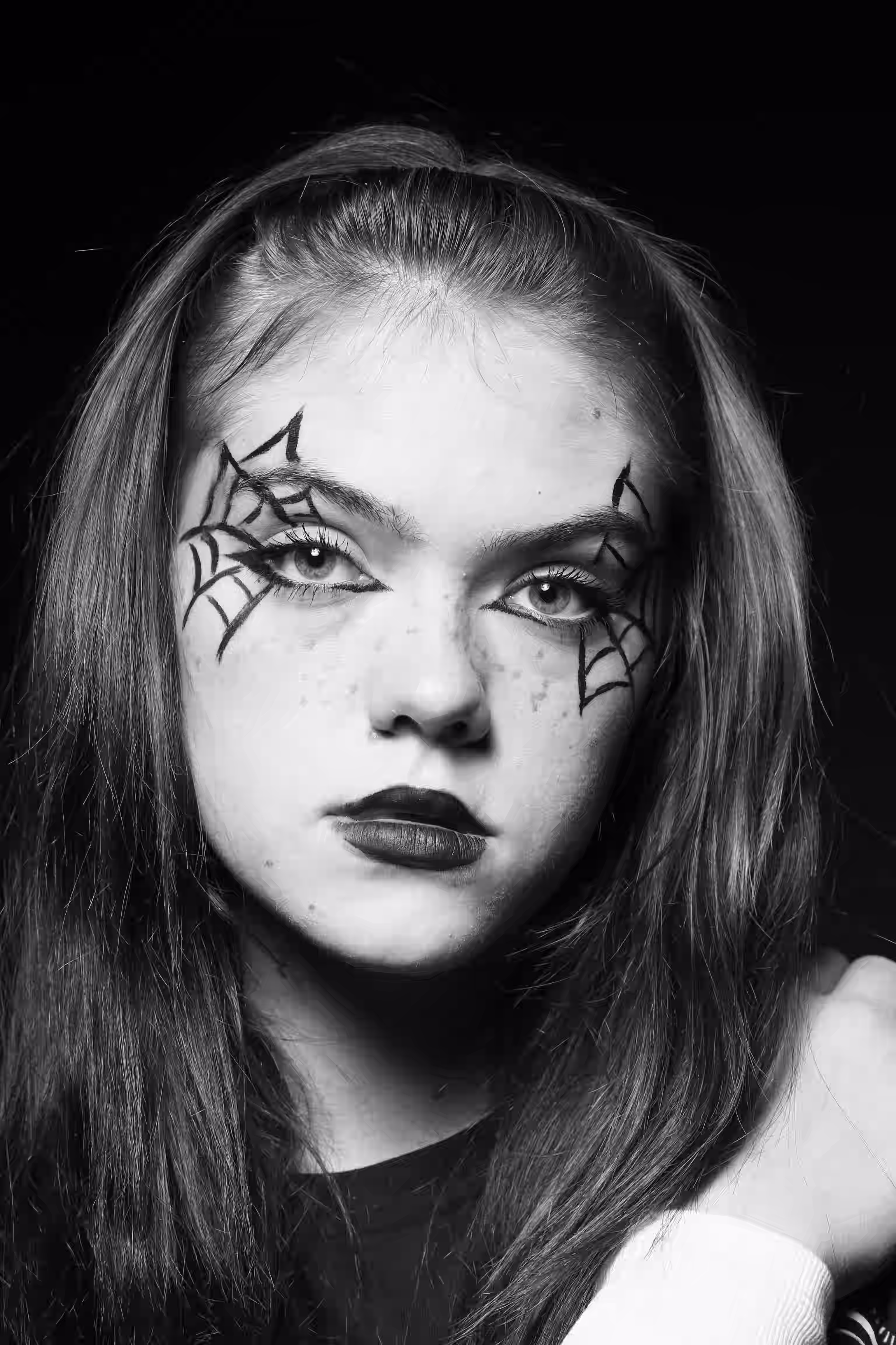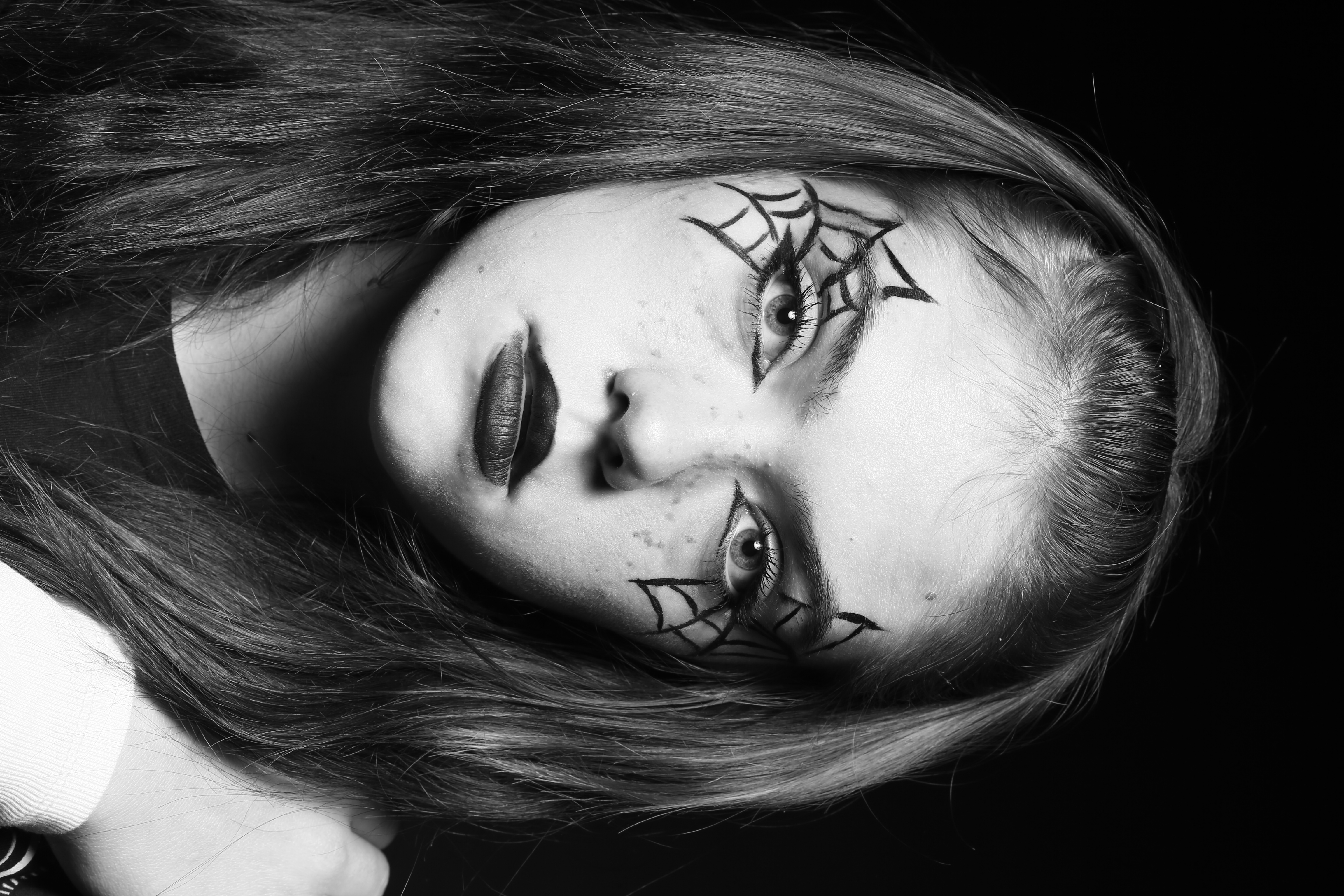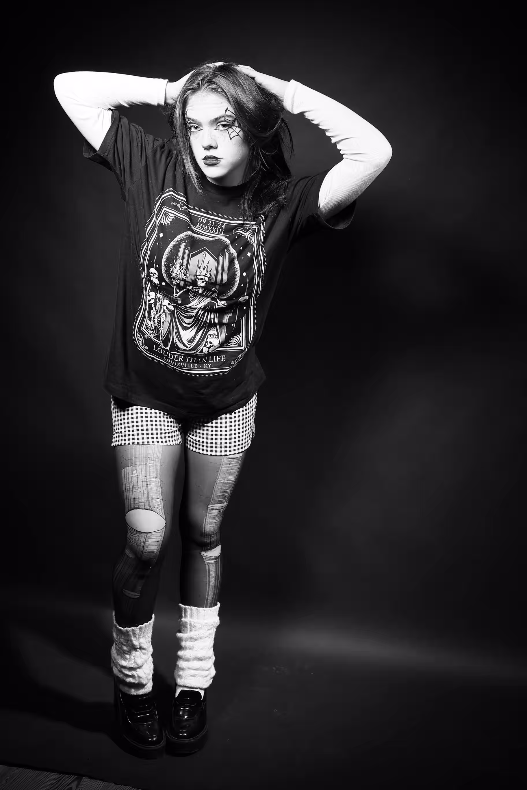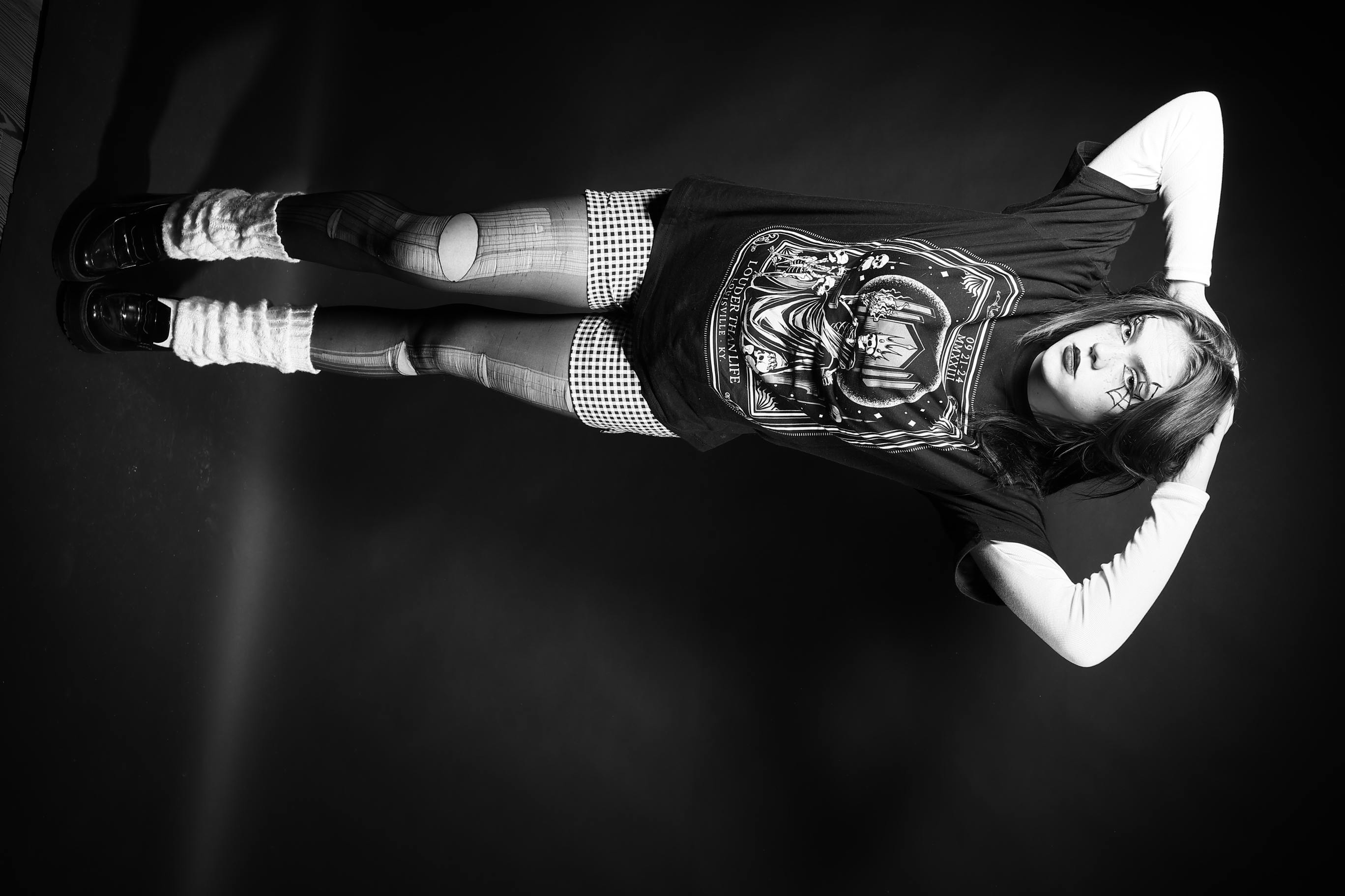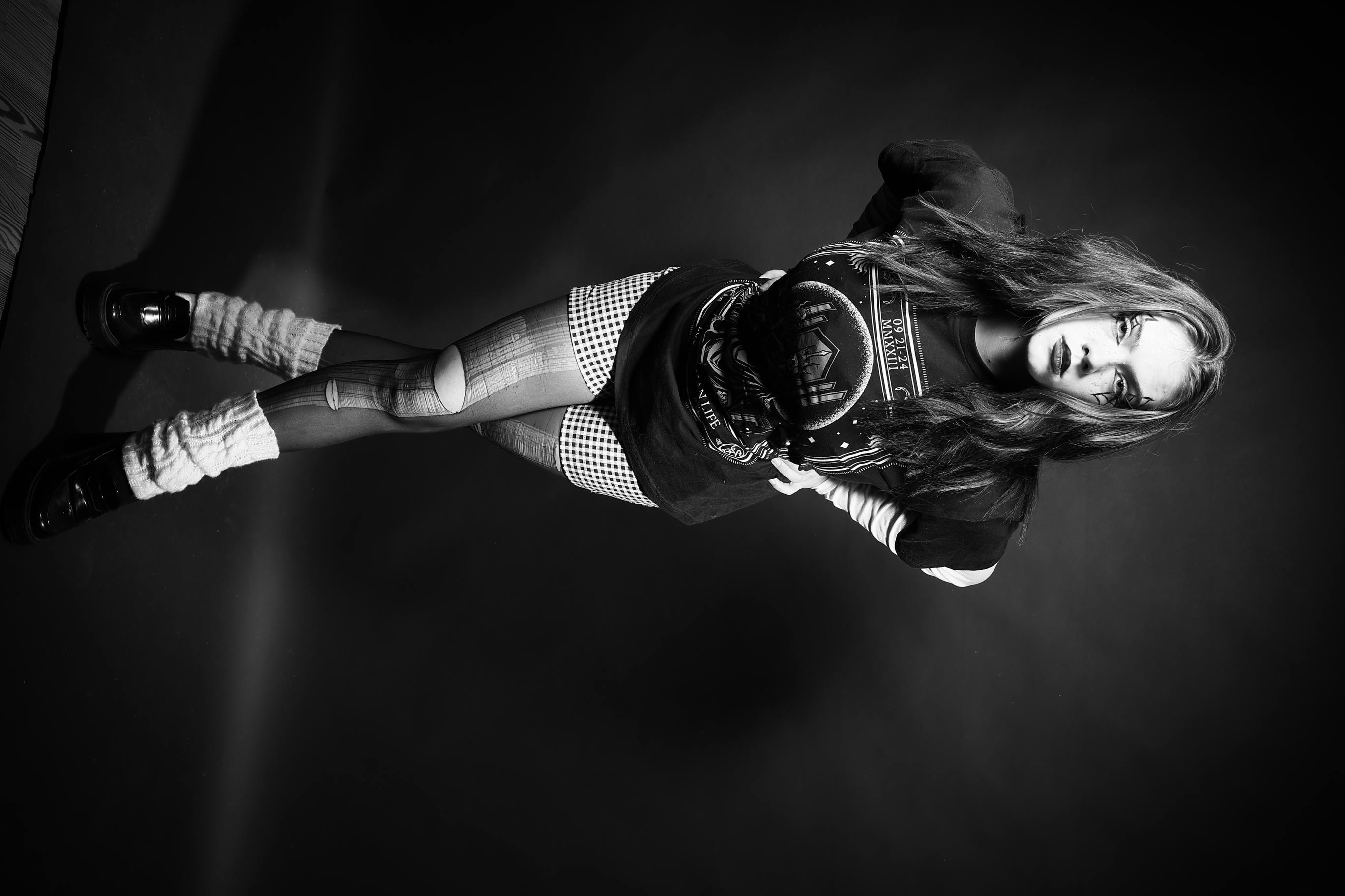 In an inverted black-and-white photograph, a person stands with their feet apart against a dark background, wearing knee-high socks, checkered shorts, and a jacket adorned with patches that read "Vice." The scene evokes a sense of mystery due to its unusual perspective and monochromatic color scheme.