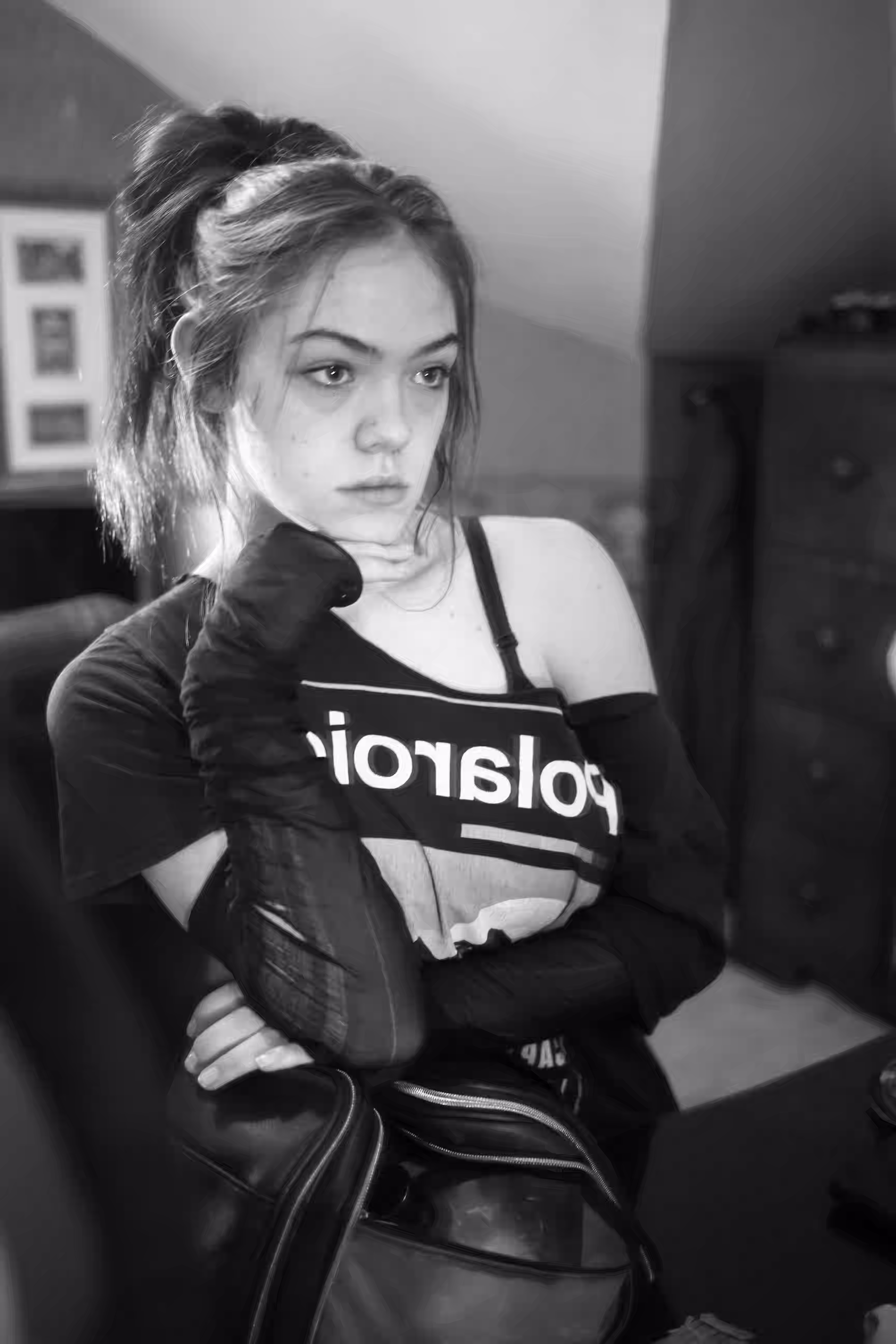 black and white style, mirror selfie, cluttered, bathroom, candid moment