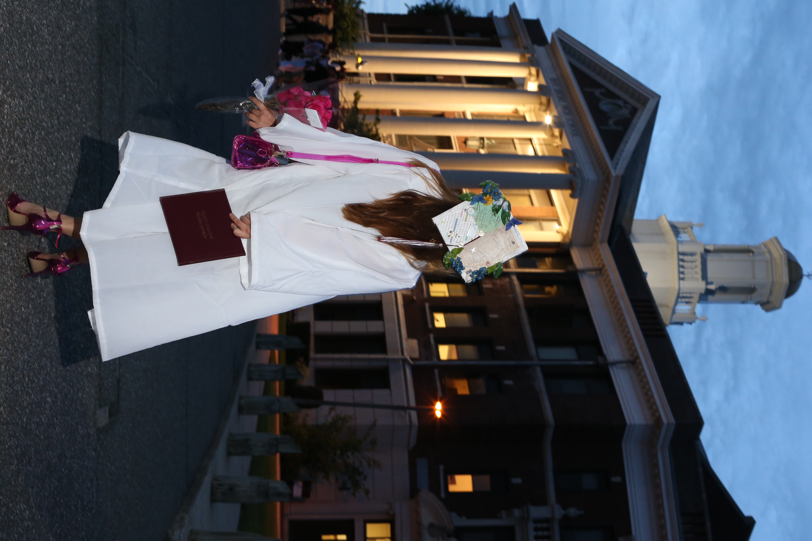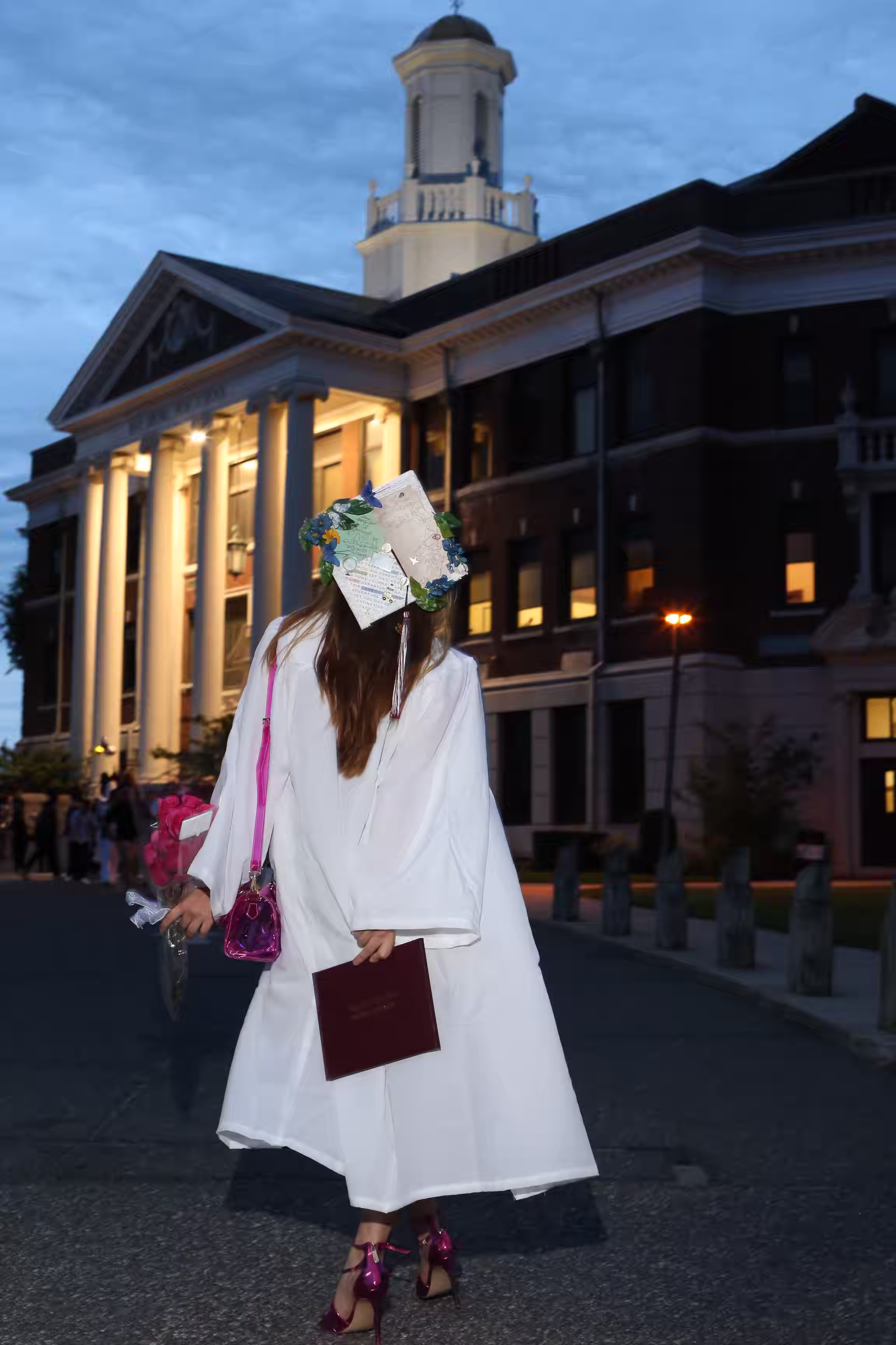 The photograph captures a young woman standing on a street corner at dusk, with a building featuring classical architecture in the background. She is dressed in a white graduation gown, holding a diploma in her left hand and a bouquet of flowers in her right hand. The setting appears to be a university campus, as indicated by the formal attire and the presence of a clock tower in the distance. The sky is a gradient of blue hues, transitioning from light to dark, suggesting the time is either early evening or late afternoon. The overall mood is celebratory and solemn, reflecting the significance of the moment.