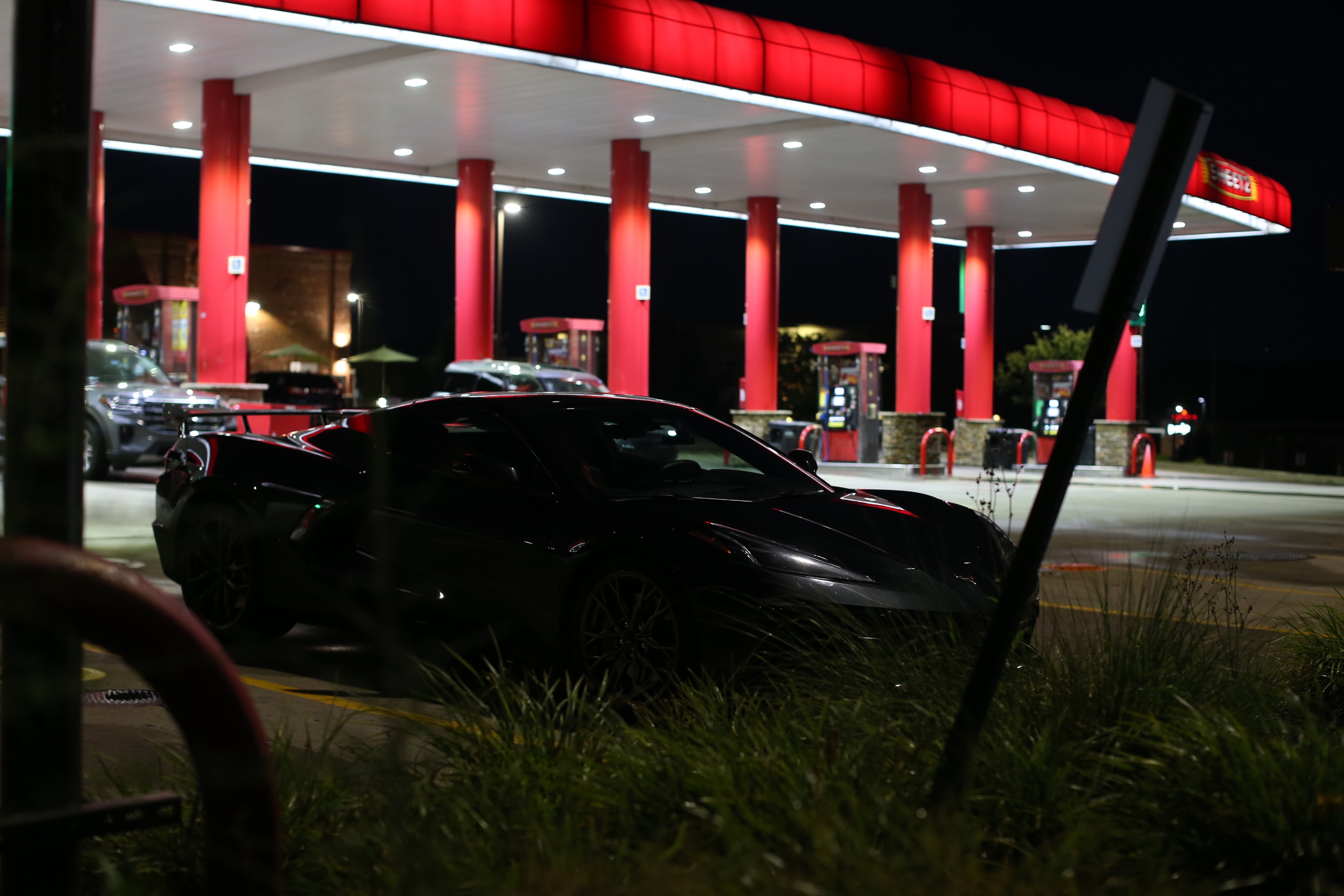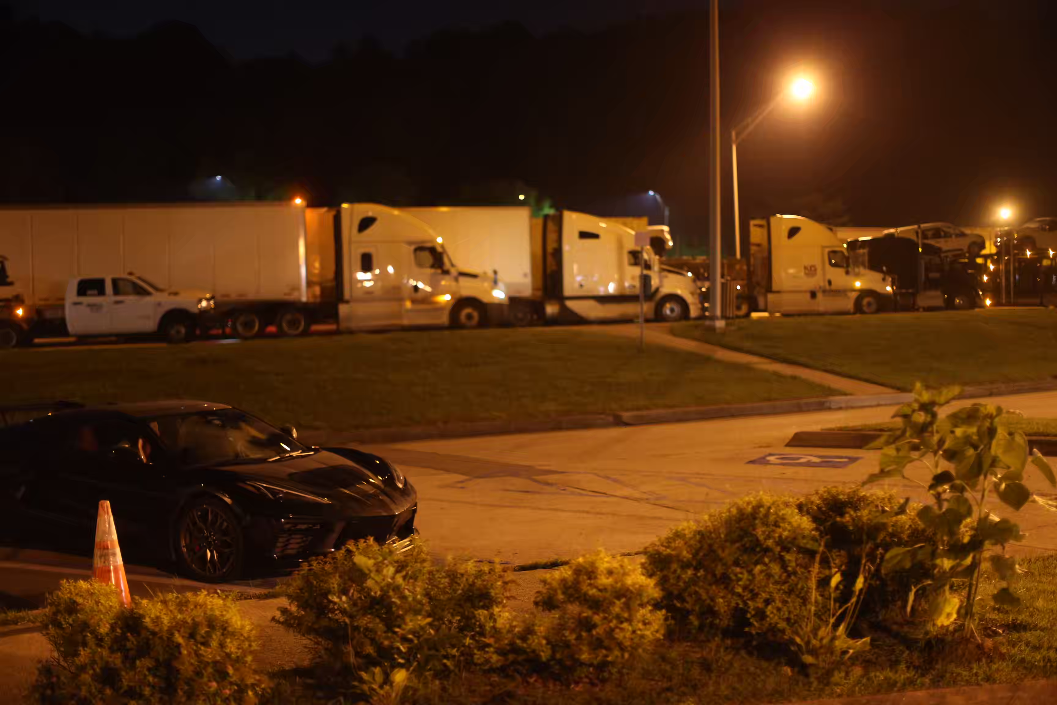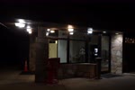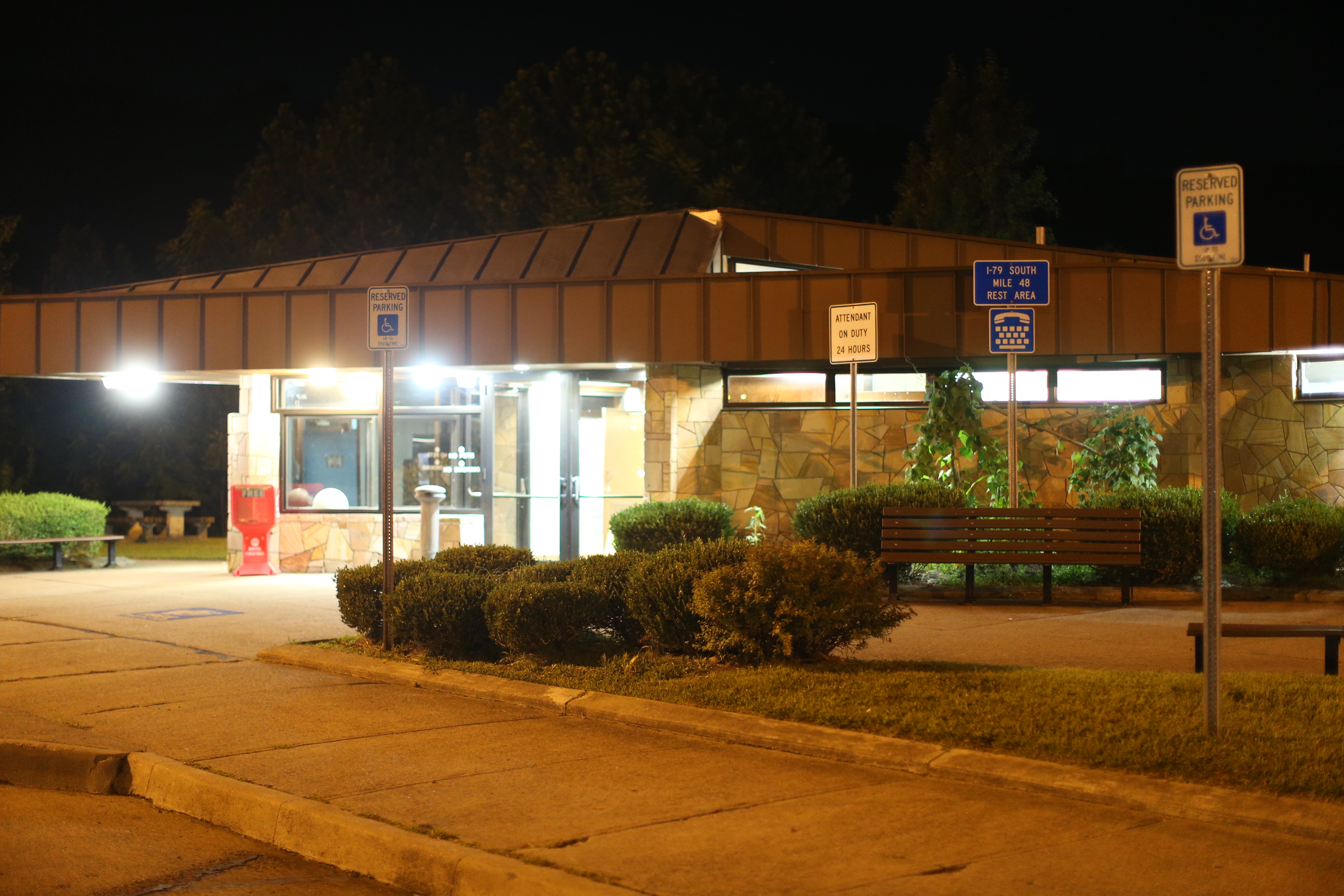 The photograph depicts a nighttime scene at what appears to be a public rest area or service station. The setting is illuminated by artificial lighting, casting a warm glow over the area. In the foreground, there are several signs, including one indicating reserved parking for disabled individuals. The building features a stone facade with large windows, through which some interior lights can be seen. The surrounding area includes neatly trimmed bushes and a few benches, suggesting a well-maintained public space. The overall mood is quiet and serene, typical of a late-night scene in an urban or suburban setting.