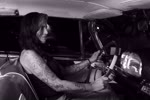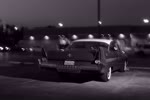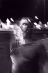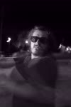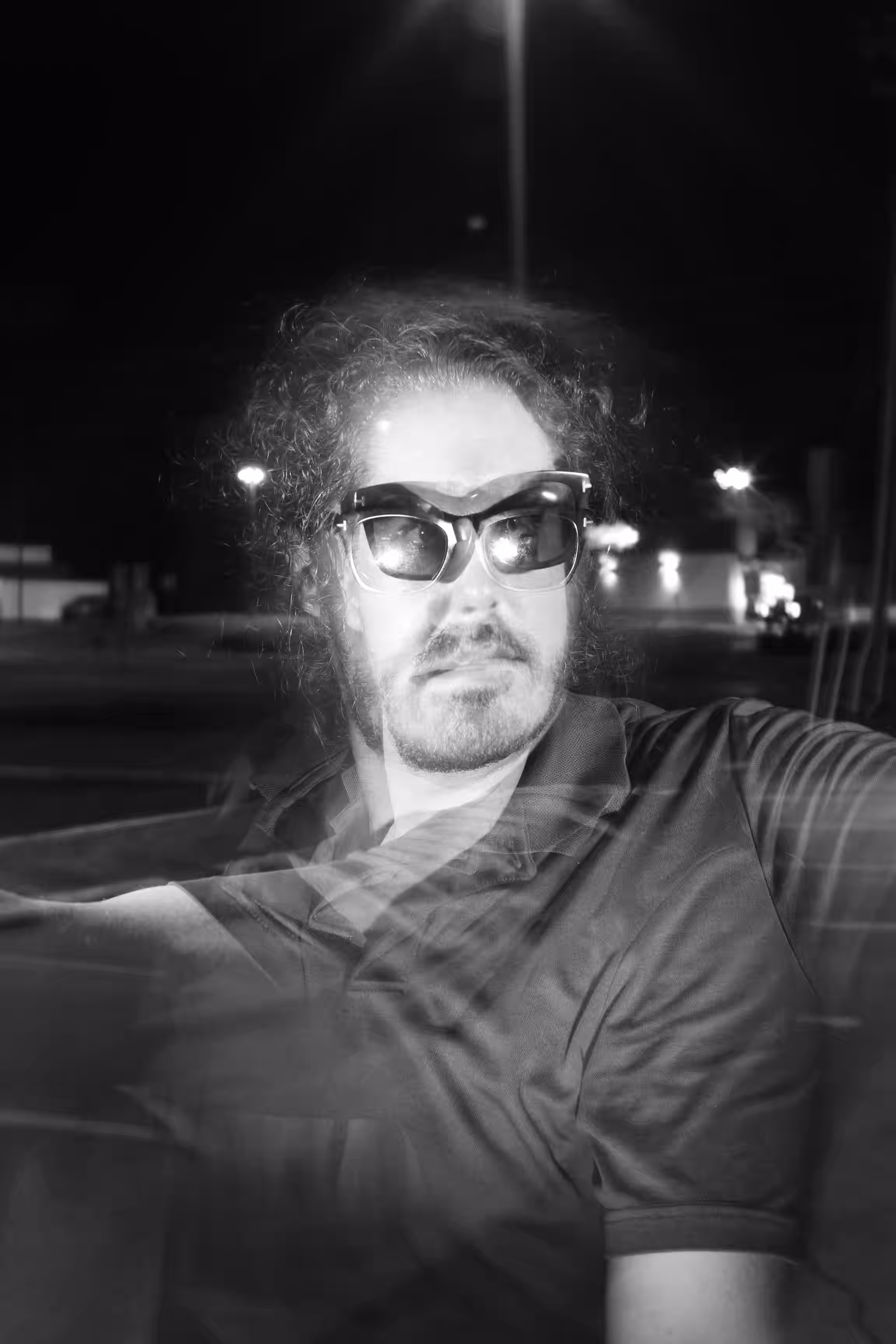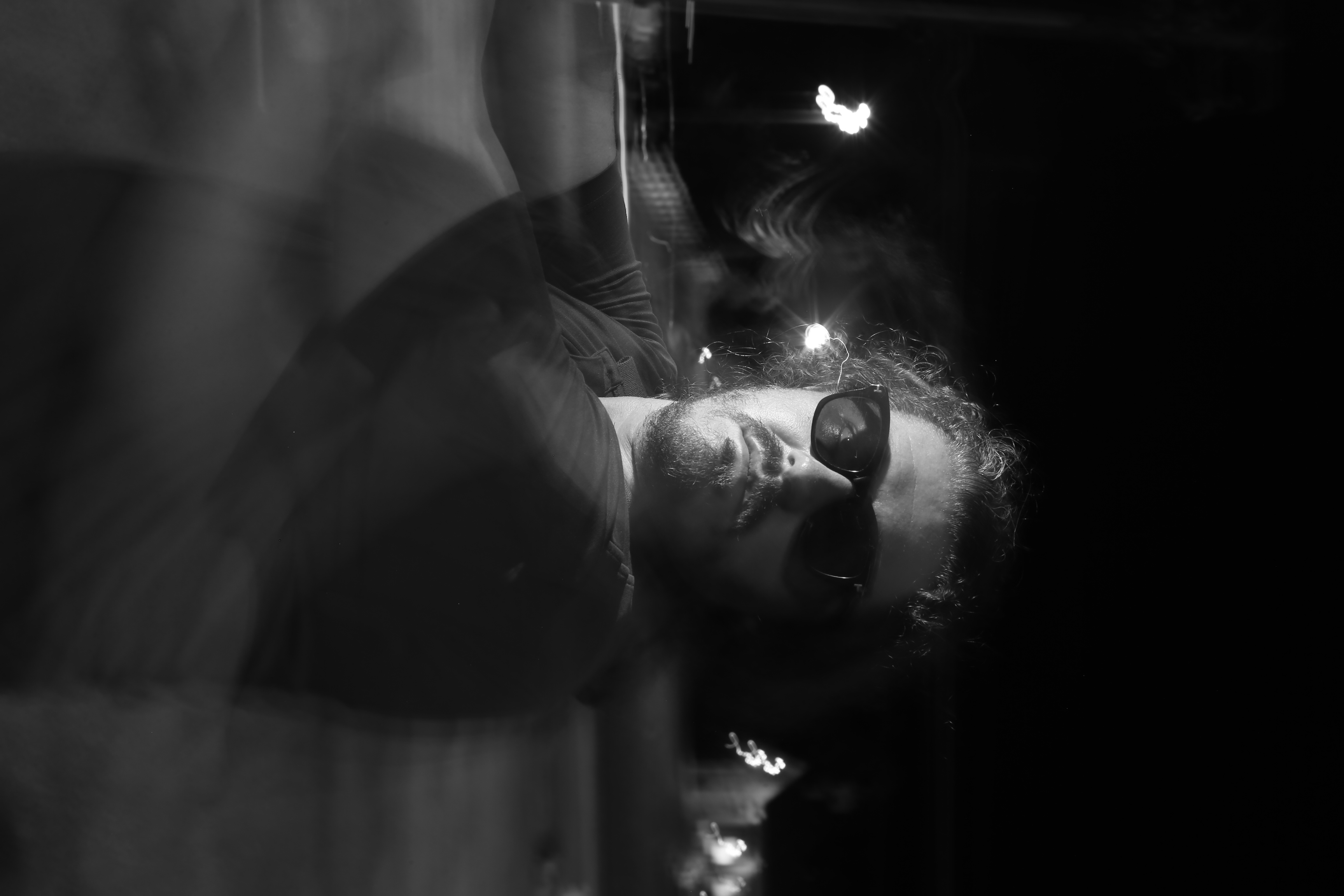 The photograph is a black-and-white image that captures a person lying down, possibly on a bed or couch, with their head tilted back and eyes closed. The lighting is dim, creating a moody and intimate atmosphere. The person appears to be wearing sunglasses, which adds to the mysterious and relaxed vibe of the scene. In the background, there are faint lights visible through what seems to be a window or an opening, suggesting it might be nighttime or early evening. The overall mood of the photograph is serene and contemplative, evoking a sense of calm and introspection.