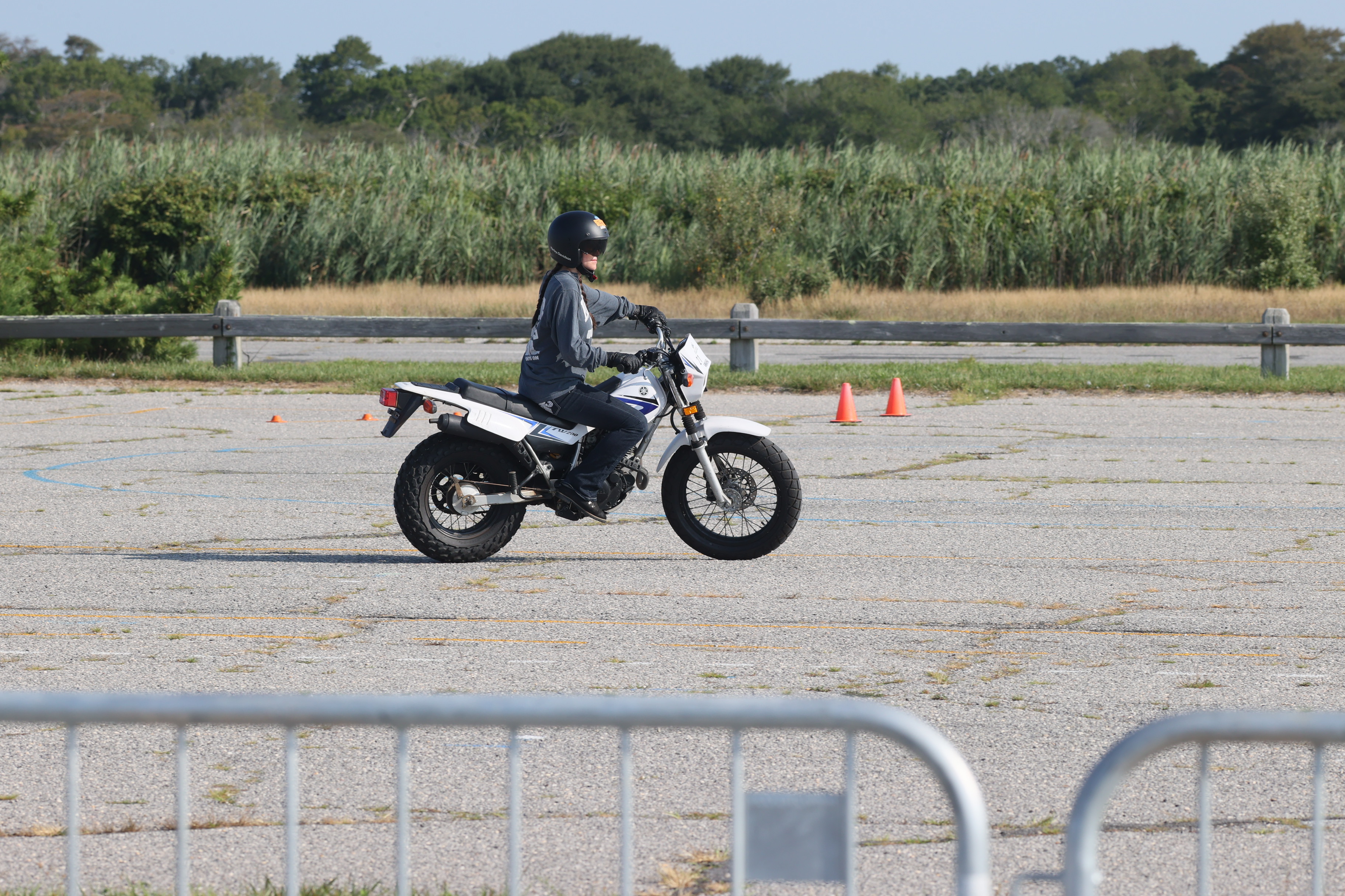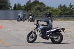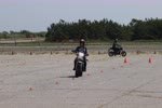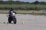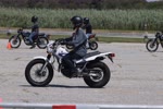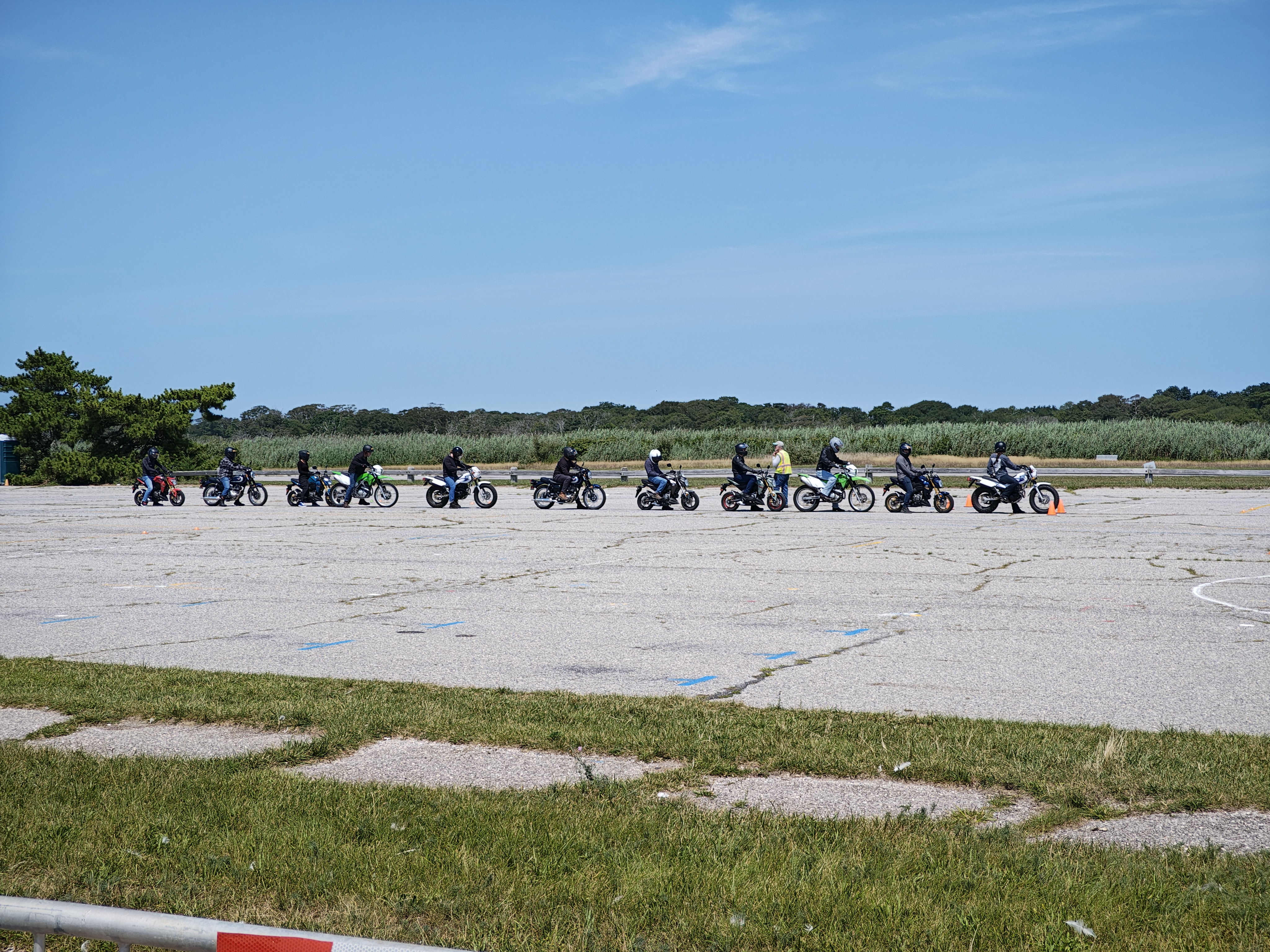 The photograph depicts a group of motorcyclists lined up on a paved surface, likely an empty parking lot or training area. The riders are wearing helmets and riding gear, suggesting they are preparing for a ride or a training session. The setting is outdoors, with a clear blue sky above and a line of trees and bushes in the background, indicating a rural or semi-rural location. The ground appears to be cracked and worn, with some grass patches visible, adding to the rustic feel of the environment. The overall mood is calm and focused, as the riders seem ready to begin their activity.