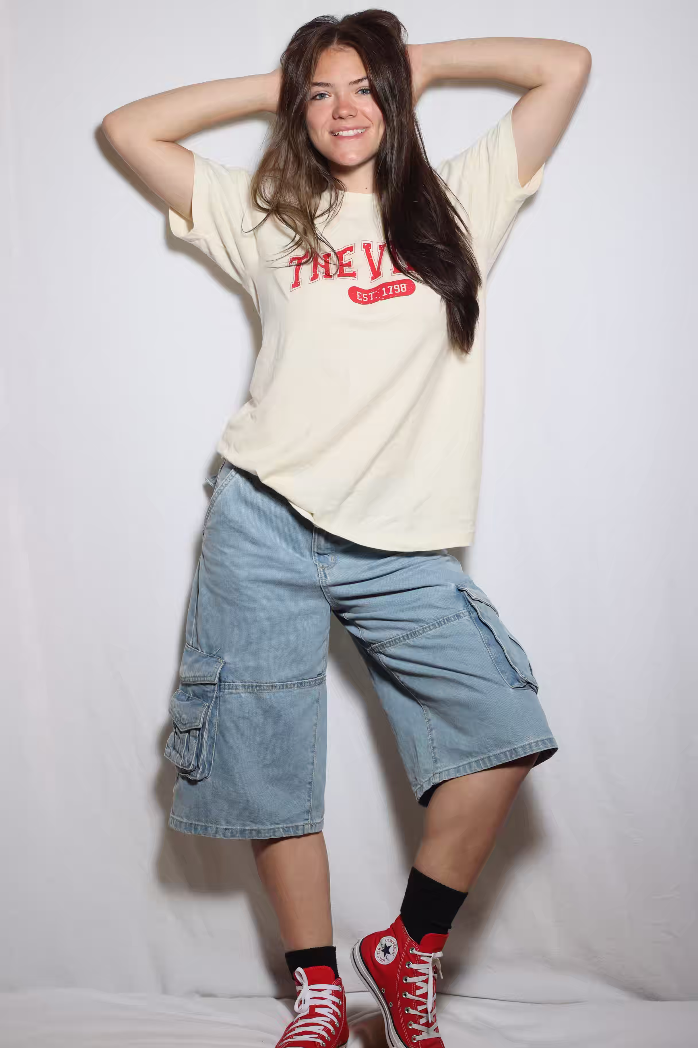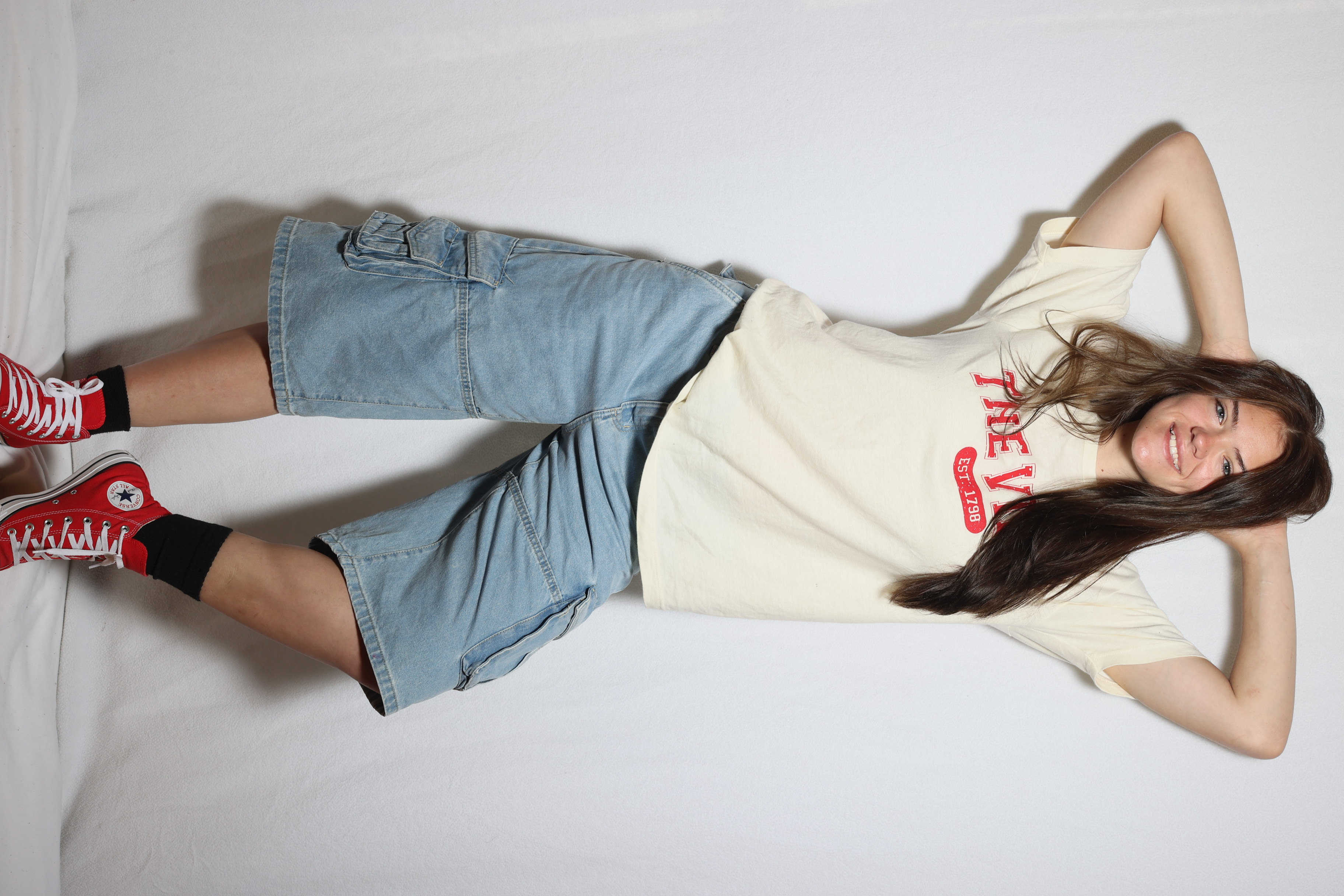 The photograph depicts a young woman lying on her back on a plain white surface, possibly a bed or a table. She is wearing a light-colored t-shirt with red text that reads "THE" and "EST 1798," paired with blue denim shorts and red Converse sneakers. Her long brown hair is loose and falls over her shoulders. The overall mood of the image is casual and relaxed, with a focus on the subject's attire and pose. The simplicity of the background emphasizes the subject, making her outfit stand out prominently.