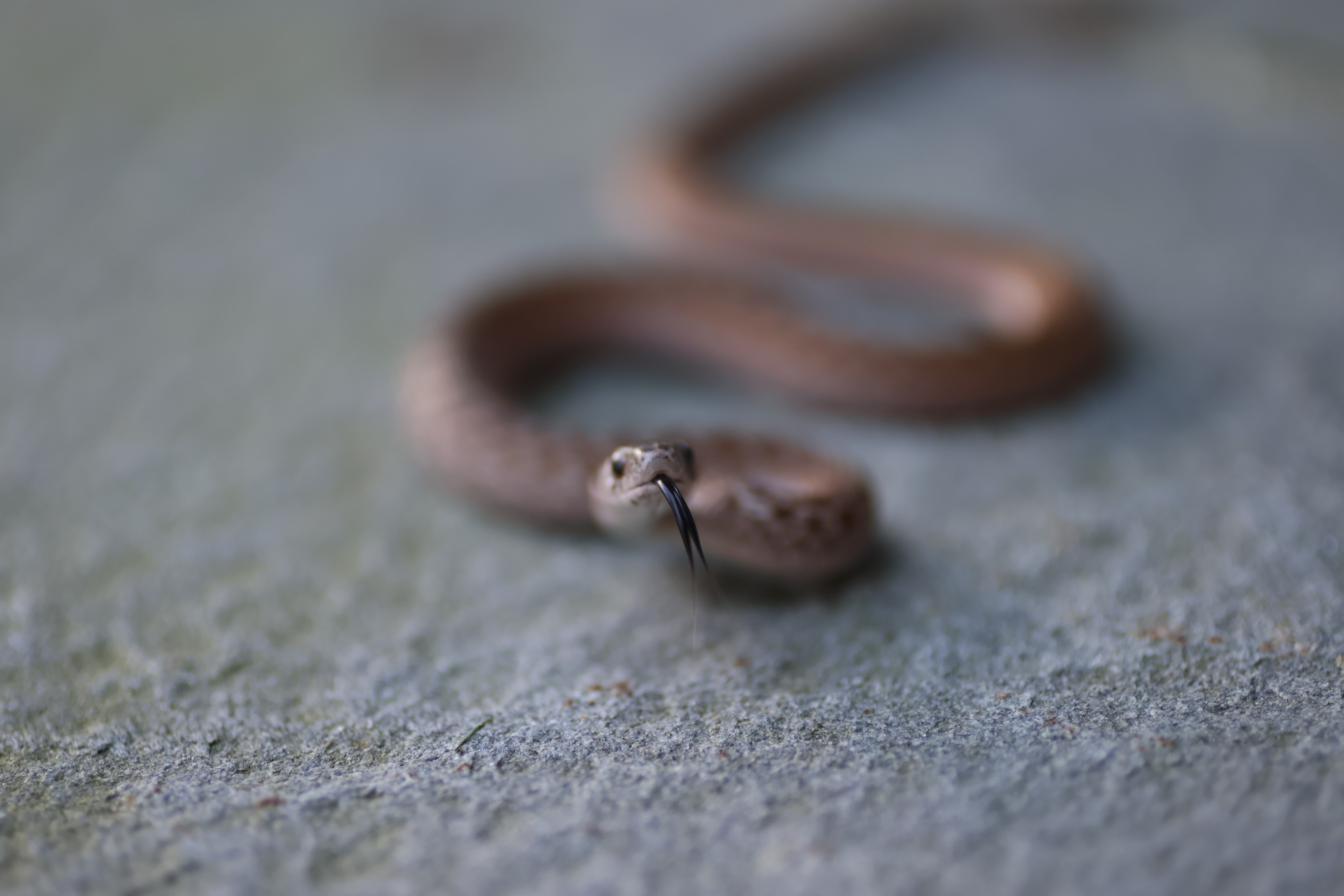 The photograph captures a close-up view of a snake coiled on a textured surface, likely concrete or stone. The snake's body is a muted brown color, blending seamlessly with the background. Its head is slightly raised, revealing its black tongue flicking out, which adds a sense of alertness to the scene. The overall mood is calm yet intriguing, as the snake's presence is both mysterious and captivating. The blurred background draws attention to the snake, emphasizing its details and creating a focal point in the image.