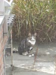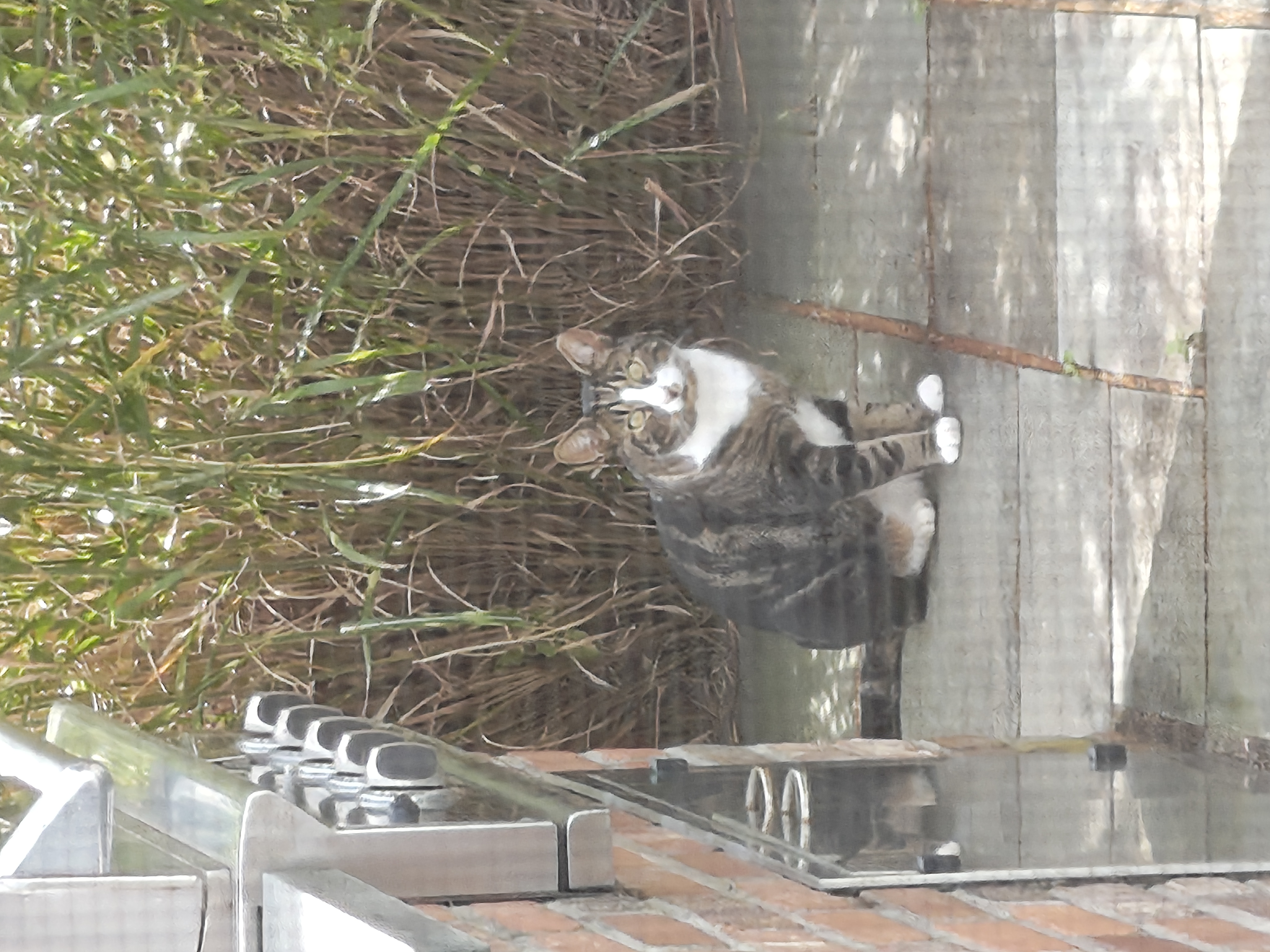 The photograph captures a serene outdoor scene featuring a tabby cat with white markings on its chest and paws. The cat is standing on a paved surface near a wooden fence, looking up towards the camera with an alert expression. Behind the cat, there is a dense patch of tall, green grass that appears to be part of a garden or yard. The setting suggests a peaceful, suburban environment, possibly during late spring or summer when the grass is lush. The overall mood of the image is calm and natural, with the cat's attentive gaze adding a sense of curiosity and liveliness to the scene.