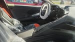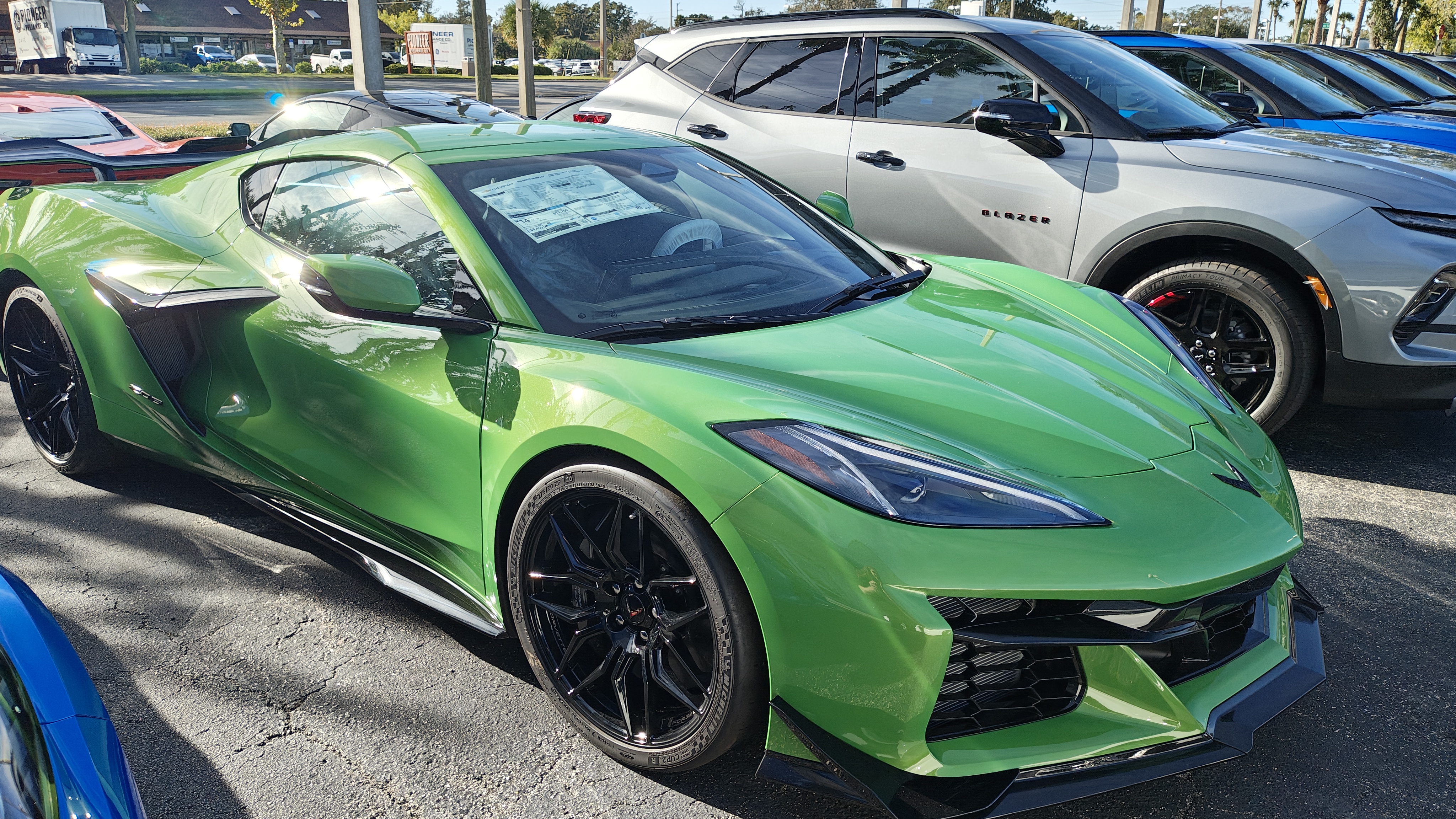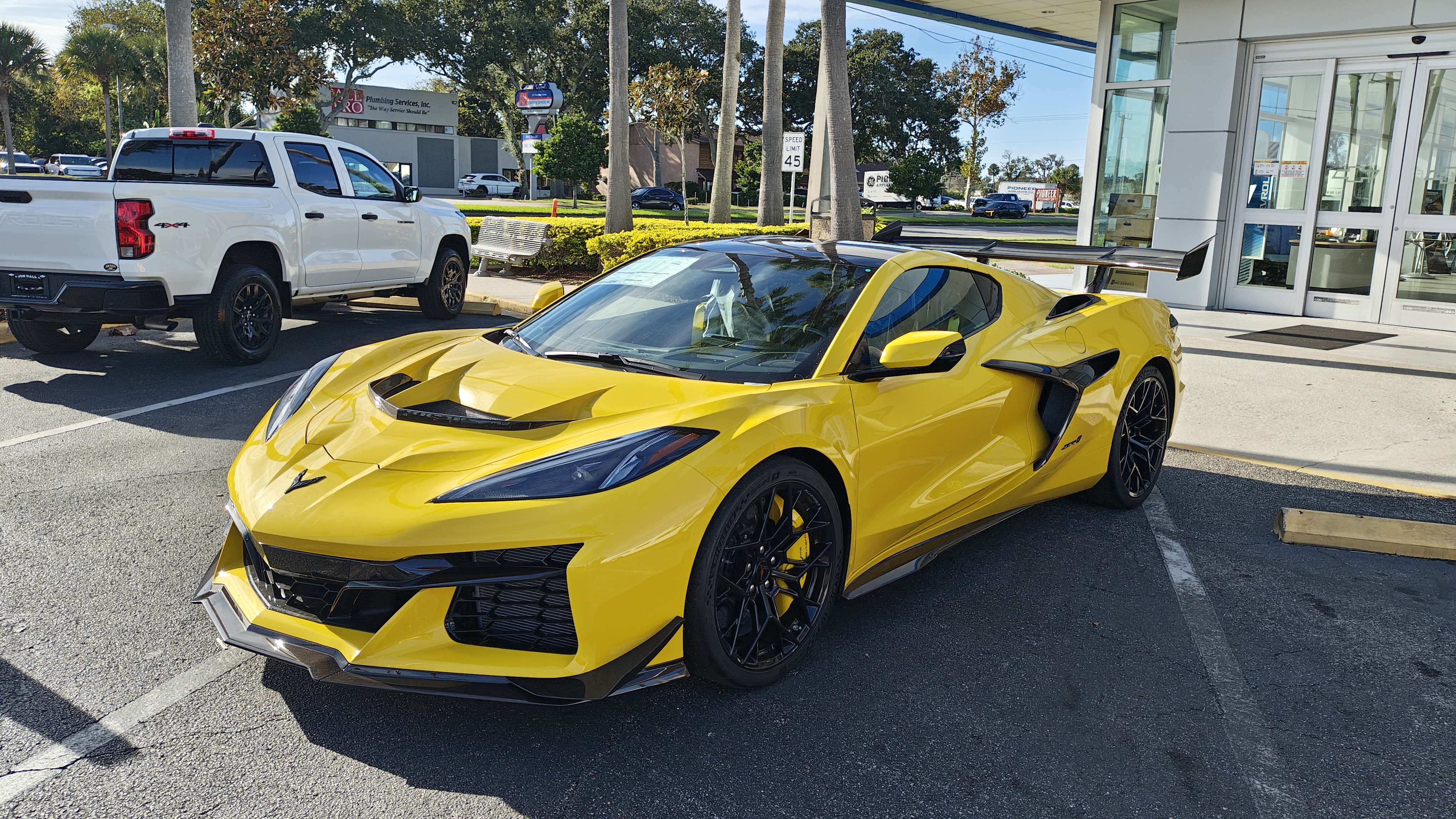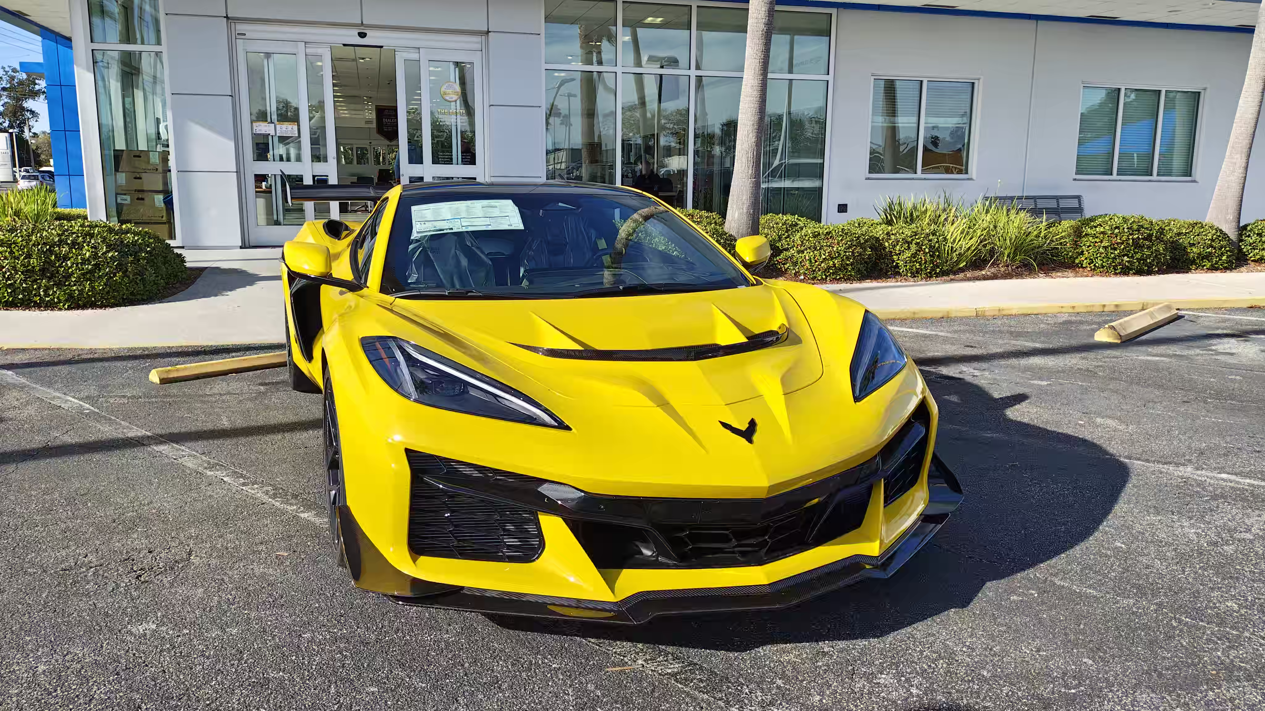 The photograph depicts a vibrant yellow sports car parked in a parking lot outside a car dealership. The car's sleek design features a low profile, large black wheels with yellow accents, and a prominent front grille with a distinctive emblem. The dealership has large glass doors and windows, reflecting the surrounding environment. In the background, there is a white pickup truck and several other vehicles, including a white van and a red car. The scene is set on a sunny day with clear skies, casting shadows on the ground. The overall mood is bright and energetic, emphasizing the sporty nature of the vehicle.