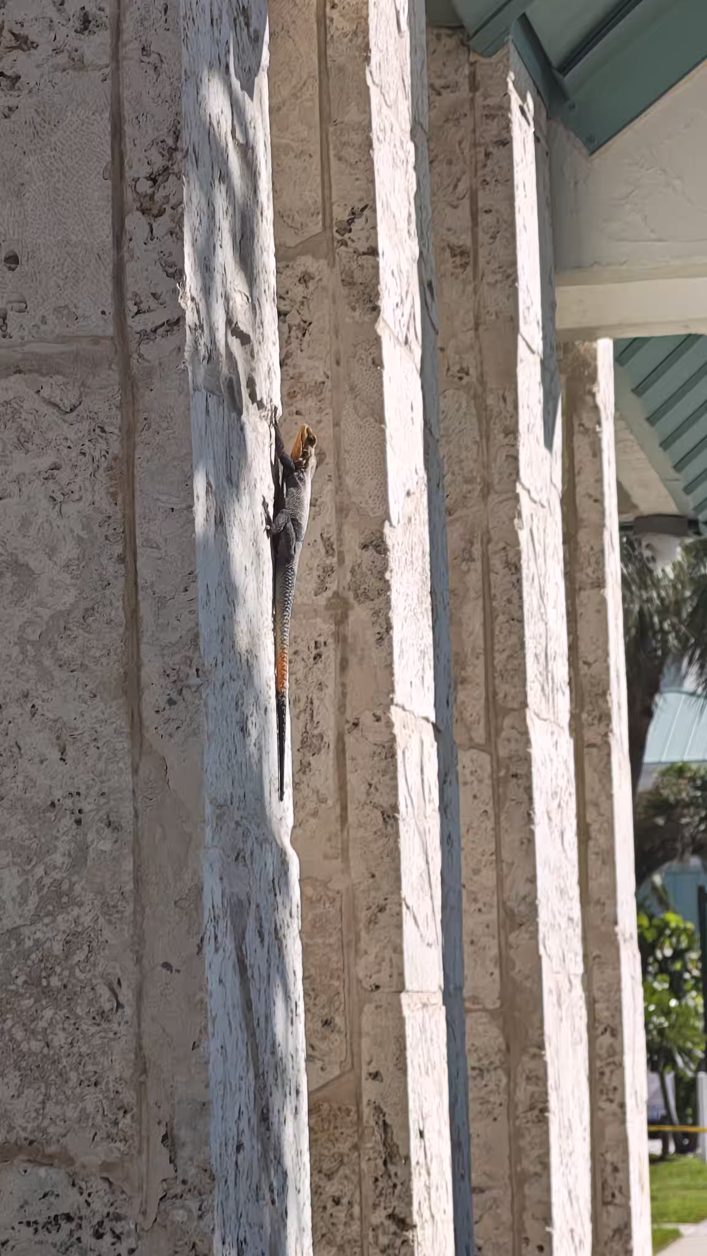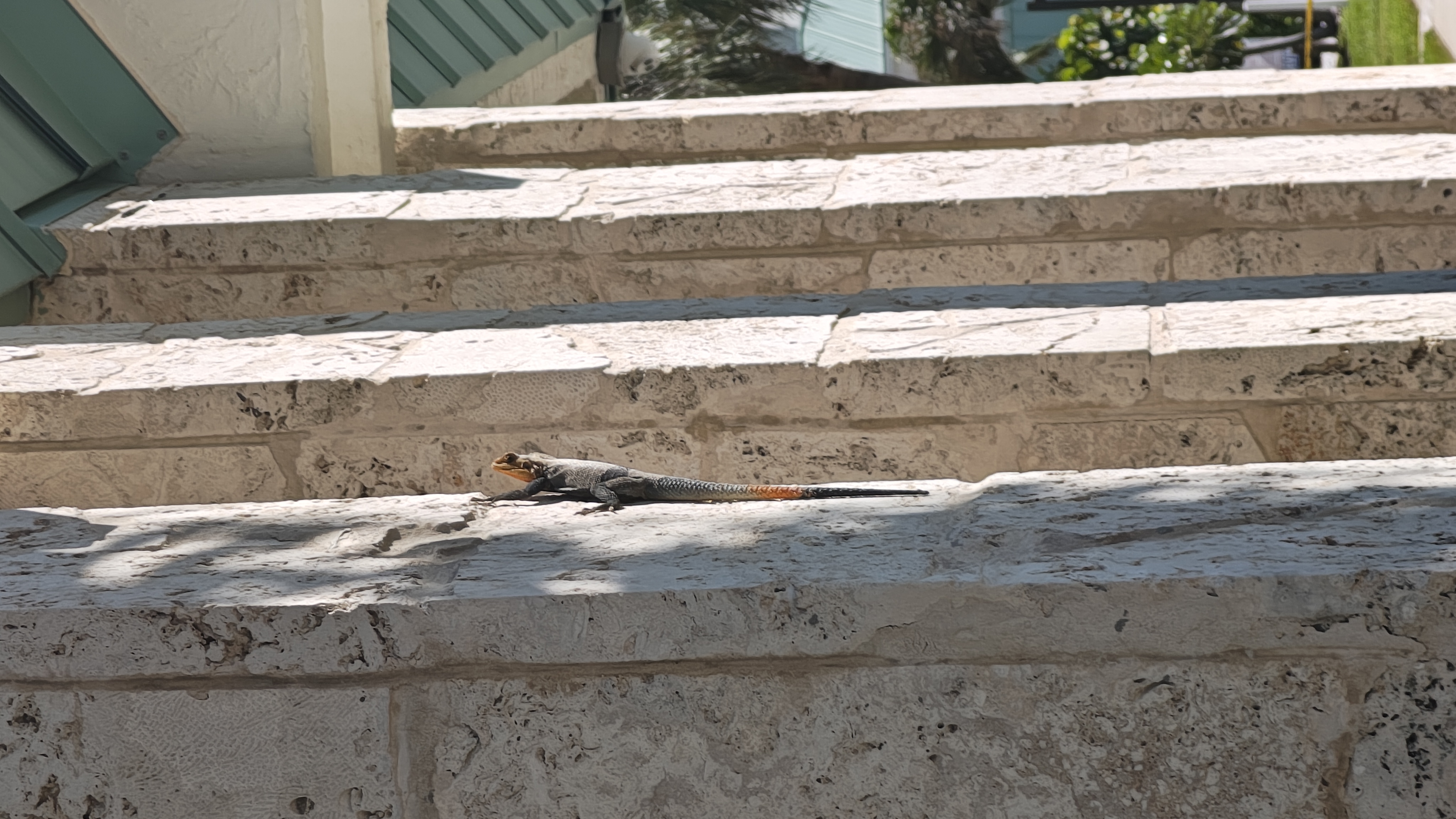 The photograph captures a serene outdoor scene featuring a lizard perched on a stone wall. The lizard, with its vibrant orange and yellow head and tail, contrasts sharply against the muted tones of the stone wall. The setting appears to be a residential area, with a house visible in the background, characterized by light-colored siding and green shutters. The mood is calm and peaceful, with the lizard seemingly at ease in its environment. The colors in the image range from the warm hues of the lizard to the cool, earthy tones of the stone wall and the house, creating a harmonious balance.