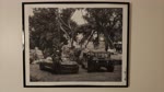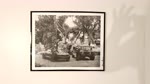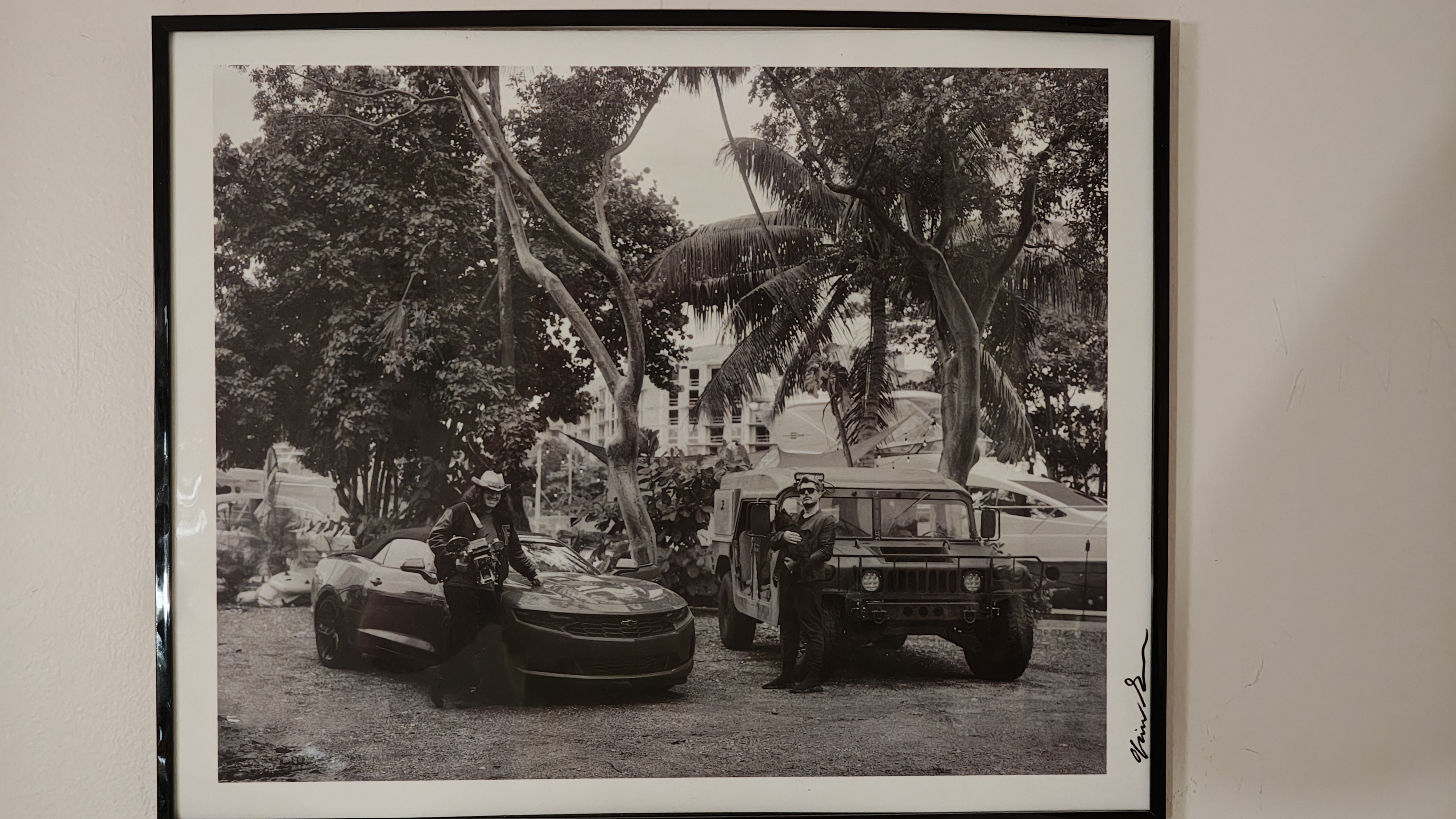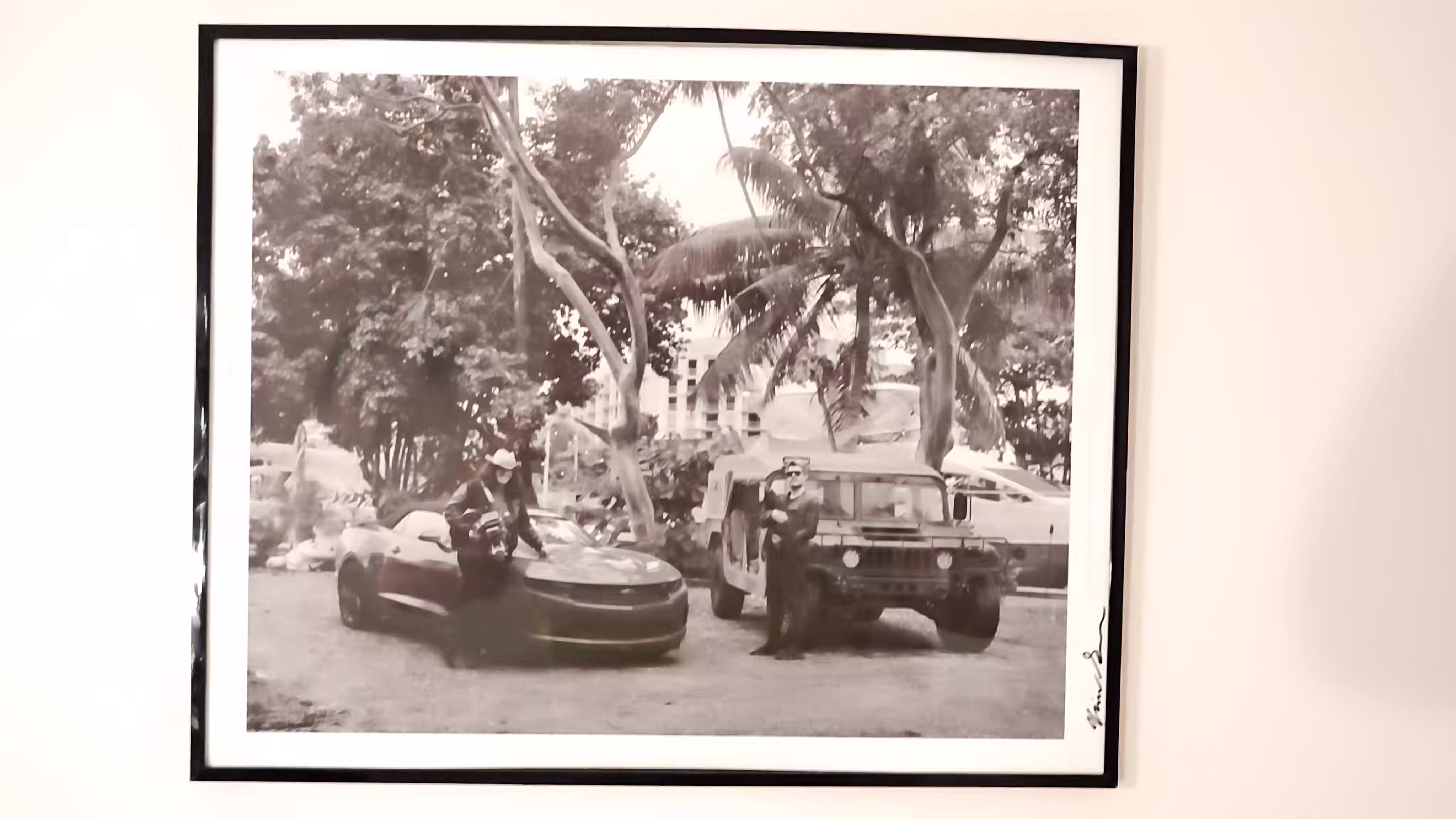 The photograph is a black-and-white image depicting an urban street scene with a vintage feel. In the foreground, two individuals stand next to a classic muscle car and a Humvee, both appearing to be in a playful or humorous pose. The background features tall palm trees and a building with multiple windows, suggesting a tropical or subtropical location. The overall mood of the image is light-hearted and nostalgic, capturing a moment of camaraderie between the two people amidst a backdrop of urban elements.