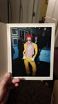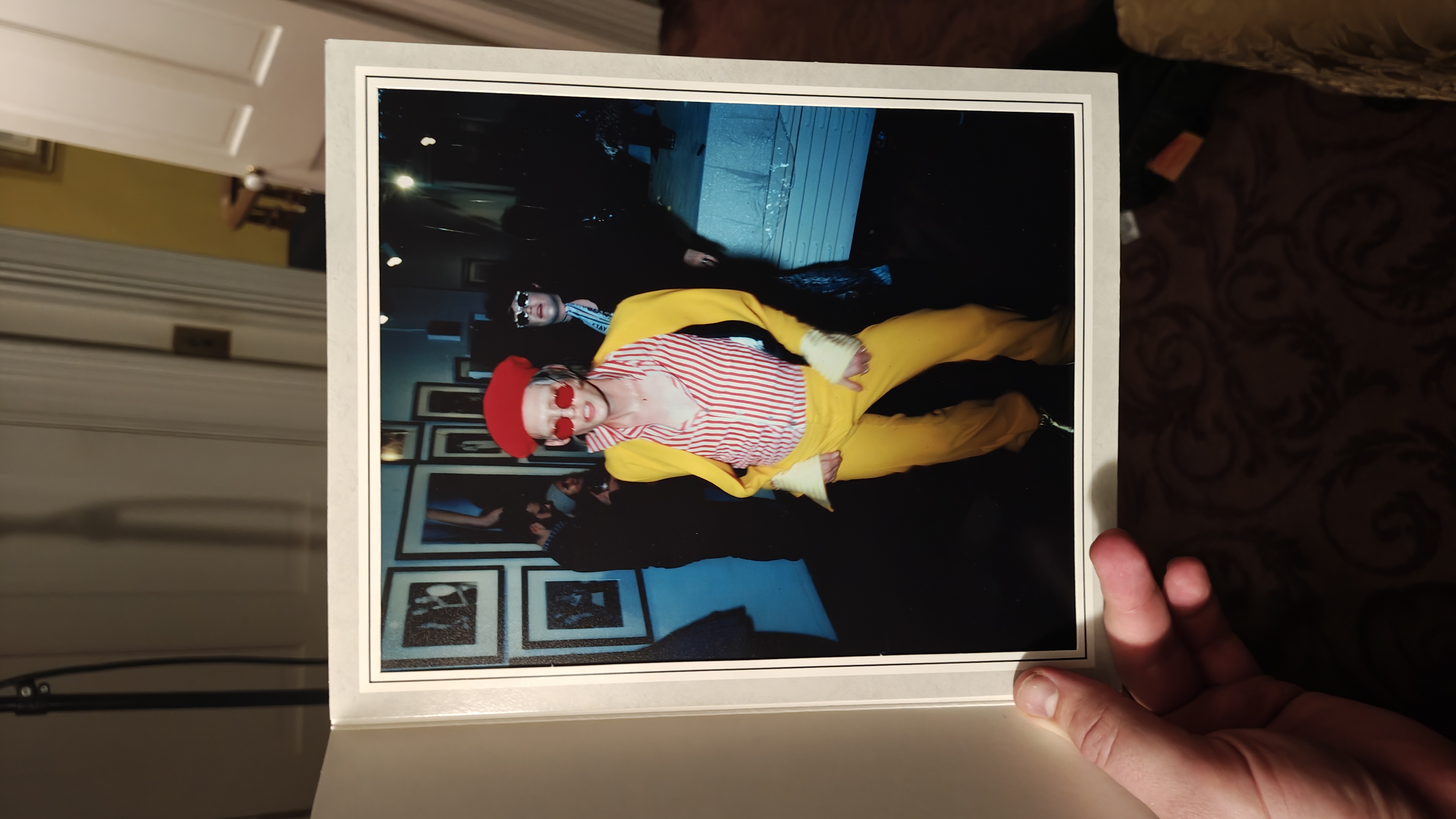 The photograph depicts a person dressed in a clown costume, complete with a red hat, white gloves, and a yellow suit with red and white striped shirt underneath. The individual is standing in front of a blue wall adorned with framed pictures, suggesting an indoor setting, possibly a gallery or a room with art on display. The lighting is dim, creating a moody atmosphere, with a few lights visible in the background, adding to the ambiance. The person's pose and attire give off a playful yet mysterious vibe, as if they are posing for a Halloween costume photo or a themed event.