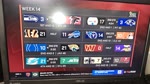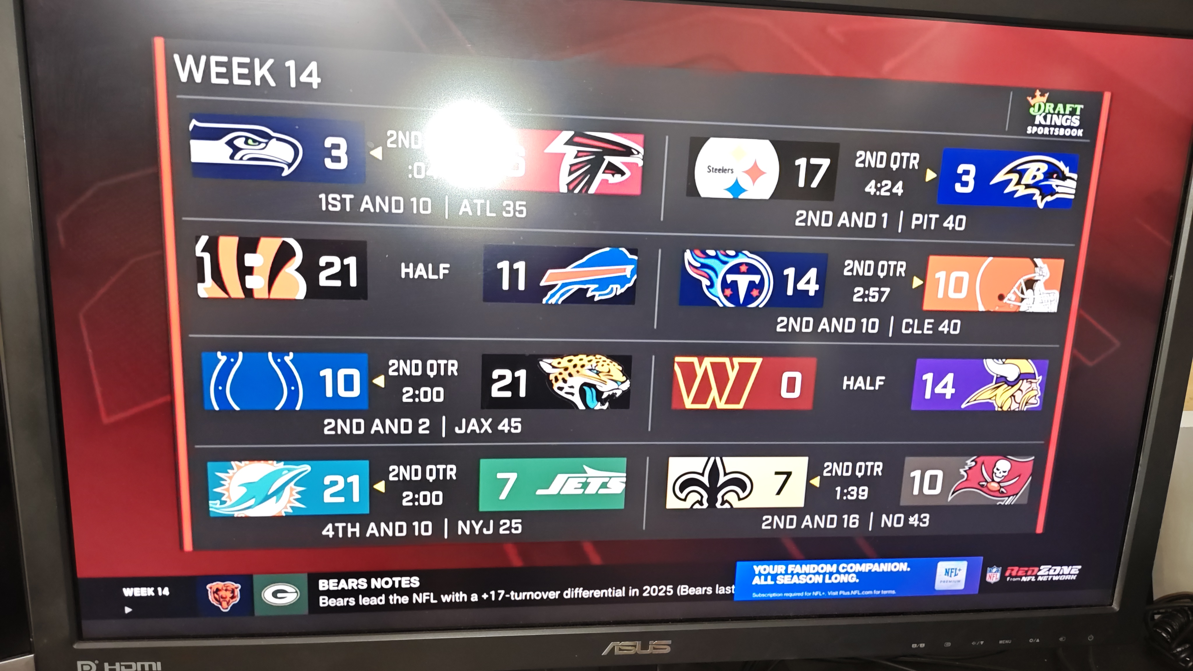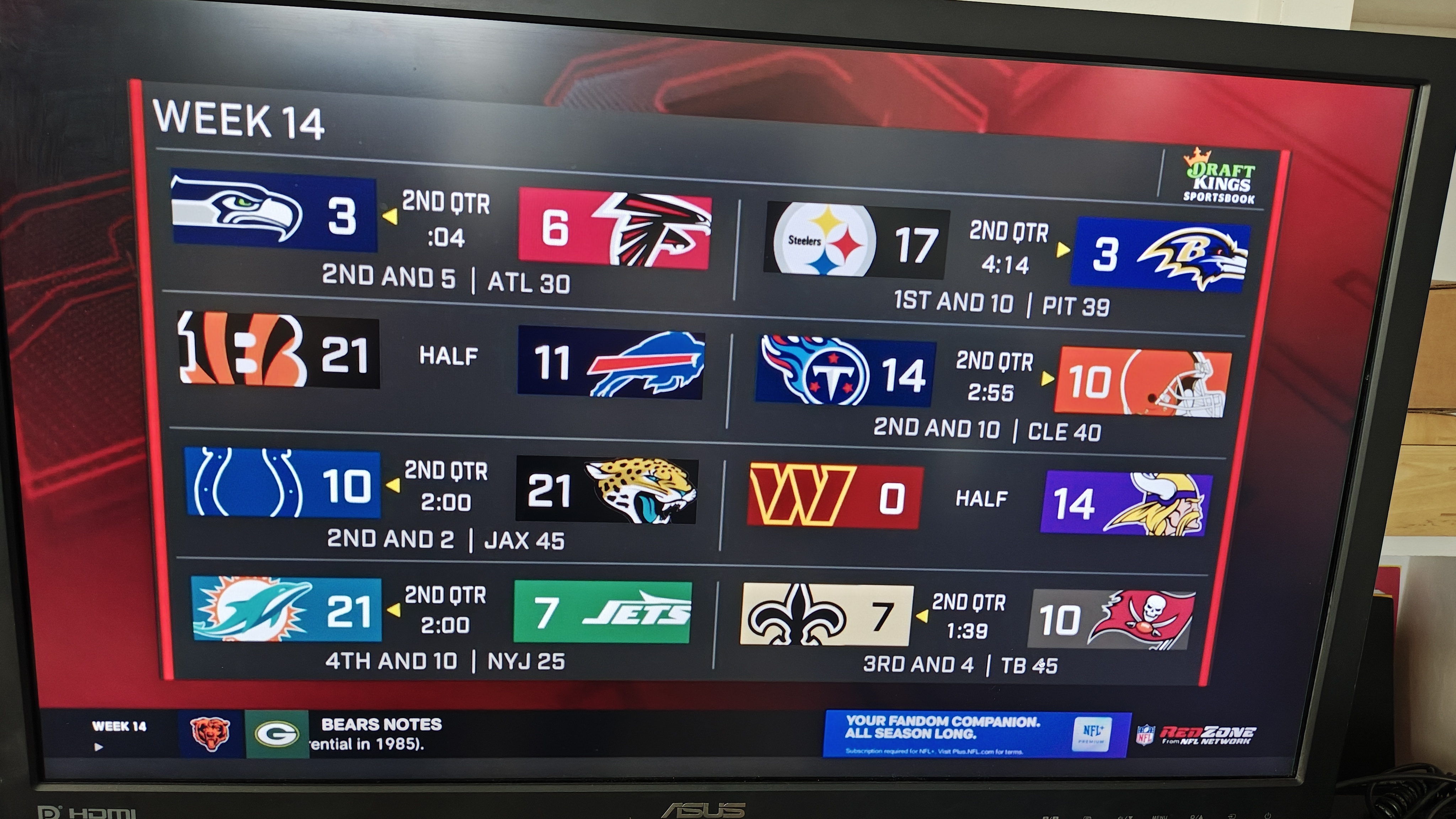 The photograph depicts a television screen displaying a live sports broadcast of an NFL game during Week 14. The screen shows the scores and play-by-play updates for several teams, including the Seattle Seahawks (3), Atlanta Falcons (6), Pittsburgh Steelers (17), Baltimore Ravens (3), Cincinnati Bengals (21), Buffalo Bills (11), Tennessee Titans (14), Cleveland Browns (10), Jacksonville Jaguars (10), Washington Commanders (0), Minnesota Vikings (14), Miami Dolphins (21), and Tampa Bay Buccaneers (7). The game is in the second quarter with various plays and downs indicated. The screen also features logos for DraftKings Sportsbook and RedZone, along with a note about Bears notes from 1985. The overall mood is competitive and dynamic, with vibrant team colors and detailed game information.