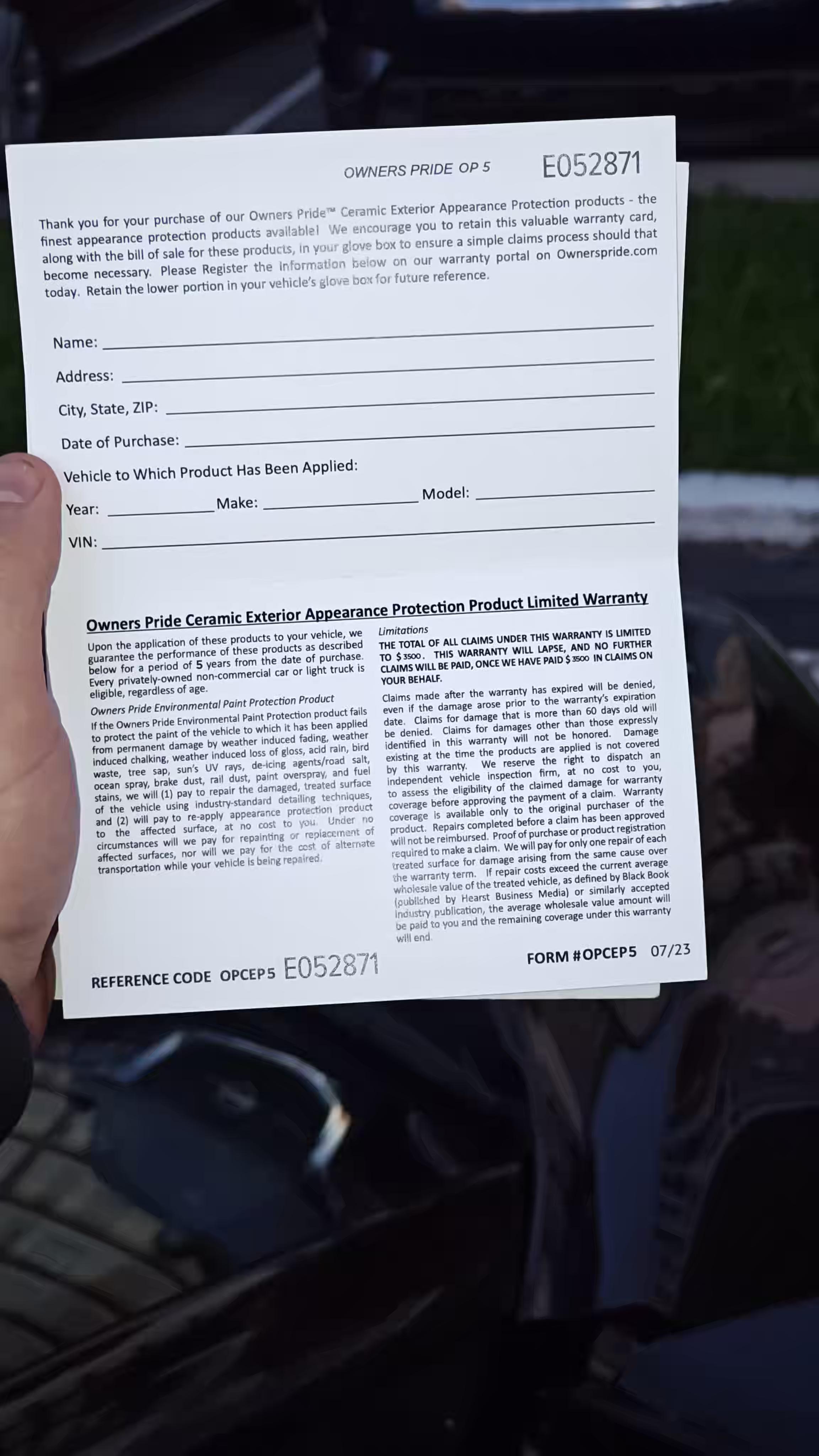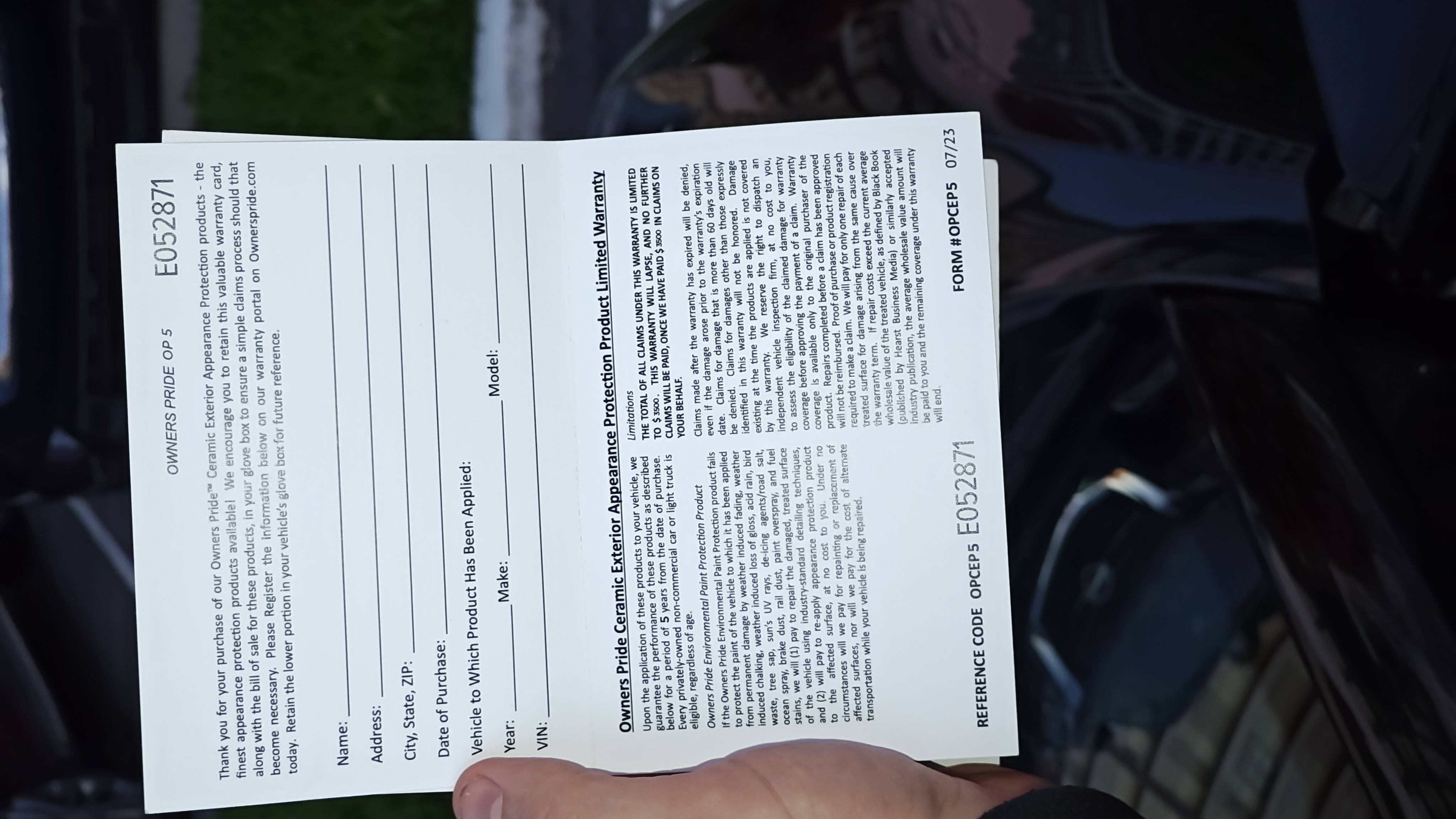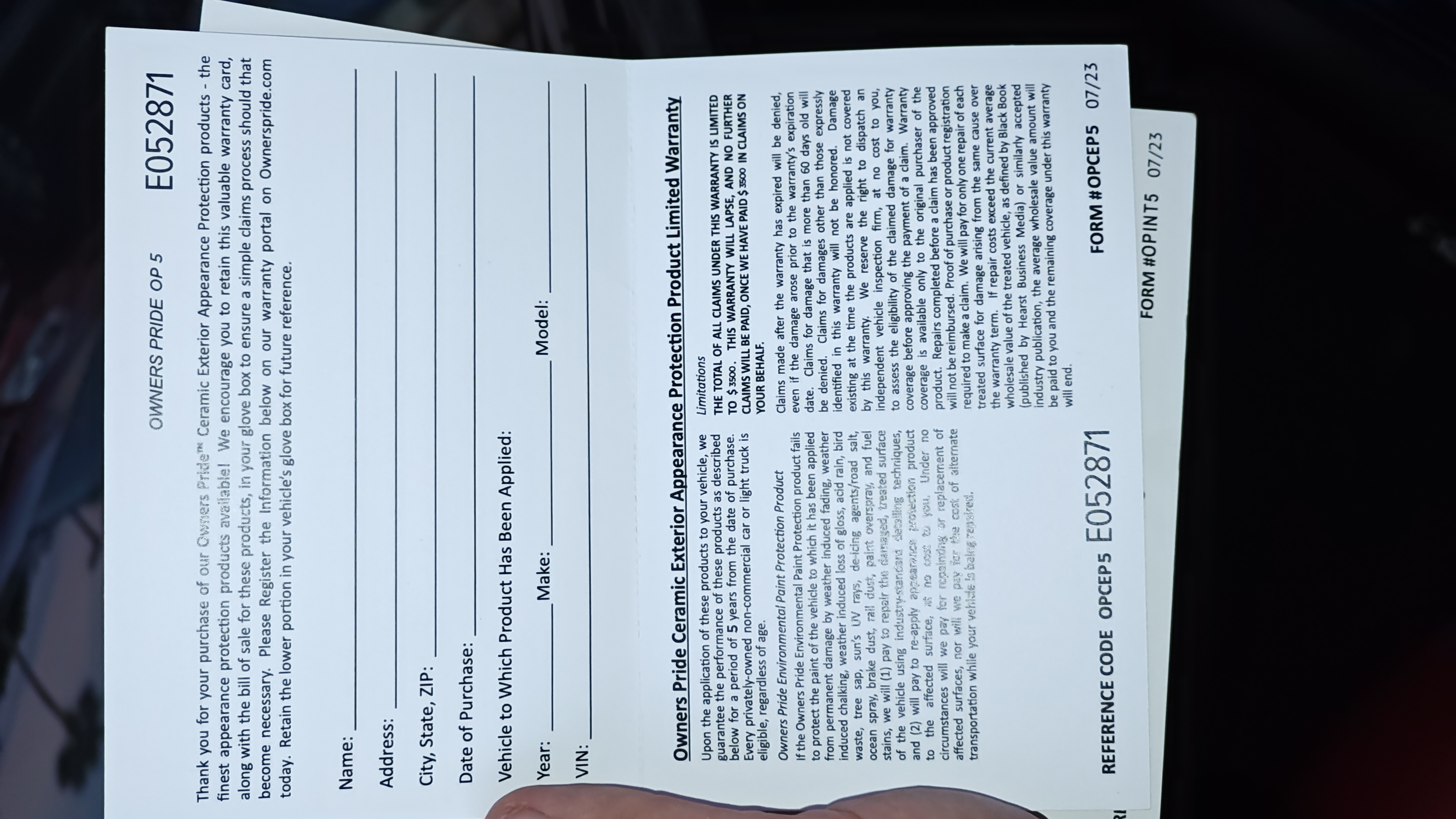 The photograph shows a document titled "OWNERS PRIDE OP 05" with the reference code E052871. The document appears to be a warranty agreement for Owners Pride Ceramic Exterior Appearance Protection products. It is dated 07/23 and includes a form number #OPINT5. The text on the document is printed in black ink on white paper, with some sections highlighted in blue. The document outlines the terms of the warranty, including the conditions under which the warranty applies and the limitations of the warranty. There is also a section detailing the process for registering the product and obtaining a claim. The overall mood of the document is formal and informative, aimed at providing clarity on the warranty coverage and procedures for customers.