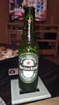 The photograph depicts a close-up of a green Heineken beer bottle held by someone's hand. The bottle is partially open, with condensation droplets visible on its surface, suggesting it has been chilled. In the background, there is a blurred kitchen setting with various items, including a refrigerator adorned with photos and magnets. A white plastic container with a black lid is also present, possibly containing food or drinks. The overall mood appears casual and relaxed, with a focus on the chilled beer bottle as the main subject. The colors are predominantly green from the bottle, white from the plastic container, and neutral tones from the kitchen background.