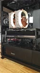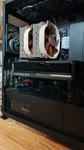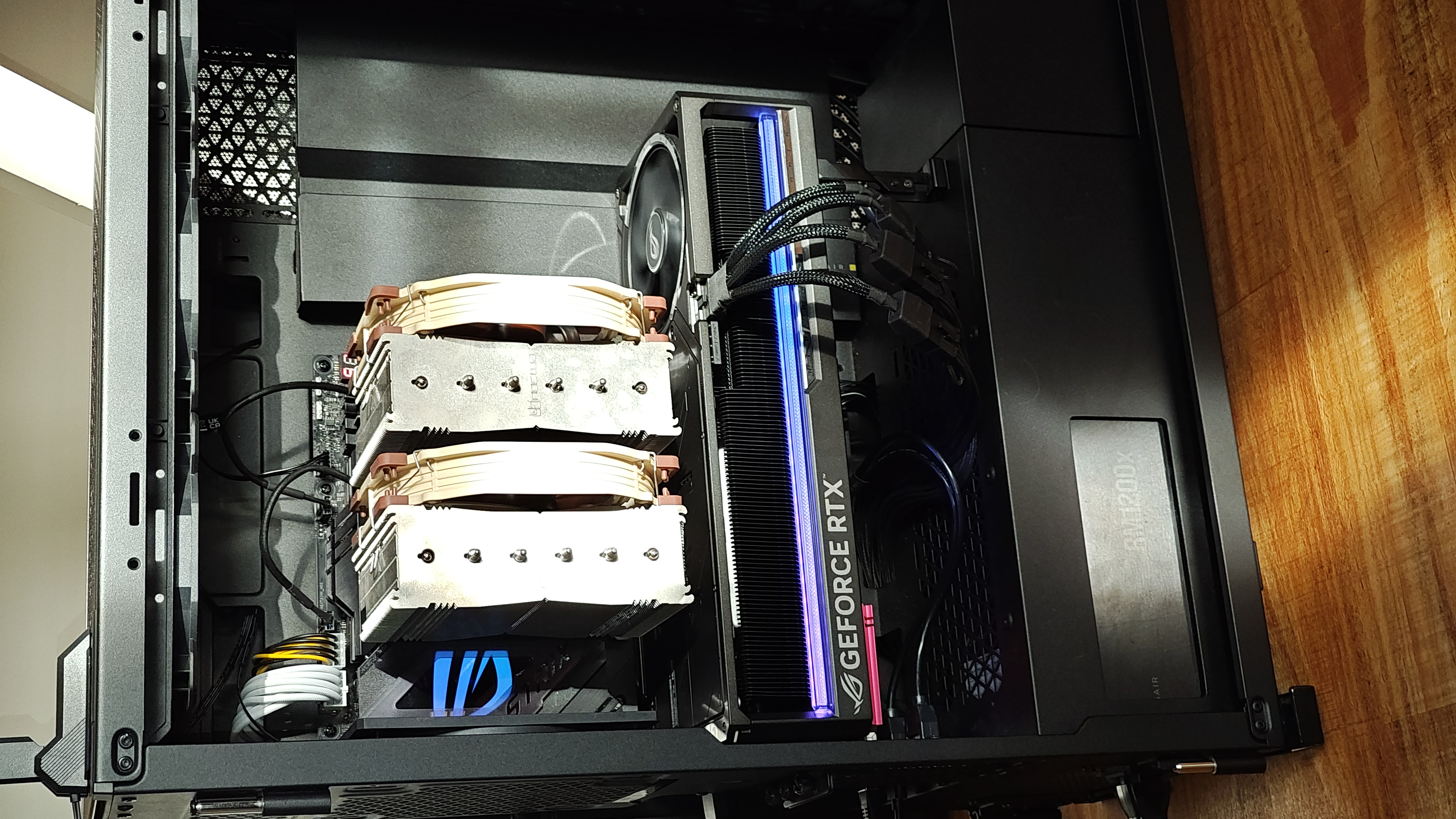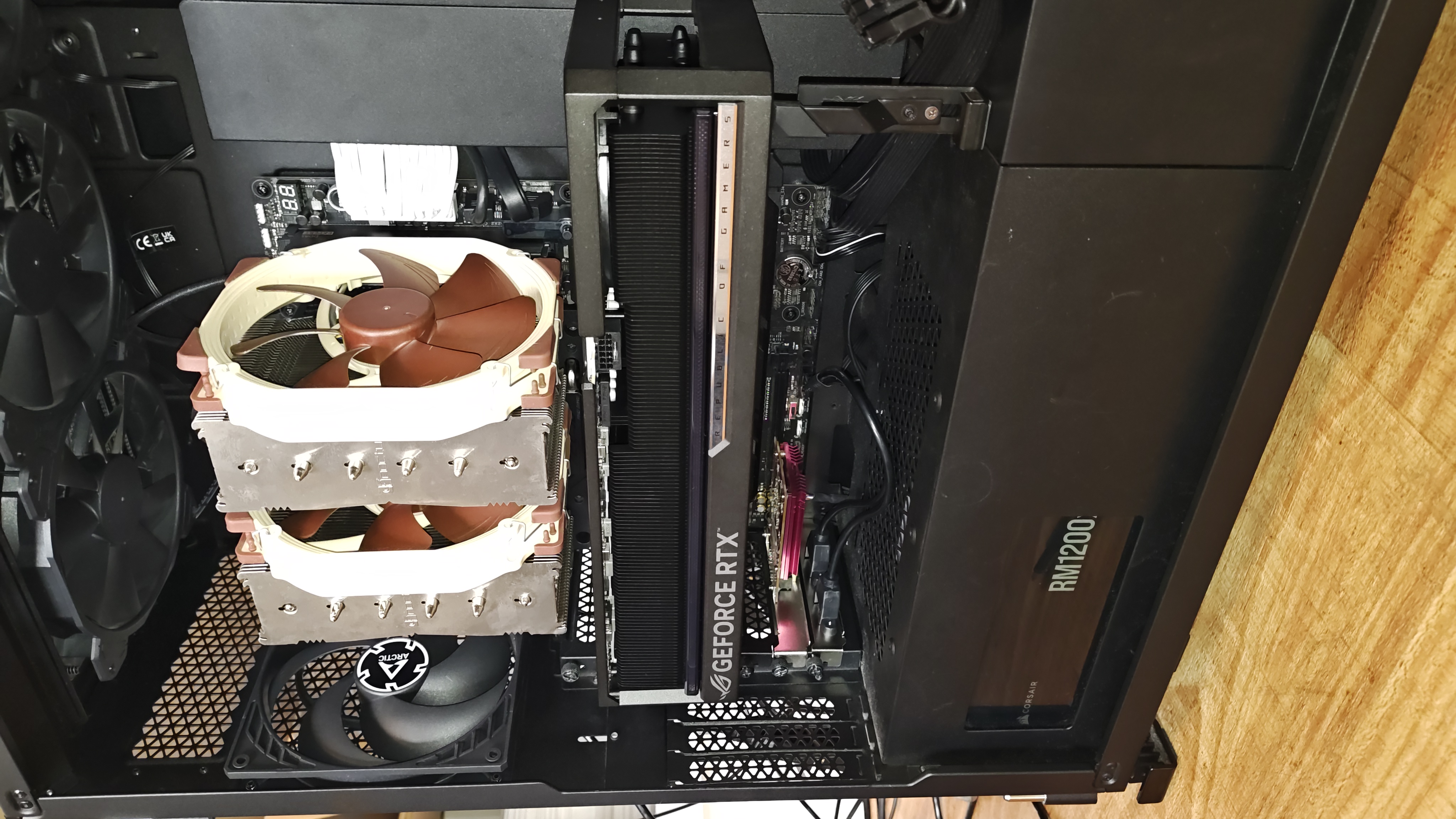 The photograph depicts the interior of an open computer case, showcasing its intricate components. The central focus is on a high-end graphics card labeled "GeForce RTX," which is prominently displayed with its cooling system visible. Surrounding the graphics card are various cables and components, including a hard drive and RAM modules. The case is placed on a wooden surface, likely a desk or table, with natural light illuminating the scene from the left side. The overall mood is technical and detailed, highlighting the complexity and engineering of modern computer hardware.