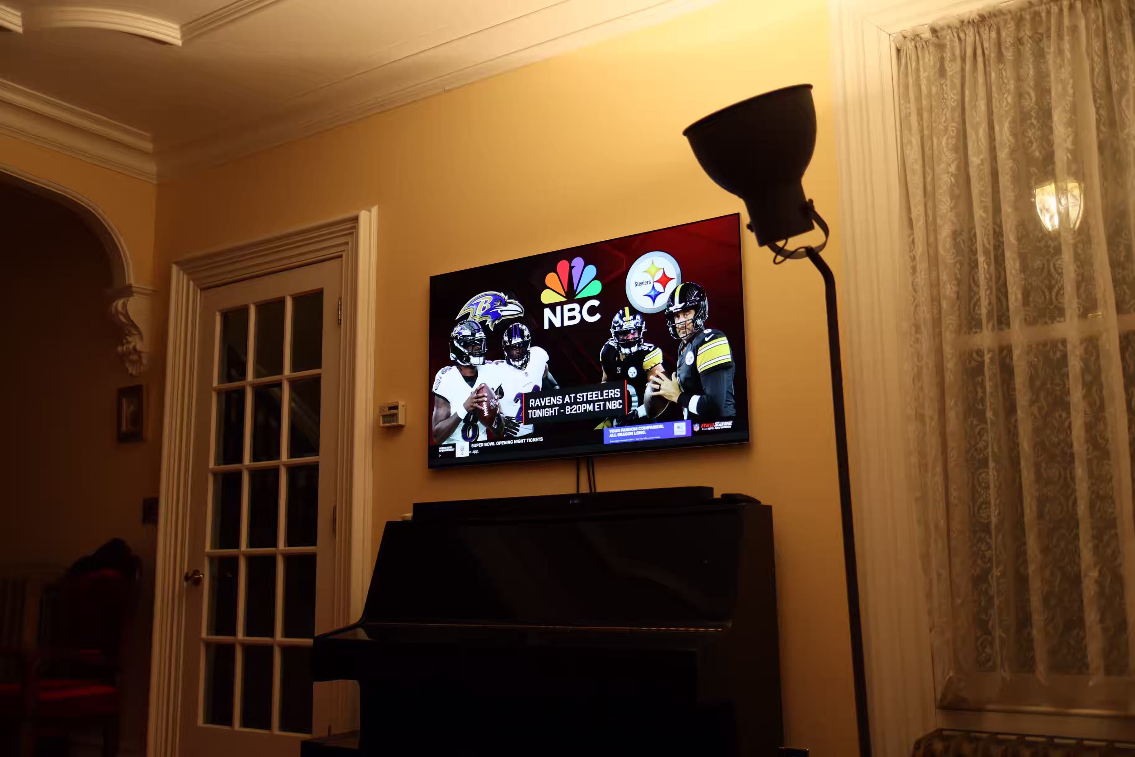 The photograph depicts a cozy living room with warm, yellowish walls and a white ceiling. A large flat-screen TV is mounted on the wall, displaying a sports broadcast featuring the Baltimore Ravens and Pittsburgh Steelers. The TV screen shows the NBC logo prominently at the top, along with images of the two teams' players. Below the logos, text indicates that the game is scheduled to air tonight at 8:20 PM ET on NBC. In front of the TV, there is a black piano, partially visible in the foreground. To the right of the TV, a tall floor lamp with a black shade stands, casting a soft light into the room. The overall mood of the image is relaxed and inviting, with a focus on the anticipation of the upcoming game.