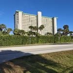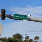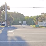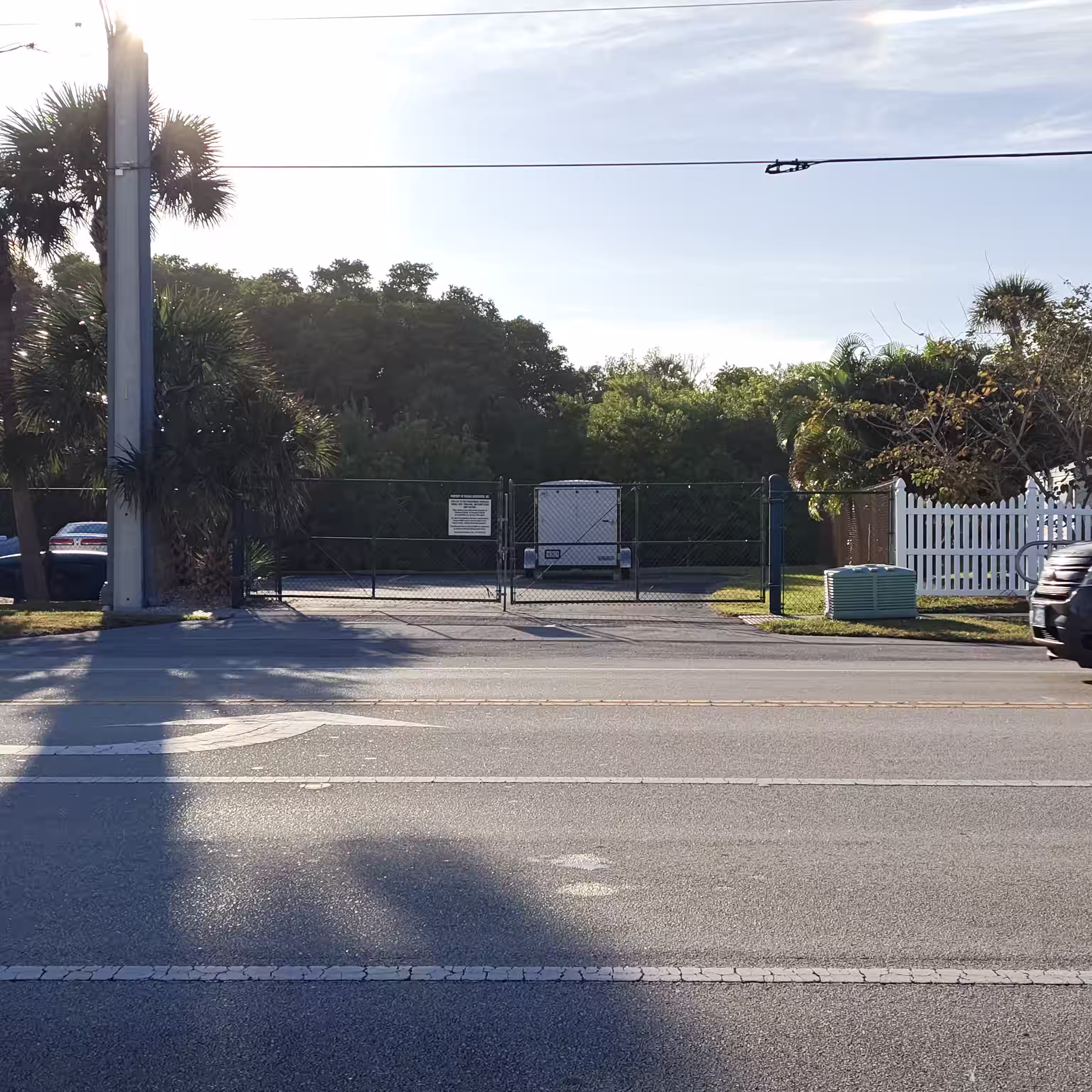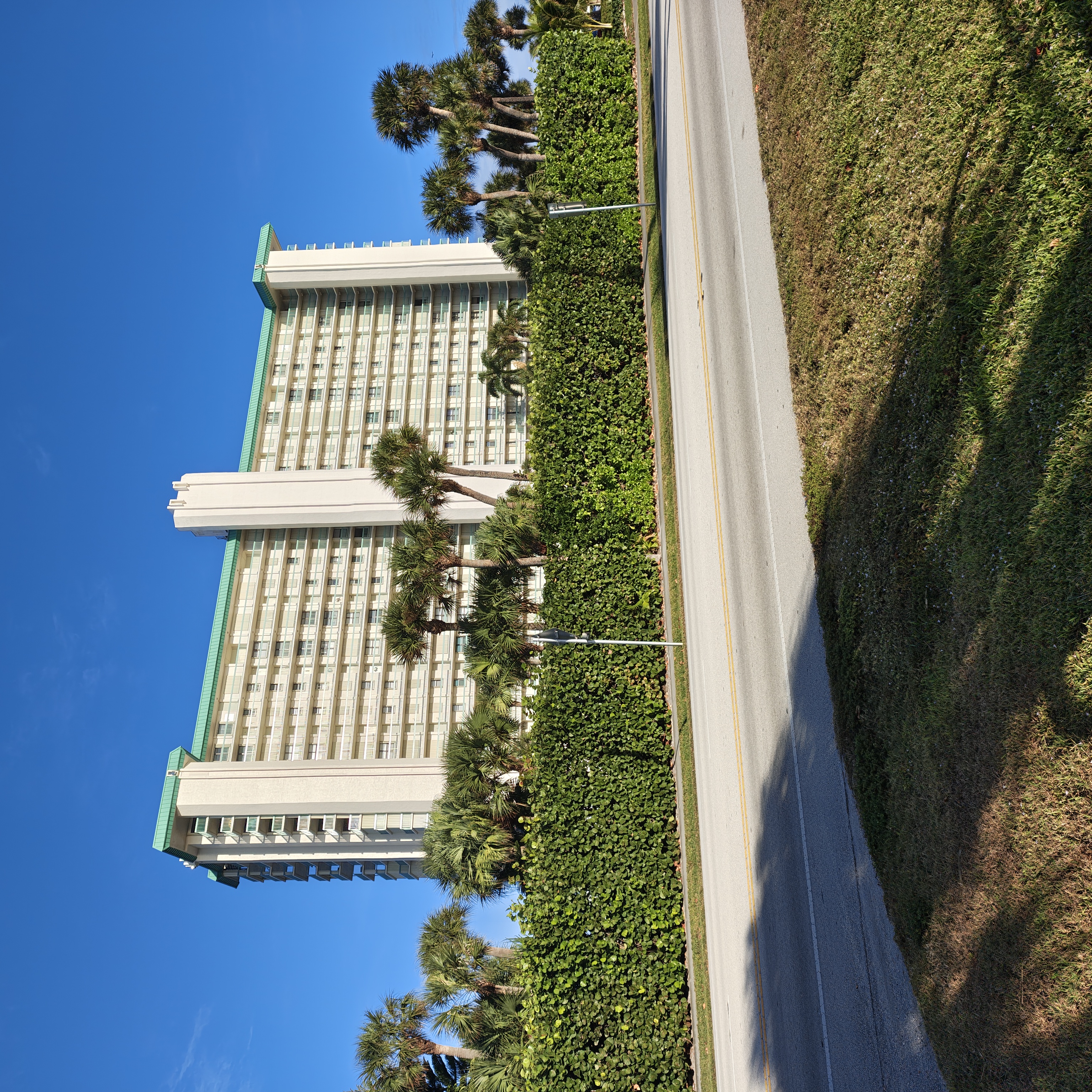 The photograph depicts a sunny day at an intersection with clear blue skies and a few wispy clouds. The scene is set in a suburban area with palm trees lining the street, indicating a warm climate. The road curves gently to the right, and there are several traffic signs and a stop sign visible. The pavement appears well-maintained, with white lines marking the lanes. On the right side of the image, there's a sidewalk made of bricks, and a street sign with the number "9900" is visible. The overall mood is calm and serene, with the bright sunlight casting shadows on the ground.