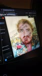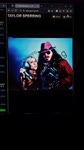 The photograph shows a computer screen displaying an image of Taylor Sperring, a person with blonde hair and green eyes. The background features a colorful, abstract design with various shapes and patterns. The text "Taylor Sperring" is prominently displayed on the left side of the image. The overall mood appears to be casual and artistic, with a focus on the individual's identity and the vibrant, eclectic background. The colors are bright and varied, contributing to a lively and engaging visual presentation.