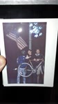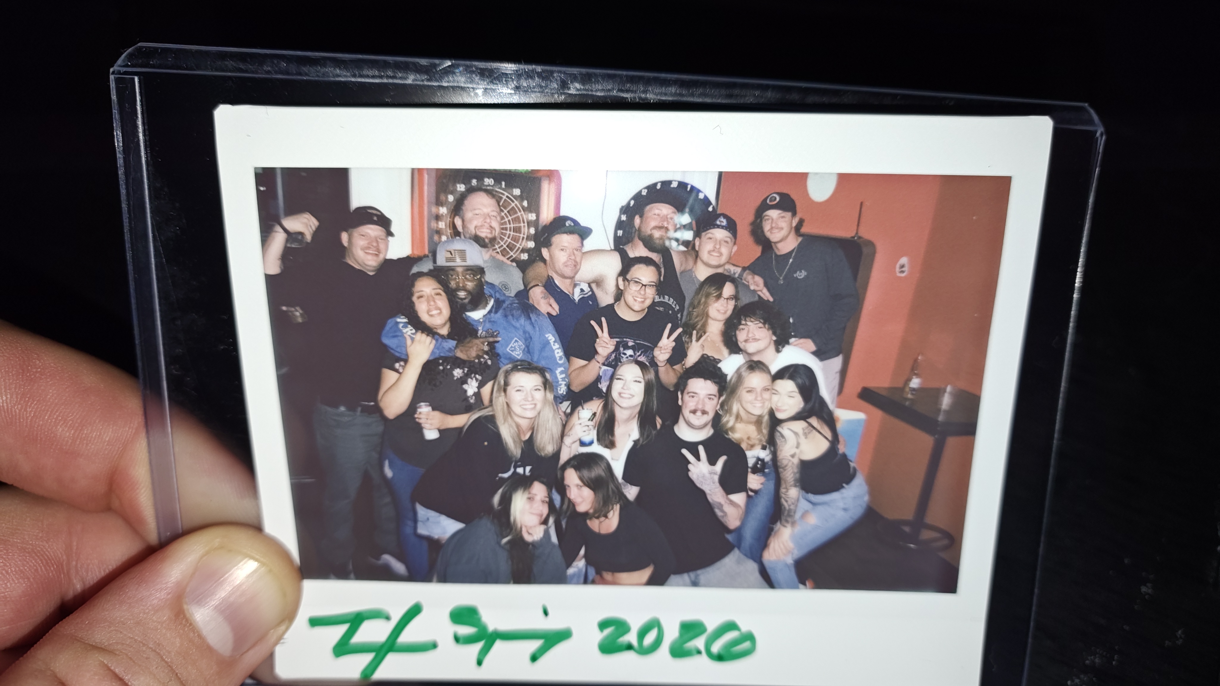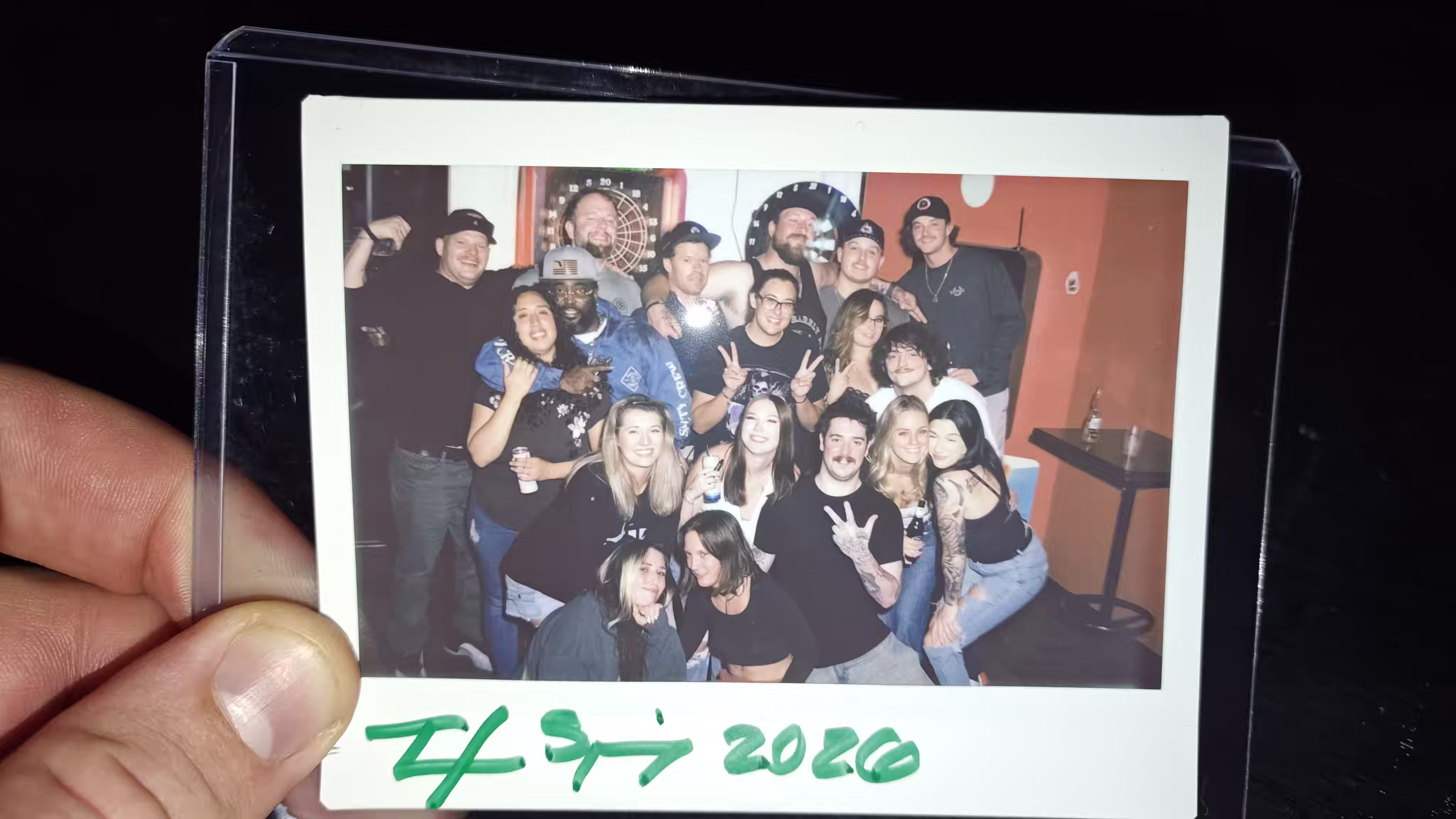 The photograph is a Polaroid-style image featuring a group of people posing together in what appears to be a casual indoor setting, possibly a bar or a social gathering area. The background includes a dartboard on the wall, suggesting a recreational environment. The group consists of both men and women, with some wearing hats and others in casual attire. The mood seems relaxed and friendly, with many individuals making peace signs. The colors are vibrant, with a mix of dark clothing and colorful accessories. Notable objects include the Polaroid frame, the dartboard, and a small table with bottles, indicating a social event. The date "2020" is written in green marker at the bottom of the photo, adding a personal touch to the image.