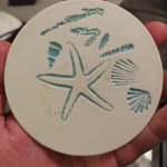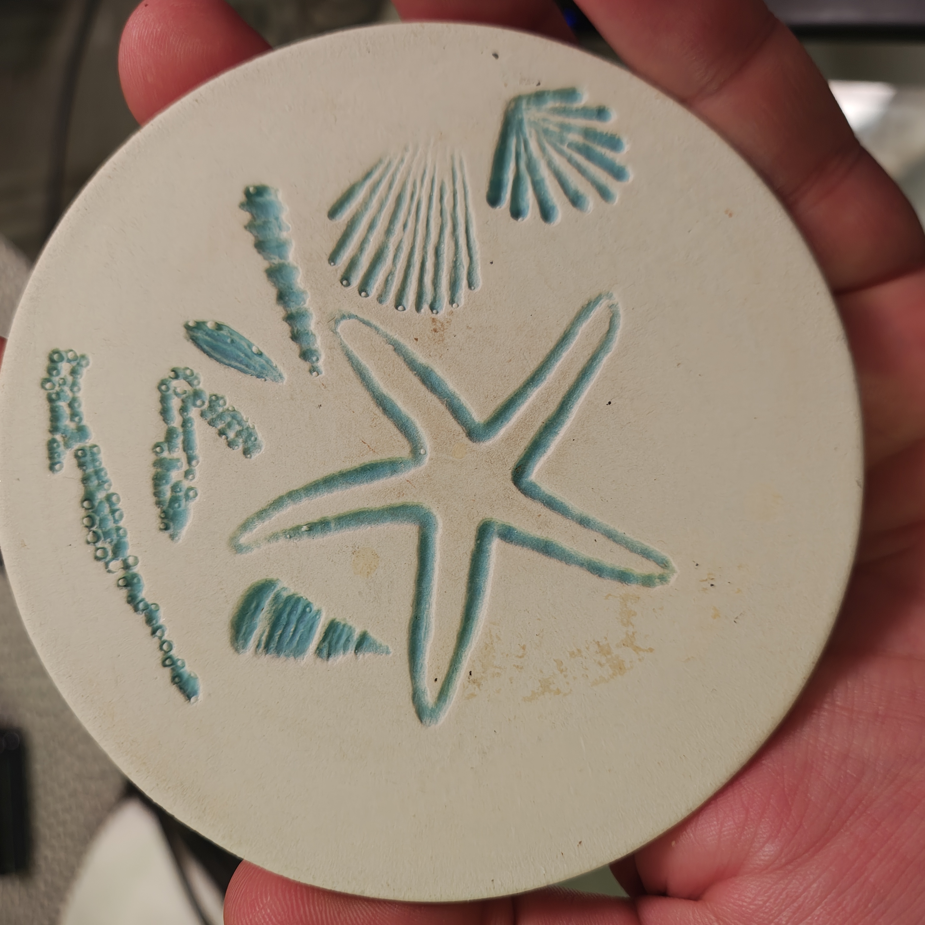 The photograph shows a close-up of a hand holding a circular ceramic object with a textured surface. The object features an intricate design of a starfish, depicted in a light blue color, surrounded by various patterns that resemble seaweed or coral. The background is slightly blurred, suggesting an indoor setting with some furniture visible. The overall mood of the image is calm and artistic, focusing on the detailed craftsmanship of the ceramic piece. The colors are soft and natural, with the light blue of the starfish contrasting against the off-white background of the ceramic.