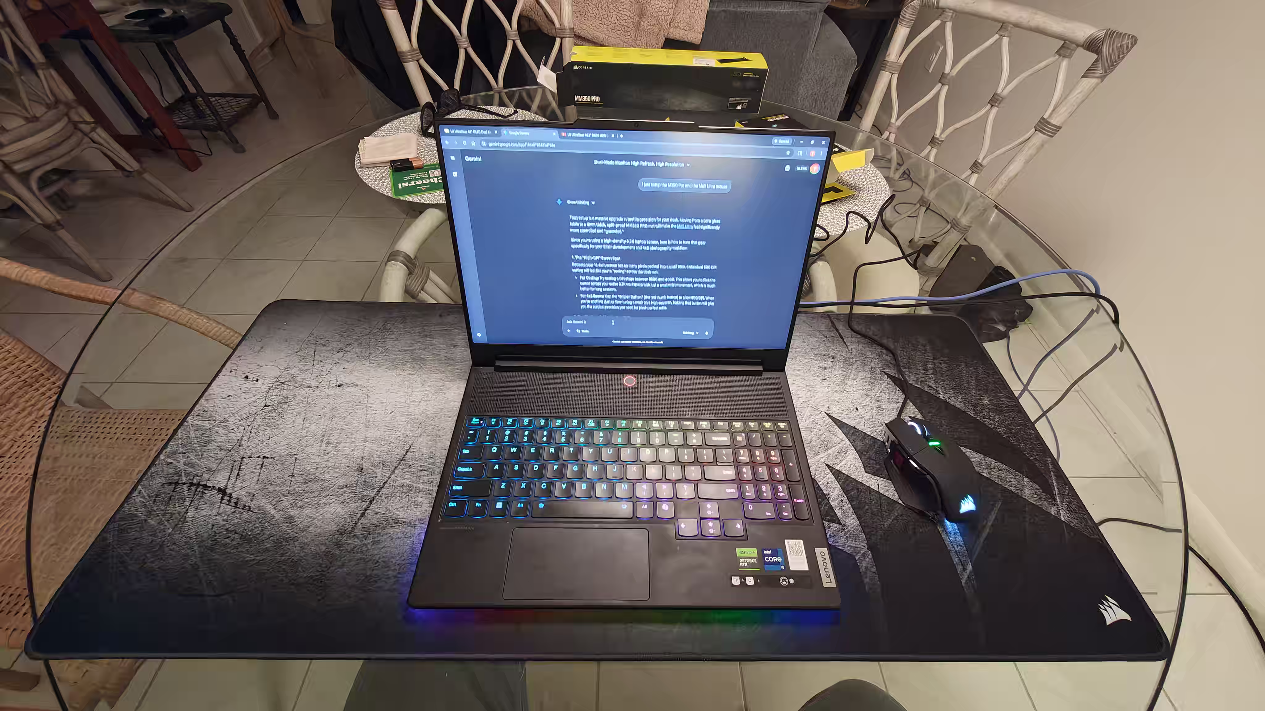 The photograph captures a cozy indoor setting, likely in Florida, United States, with a clear view of a round glass table. On the table sits an open laptop displaying a webpage with a blue background and white text, accompanied by a gaming mouse with illuminated buttons. The laptop is placed on a large, dark-colored mousepad that has visible wear and tear, suggesting frequent use. In the background, there are chairs with woven backs and a small box on the table, adding to the casual, lived-in atmosphere of the space. The overall mood is relaxed and focused, typical of someone working or gaming at home.