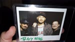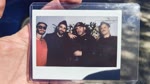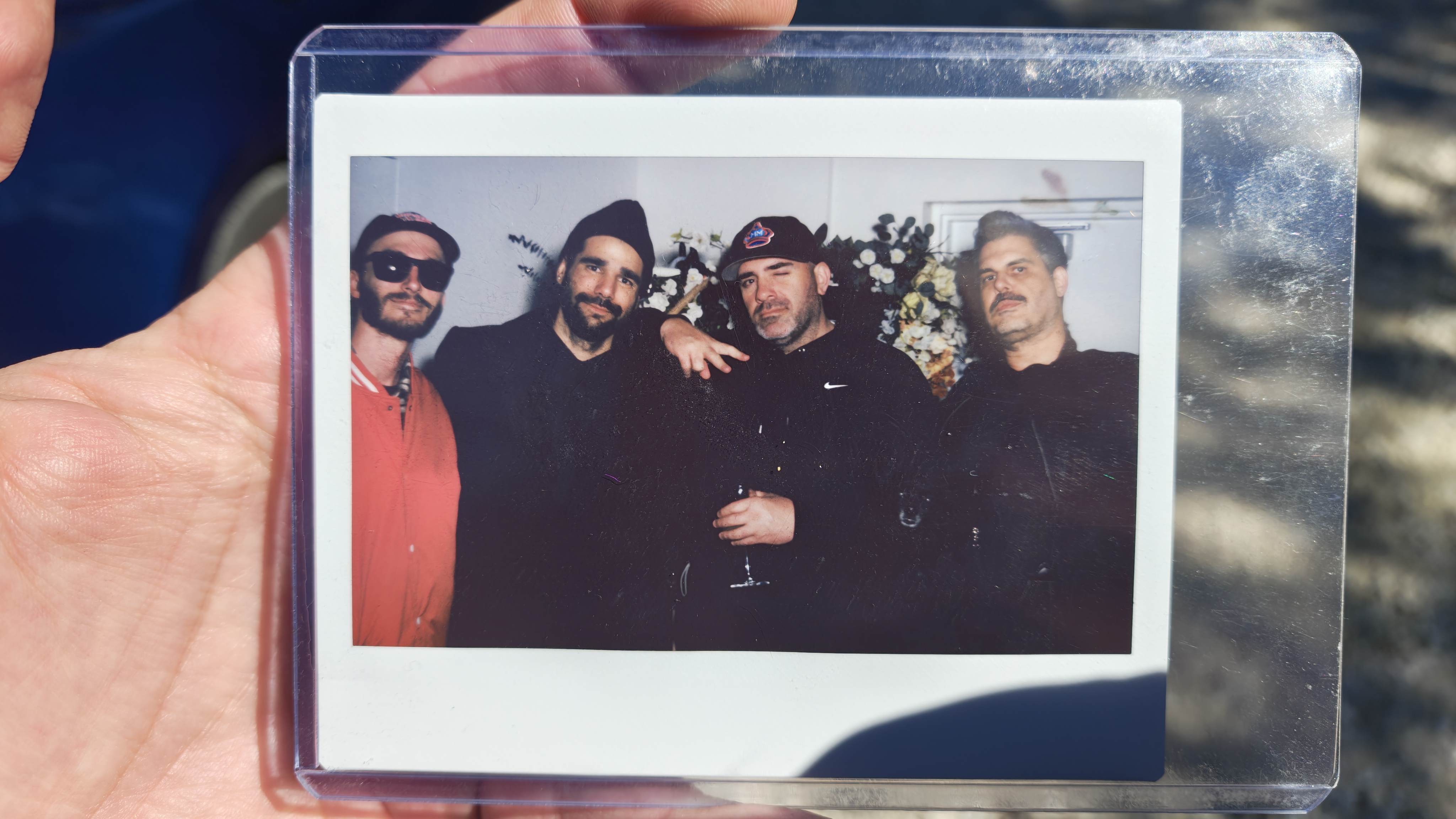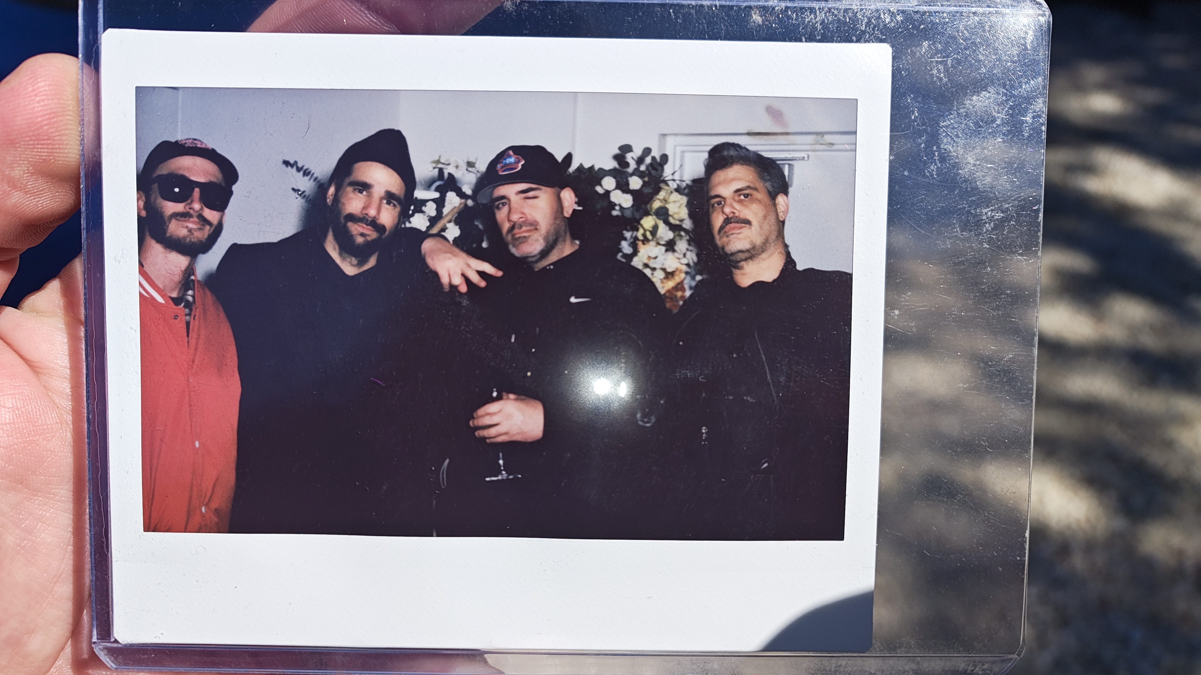 The photograph depicts four men standing closely together, likely posing for a casual, informal group shot. The setting appears to be indoors, possibly in a room with a floral arrangement in the background, suggesting a celebratory or social event. The mood is relaxed and friendly, with the men dressed in casual attire, including jackets and hats. The colors are muted, with dark clothing and a soft, diffused light that gives the image a vintage or nostalgic feel. Notable objects include the clear plastic frame holding the photograph and the floral arrangement in the background, which adds a touch of color and context to the scene.