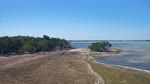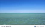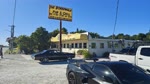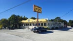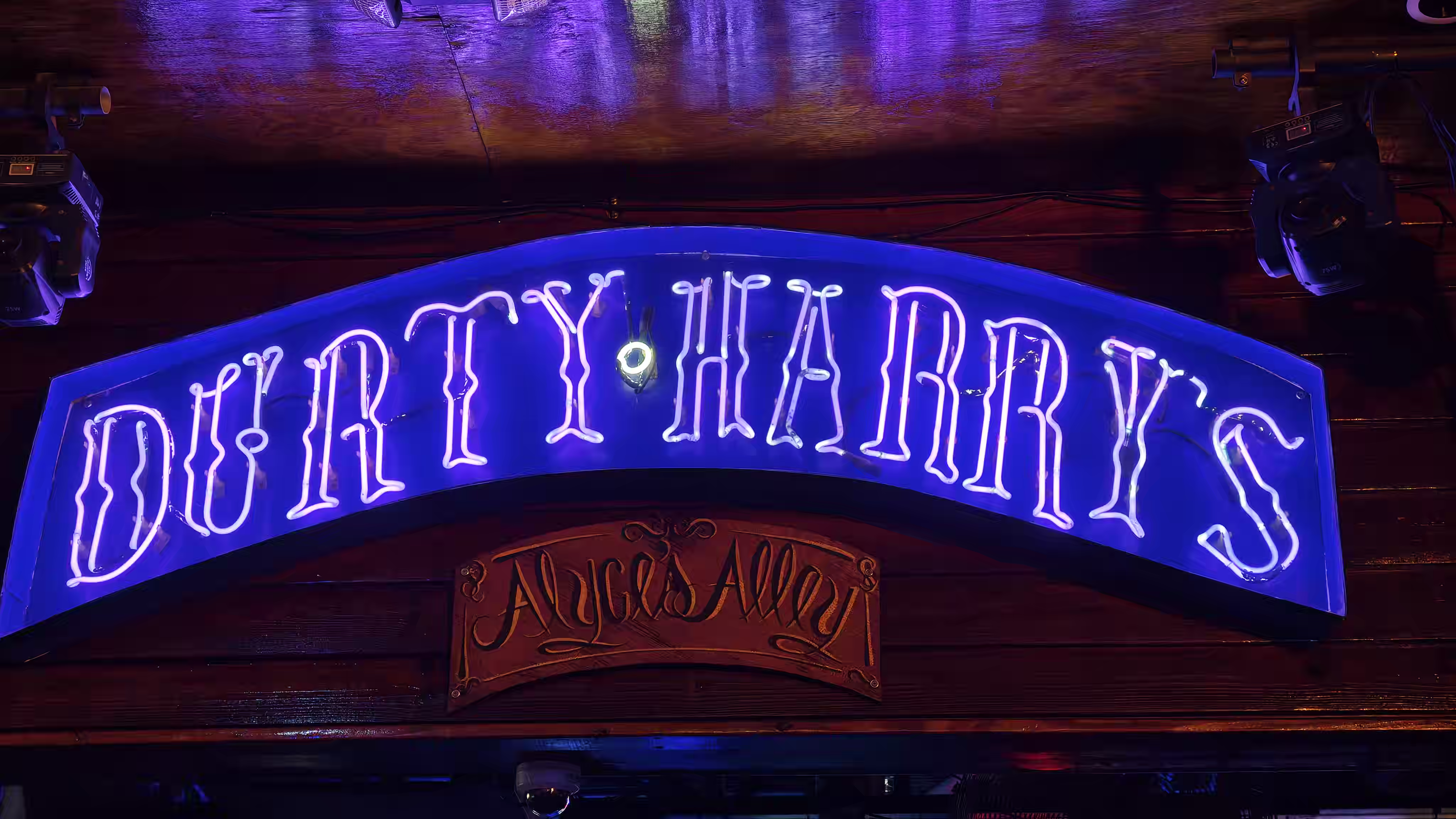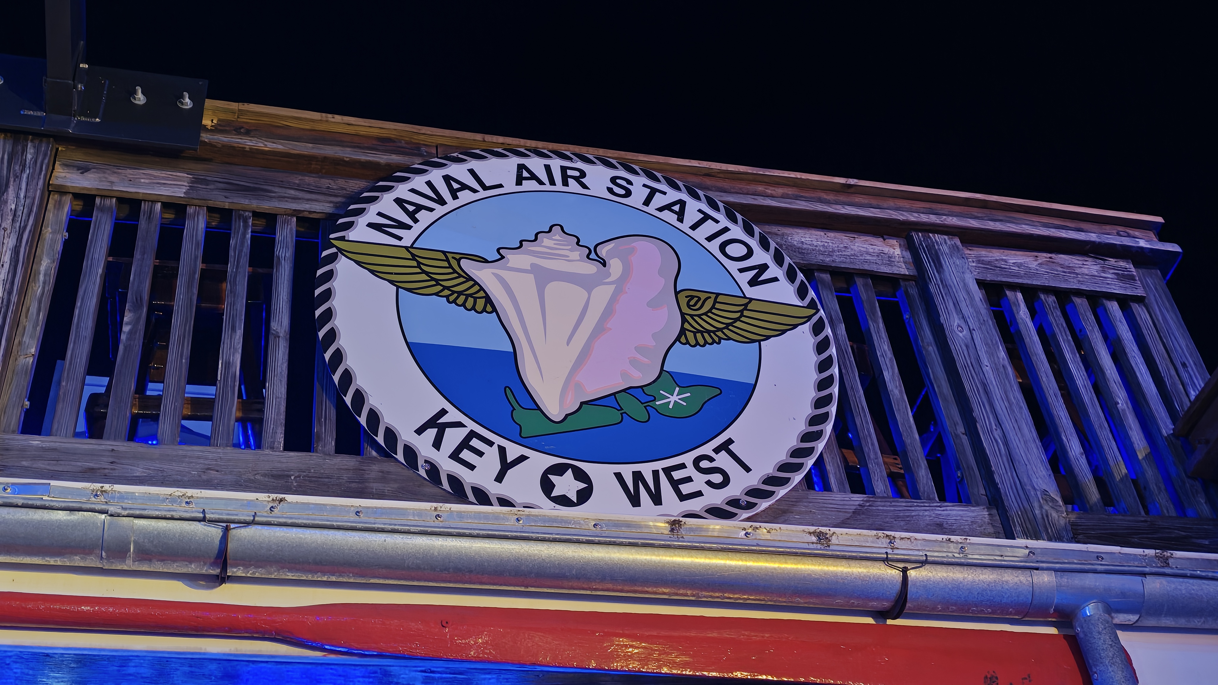 The photograph captures the emblem of Naval Air Station Key West, prominently displayed on a wooden signboard against a dark night sky. The sign features a circular design with a blue background, a seashell, and an eagle, symbolizing naval aviation. The text "NAVAL AIR STATION KEY WEST" is clearly visible around the edge of the emblem. The surrounding area appears to be part of a historic district, with wooden buildings and a red awning below the sign, adding to the nostalgic ambiance of the scene. The overall mood is serene and slightly mysterious, enhanced by the nighttime setting and the illuminated sign.