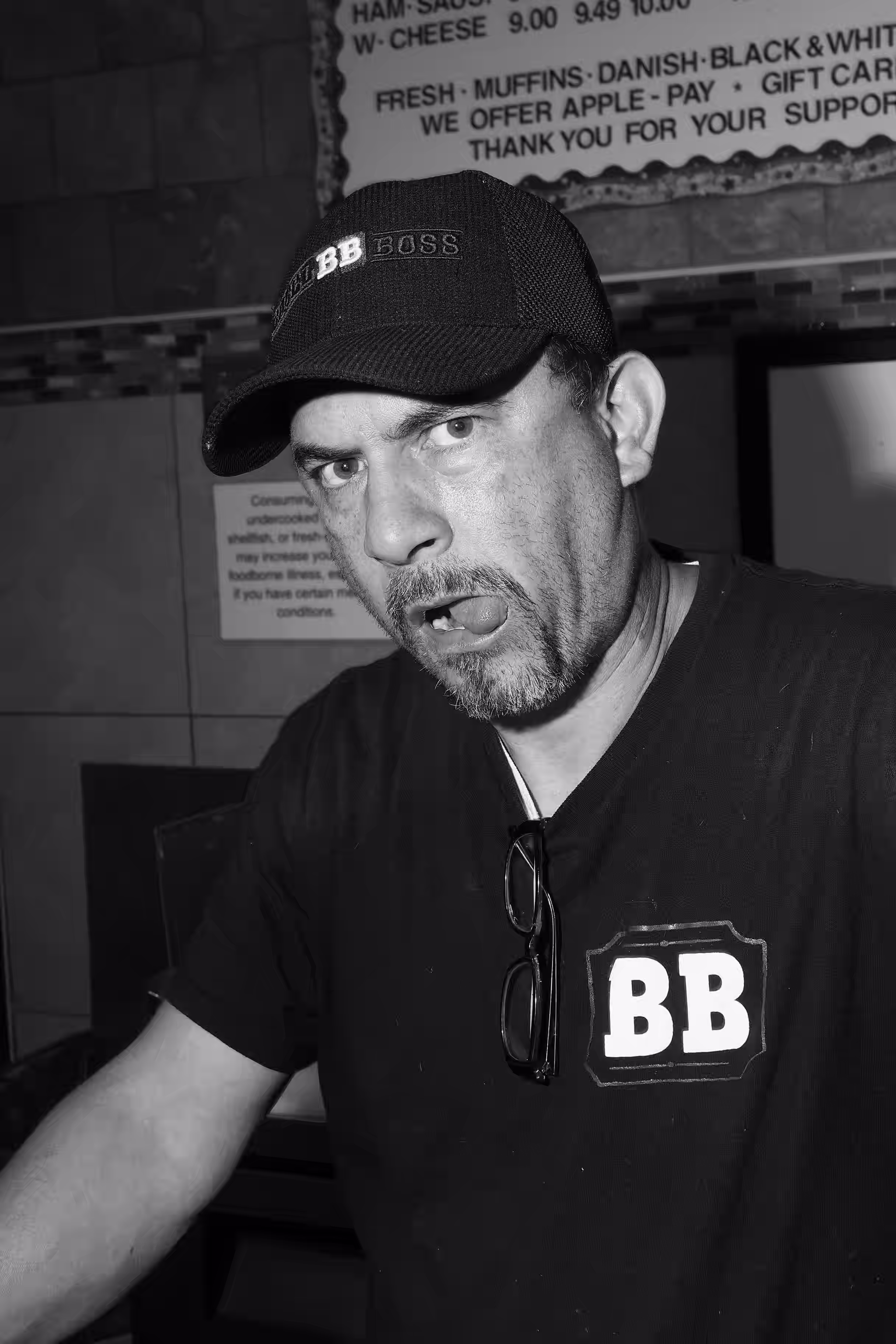 A man wearing glasses with his head tilted to the side stands against an advertisement backdrop featuring food items like muffins and apples. The scene has a casual atmosphere with black-and-white tones adding a vintage feel.