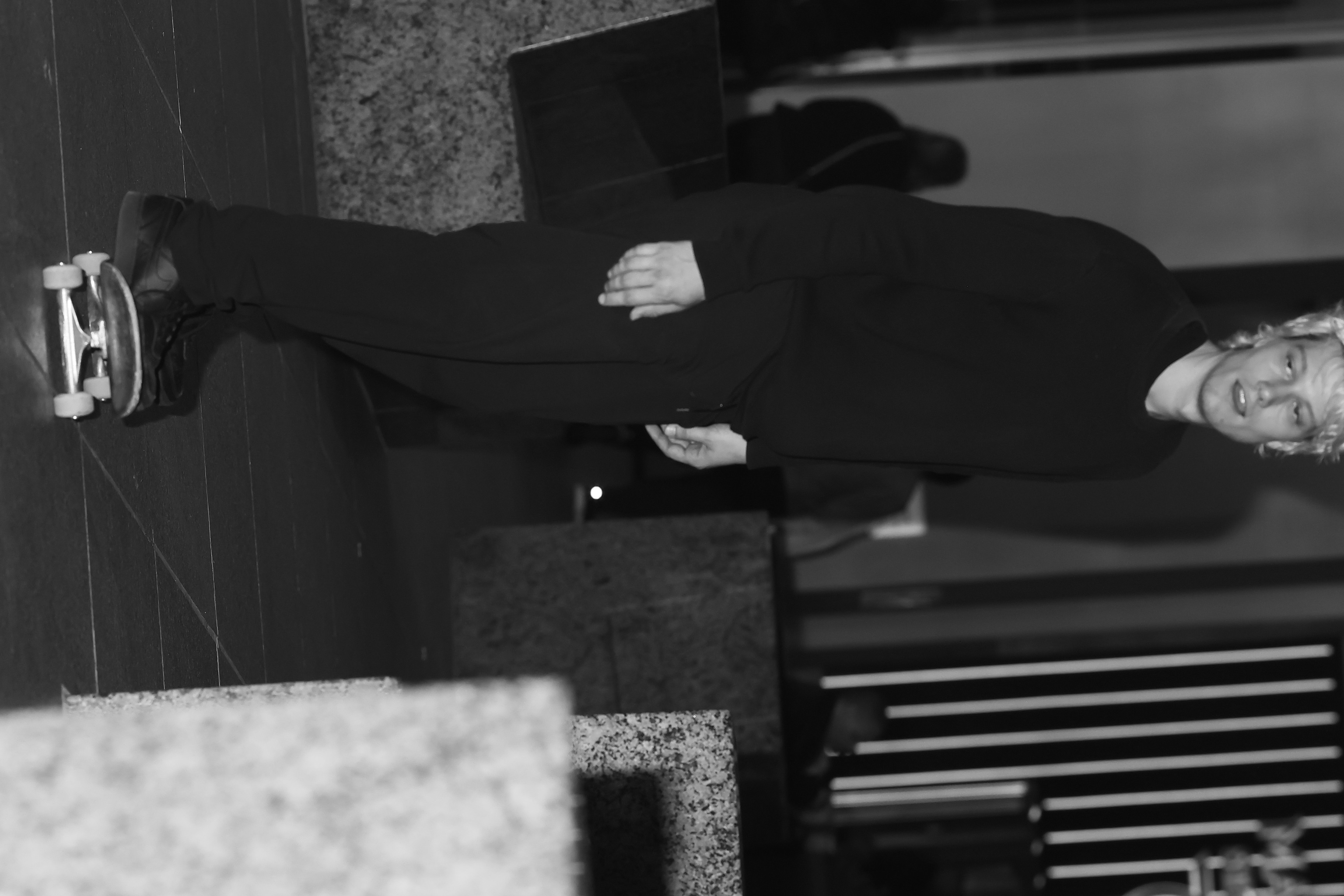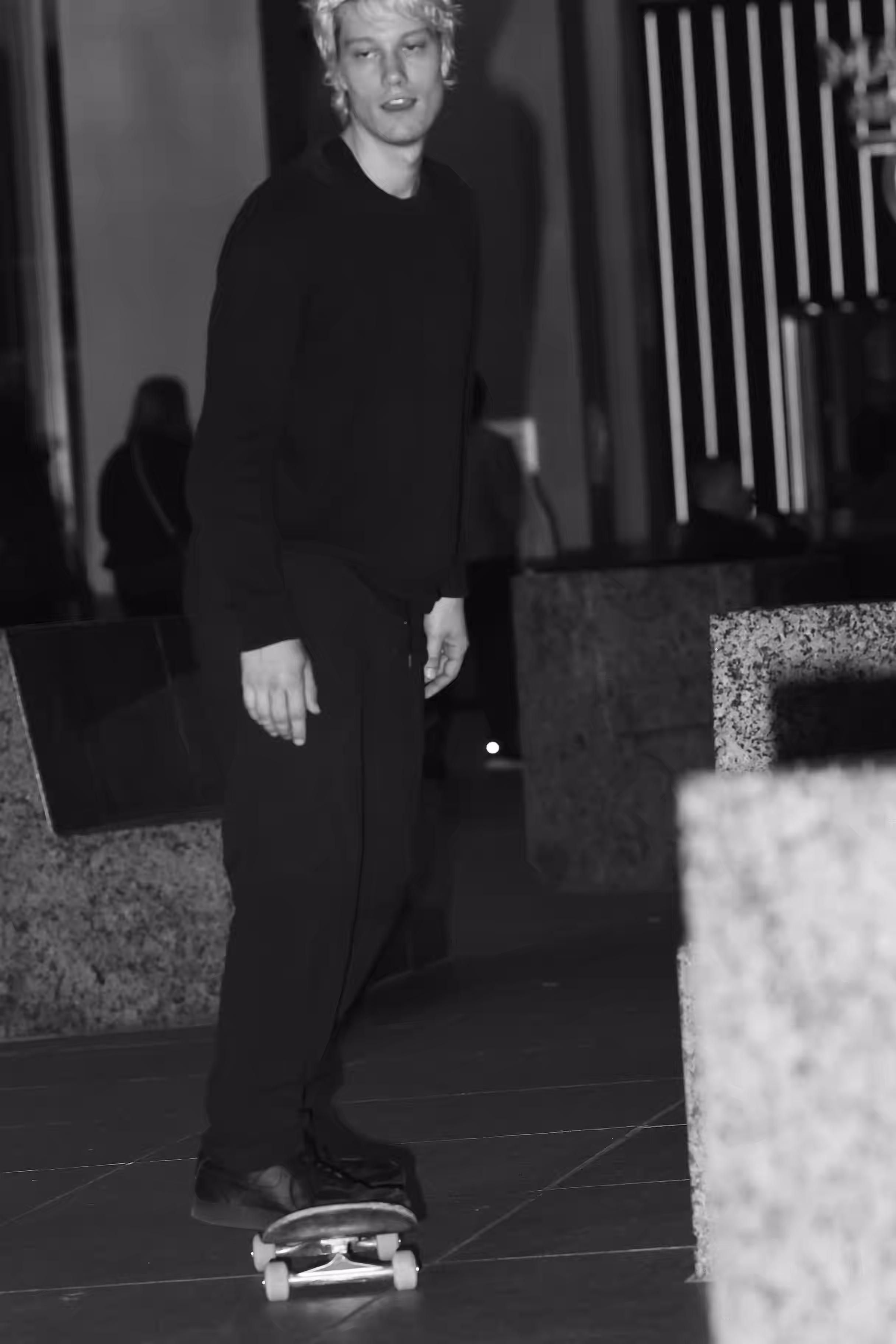 Taylor sits with his friends at night near a streetlight, holding up their Supreme skateboards while another friend films them using an old-fashioned camera. The group appears relaxed but focused as they prepare to hit the streets after a long day indoors.
